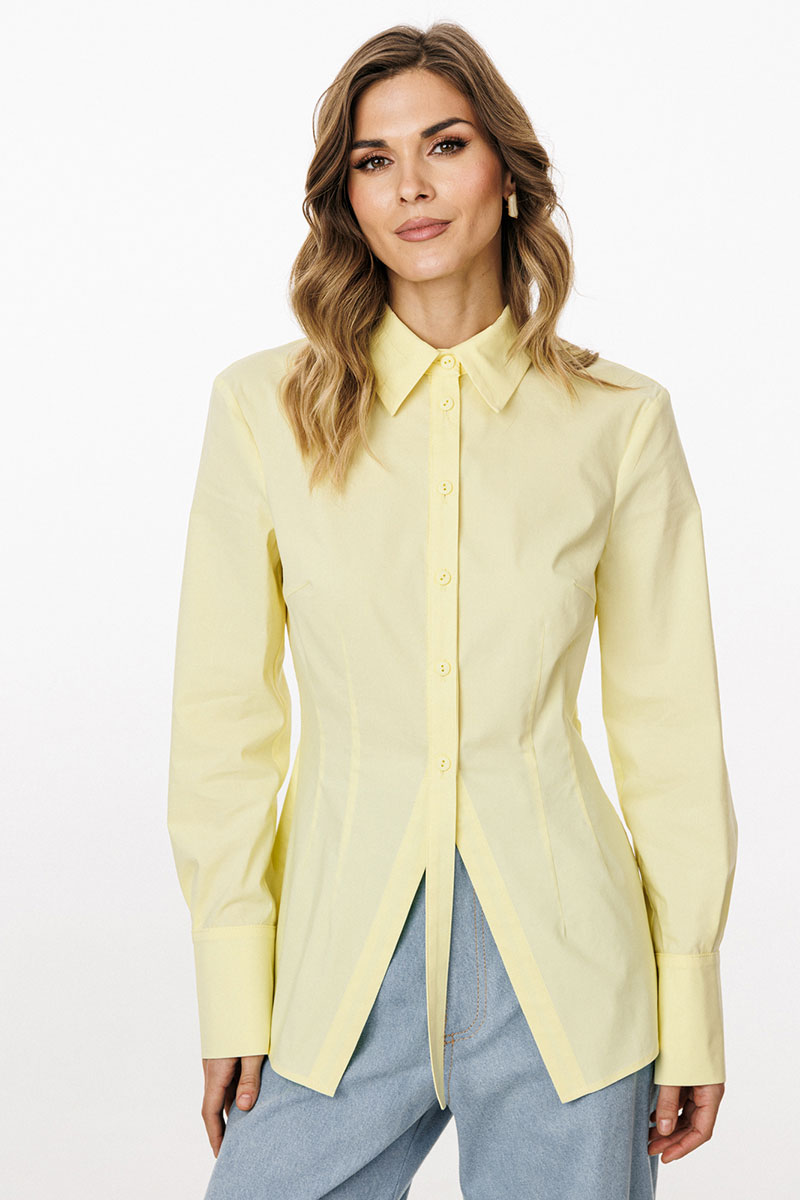 Блузка выполнена из плательно-блузочной ткани. Блузка приталенного силуэта. Длиной до линии бедер. Блузка с плечевыми накладками. По переду обработаны две пары талиевых вытачек,