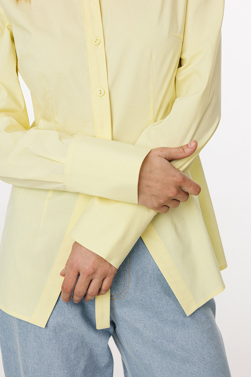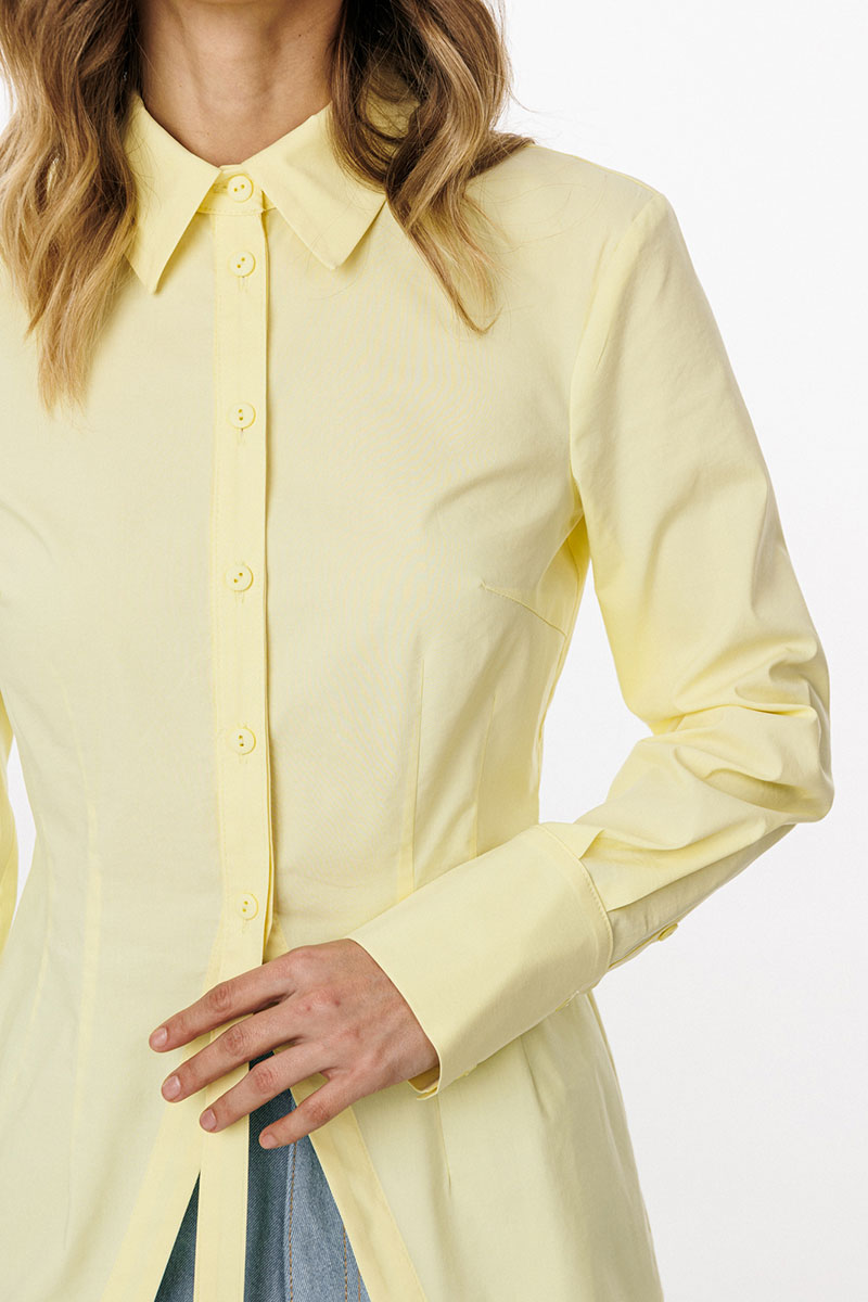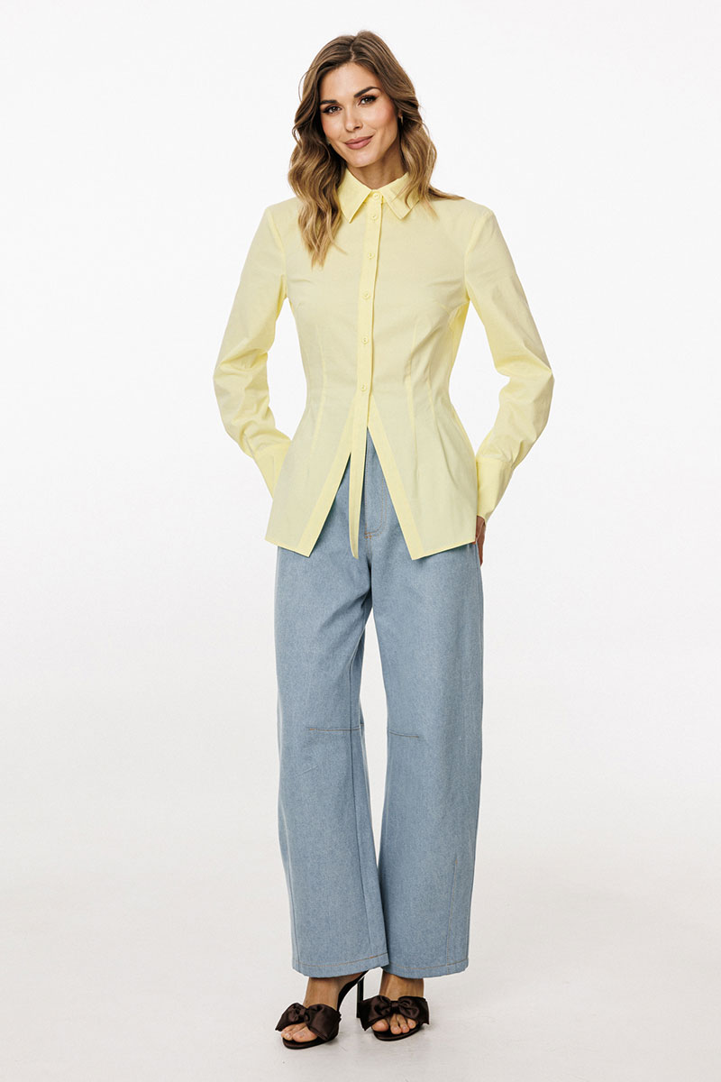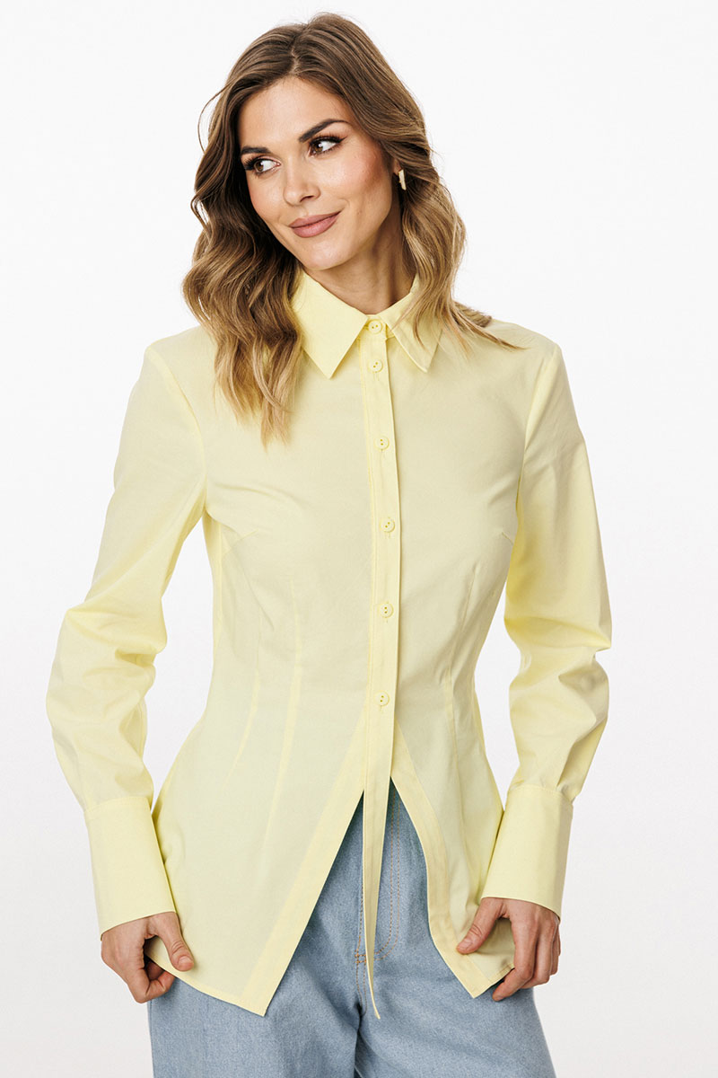 нагрудные вытачки и центральная застежка до верха с планками фигурной формы. Горловина округлой формы, обработана воротником рубашечного типа с отрезной стойкой. Плечевой шов удлинен.