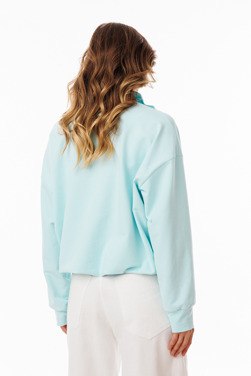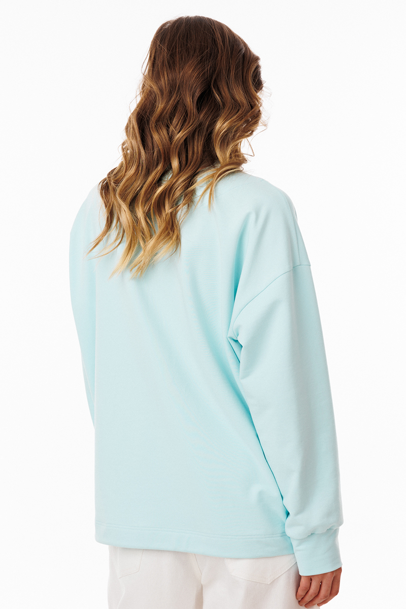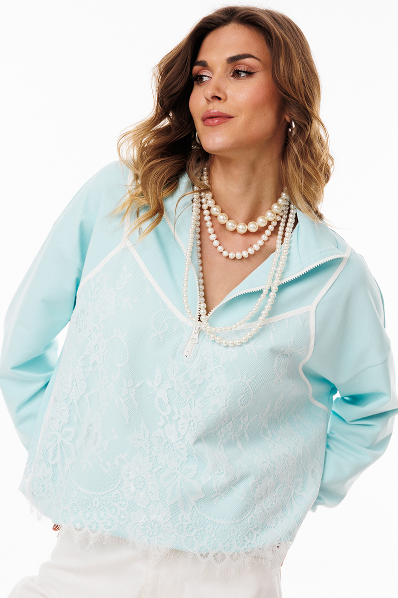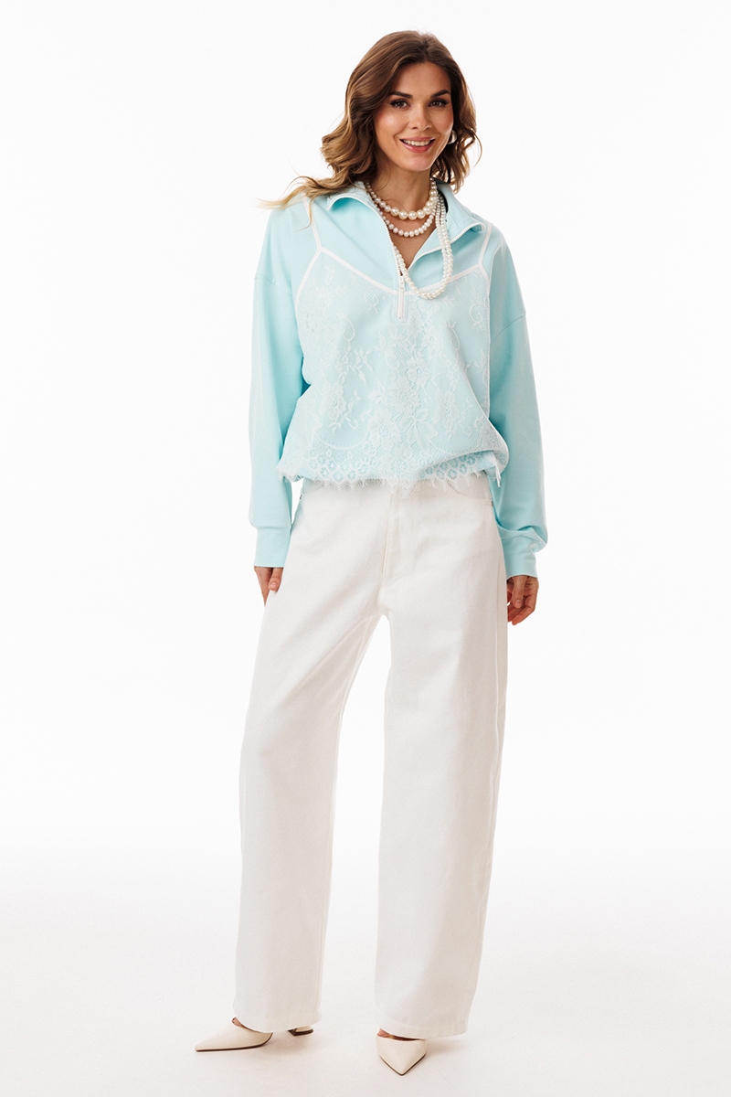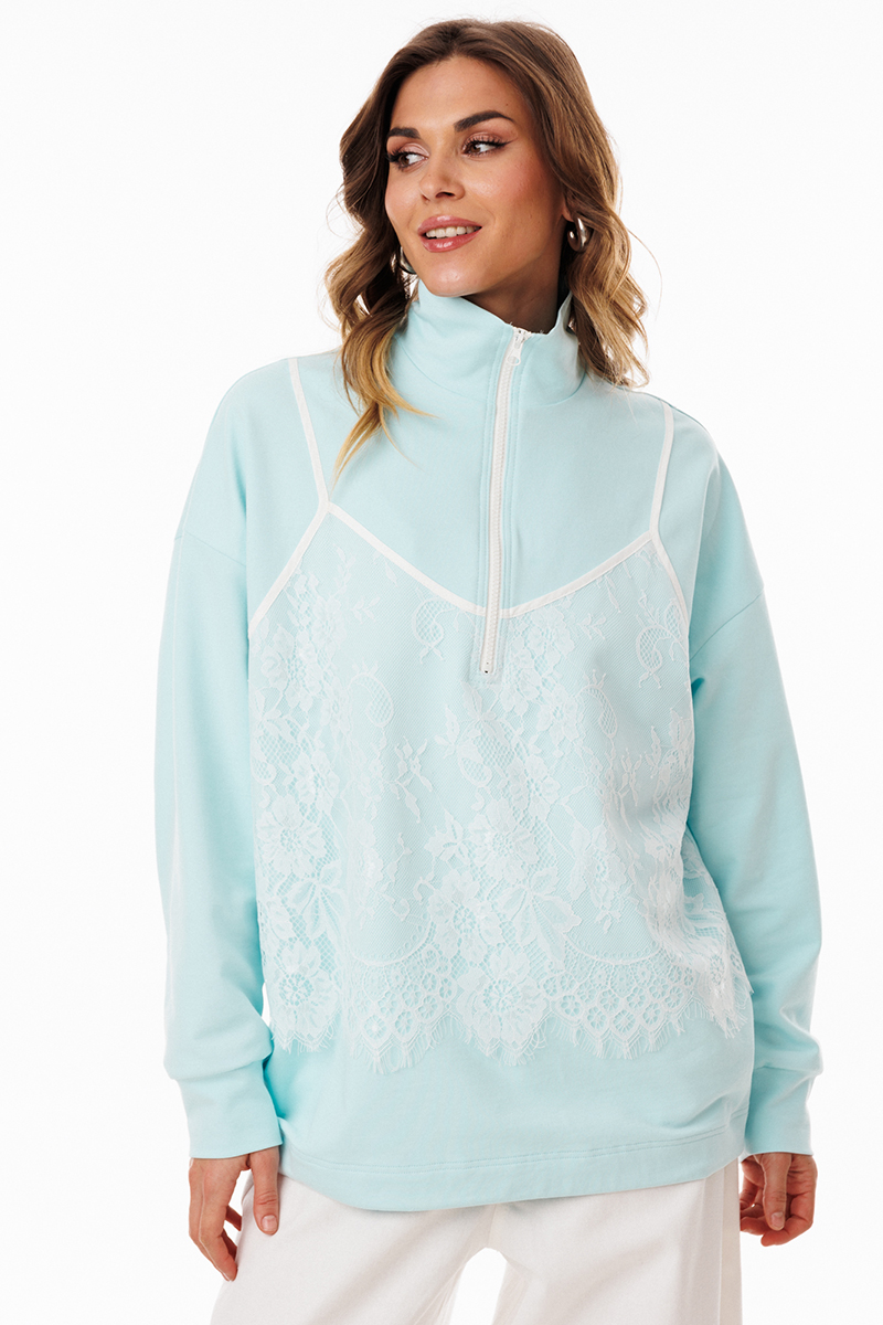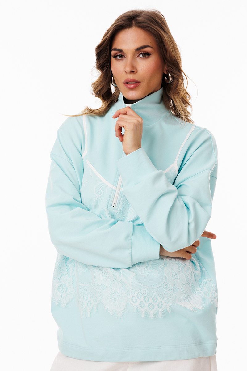Джемпер выполнен из трикотажного полотна. Джемпер прямого силуэта, покроя "Овэрсайз" (свободный крой). Длиной до линии бедер. По переду обработана застёжка на тракторную молнию от линии груди до верха. Горловина округлой формы, обработана воротником стойкой. Плечевой шов удлинен. Рукав рубашечного покроя, одношовный. Низ рукава обработан притачной манжетой. По низу джемпера обработана эластичная тесьма с фиксаторами. Джемпер декорирован по переду кружевом, имитирующим перед топа на бретелях.