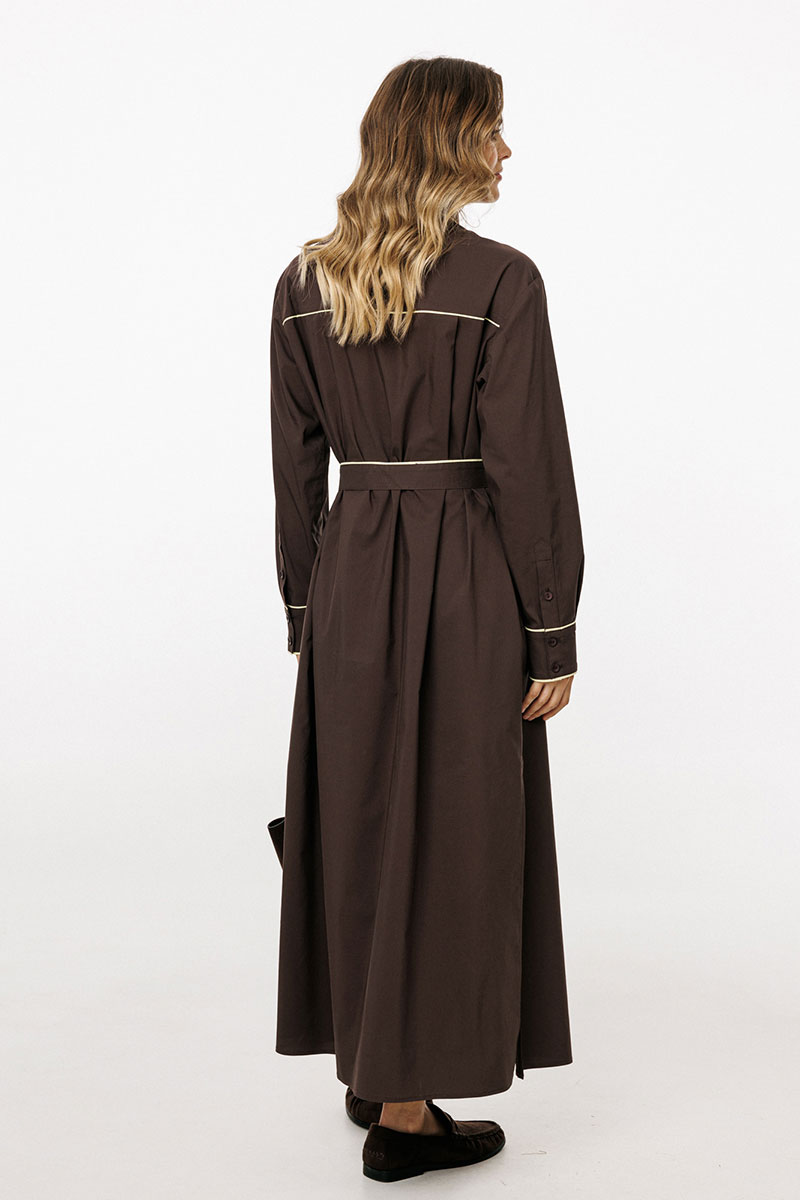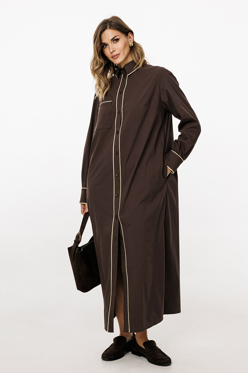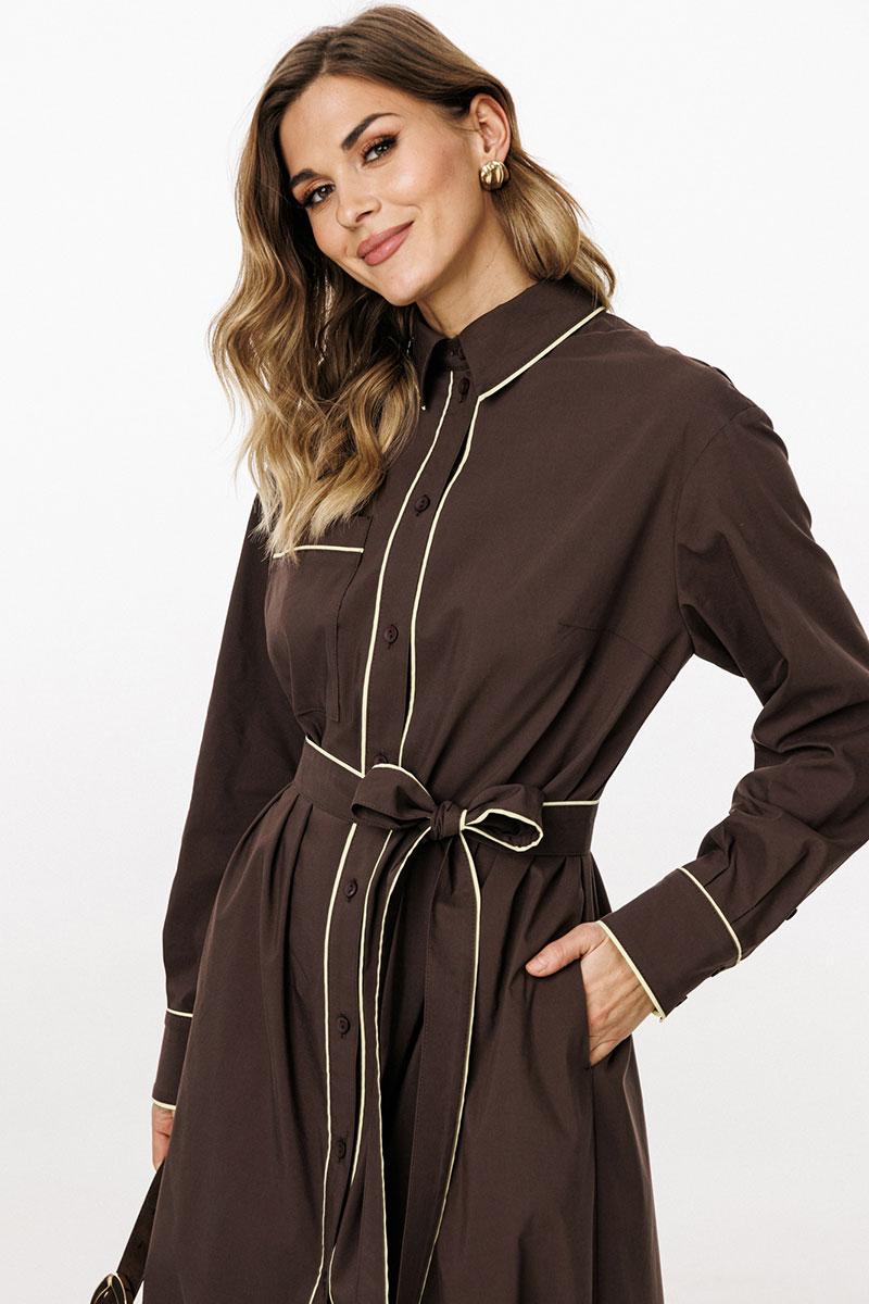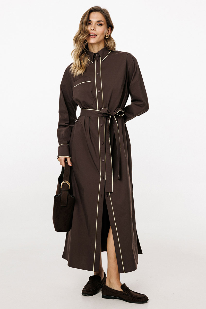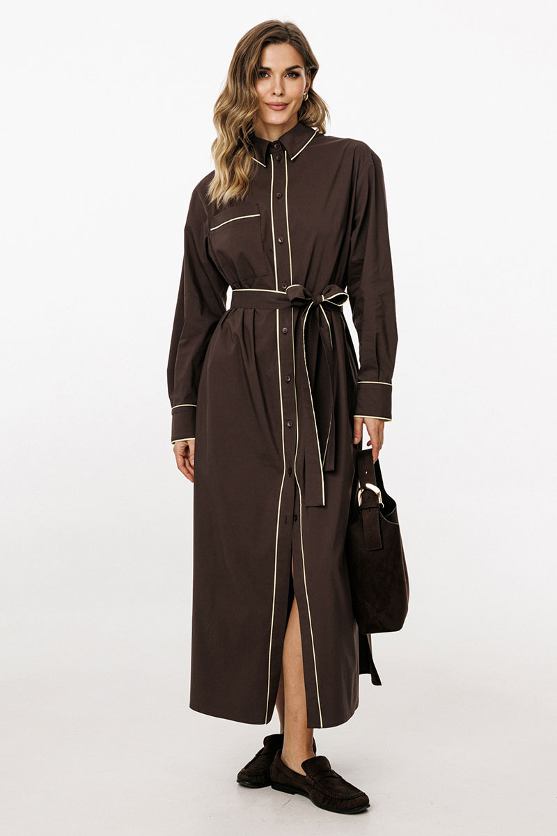Платье выполнено из плательно-блузочной ткани. Платье прямого силуэта. По переду один накладной нагрудный карман и центральная застежка до верха с отрезной планкой с петлями и пуговицами. На спинке обработаны кокетка и складки от неё. Горловина округлой формы, обработана воротником рубашечного типа с отрезной планкой. Плечевой шов удлинен. Рукав рубашечного покроя, одношовный, со складками и обтачкой прорези по низу. Низ рукава обработан притачной манжетой, застегивающейся на петли и пуговицы. В боковых швах обработаны карманы и разрезы. В комплект входит съемный пояс из основной ткани. Платье декорировано контрастным кантом по отлету воротника, кокетки спинки, манжетам, карману, планкам и поясу.