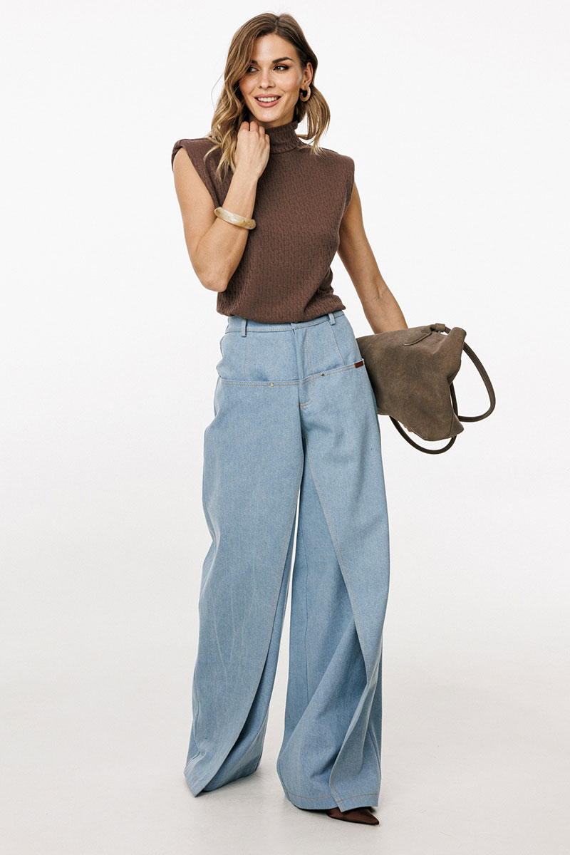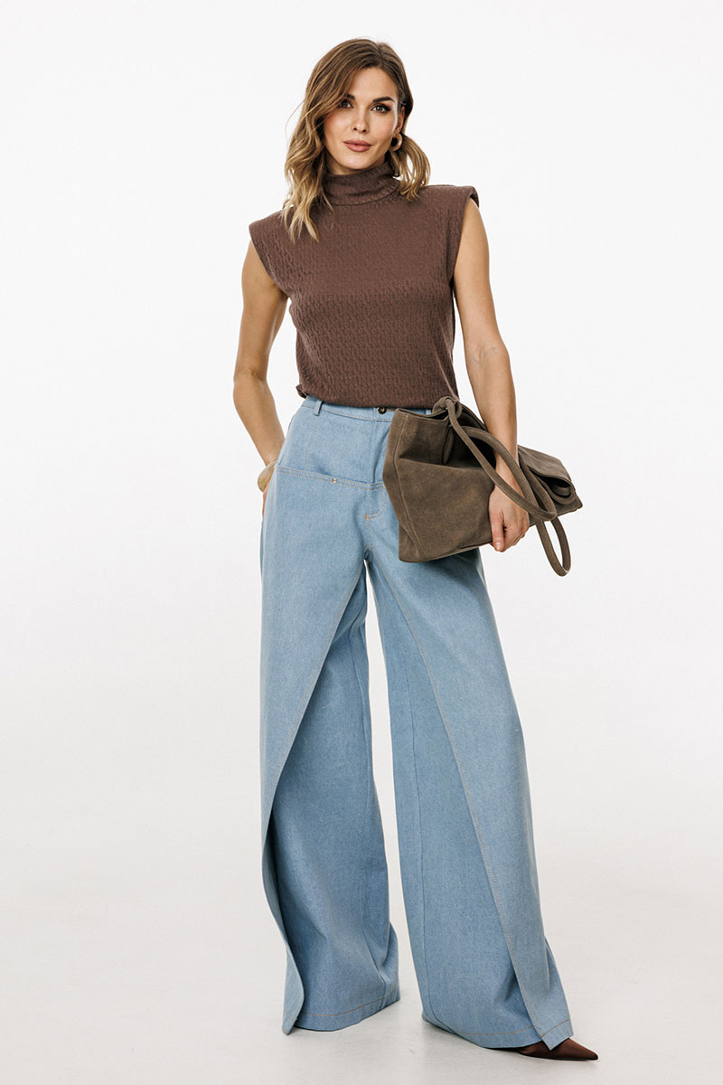 Джемпер выполнен из трикотажного полотна с рисунком. Джемпер приталенного силуэта, длиной выше линии бедер. В среднем шве спинки застежка на потайную молнию. Воротник-стойка. Плечевой шов удлинен. Джемпер на плечевых накладках.