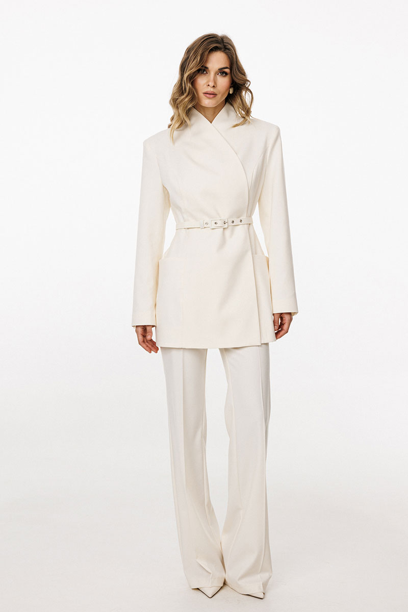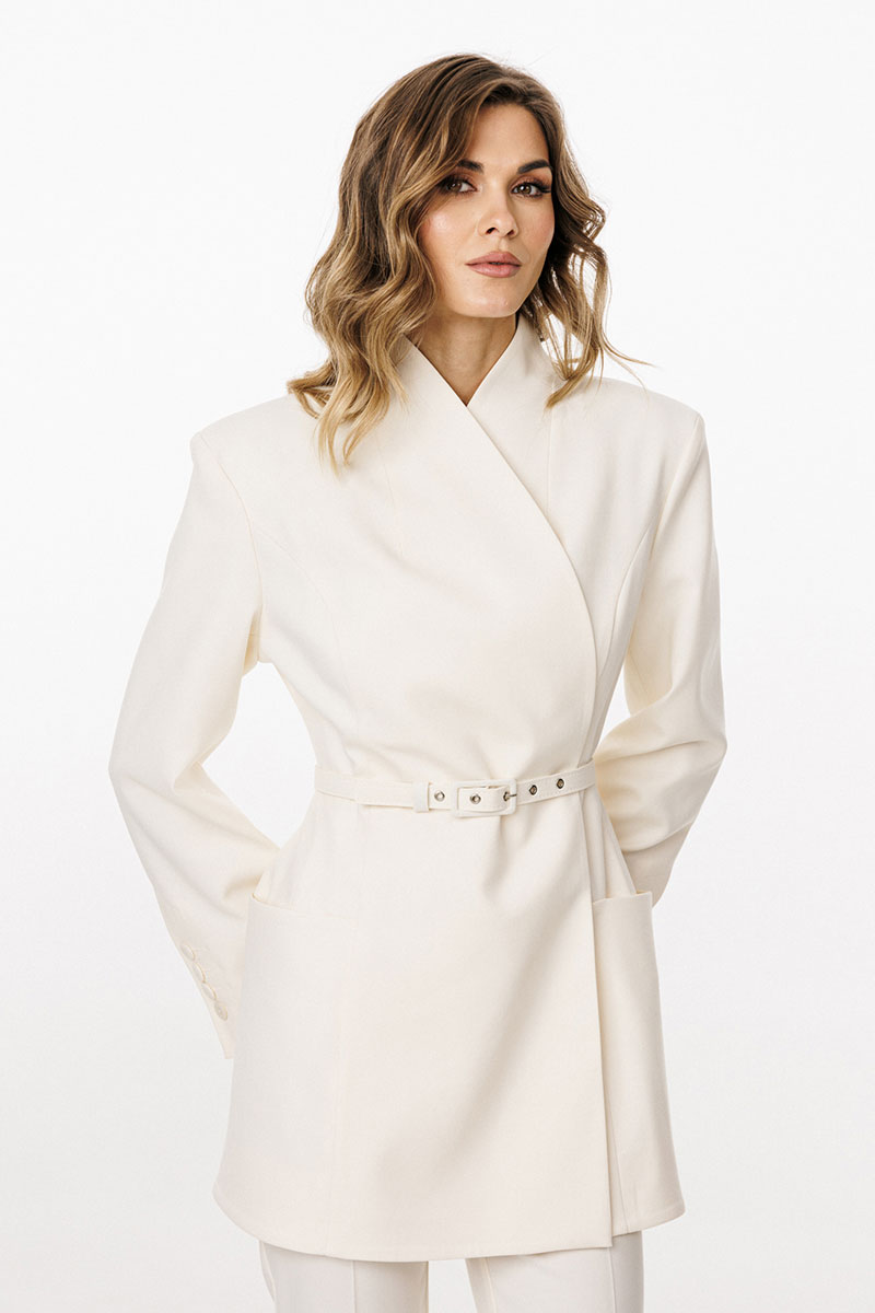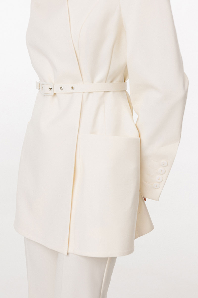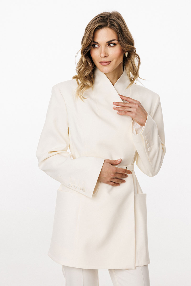 Жакет выполнен из костюмной ткани. Жакет К-образного силуэта, длиной ниже линии бедер. По переду обработаны рельефы от проймы до низа, талиевые вытачки, горизонтальные подрезы,