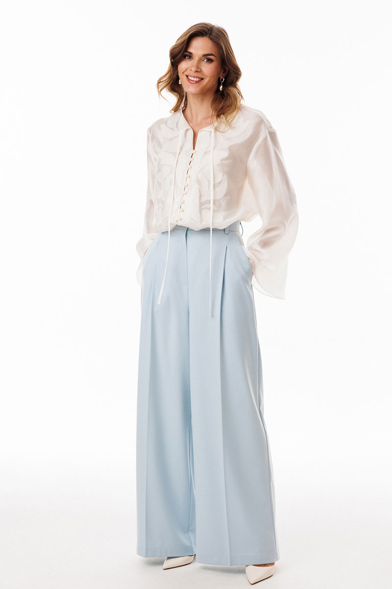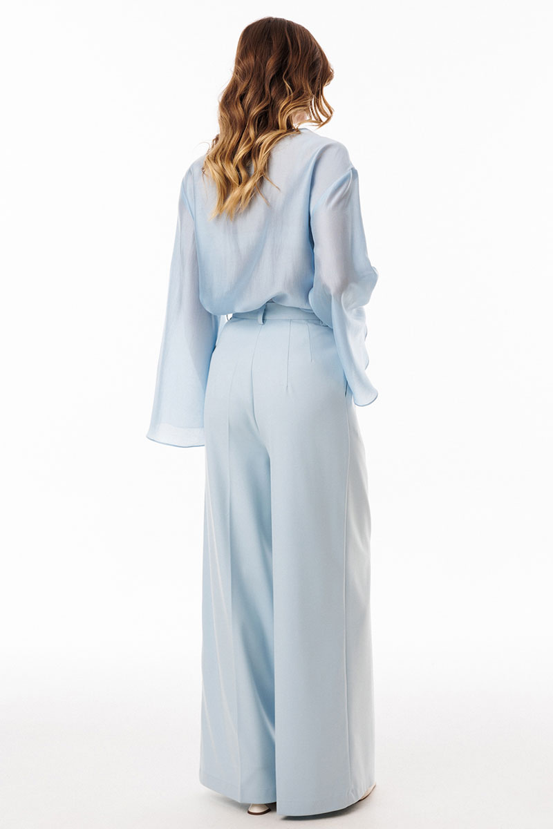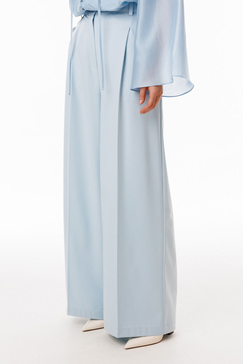 Брюки-палаццо выполнены из плательно-костюмной ткани. Брюки на притачном поясе, длиной в пол, расширенные к низу. Спереди складки и боковые карманы с наклонным входом. Застежка спереди на молнию с гульфиком и пуговицу. На задних частях обработаны талиевые вытачки.