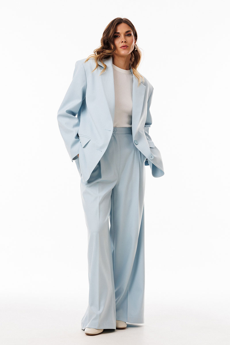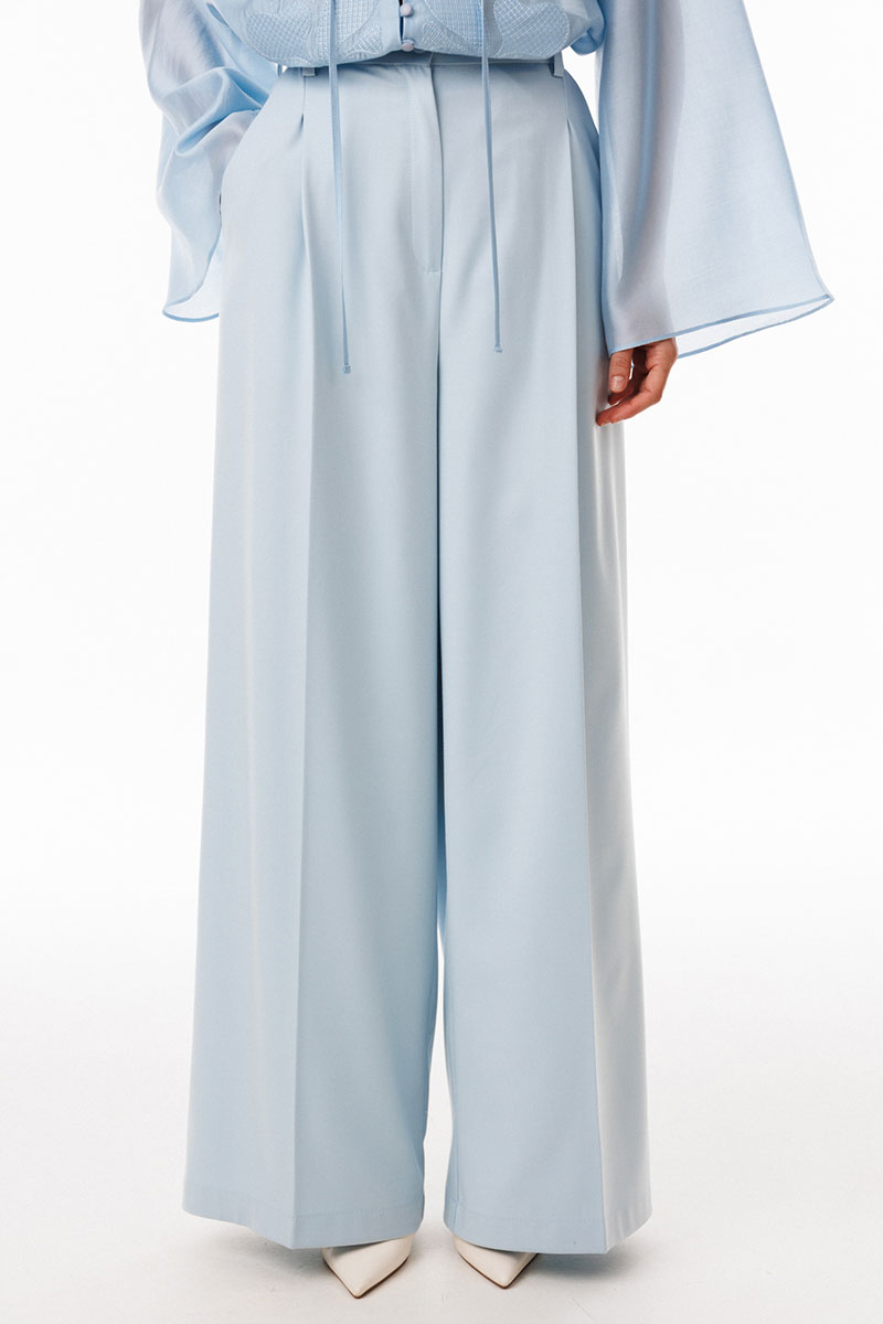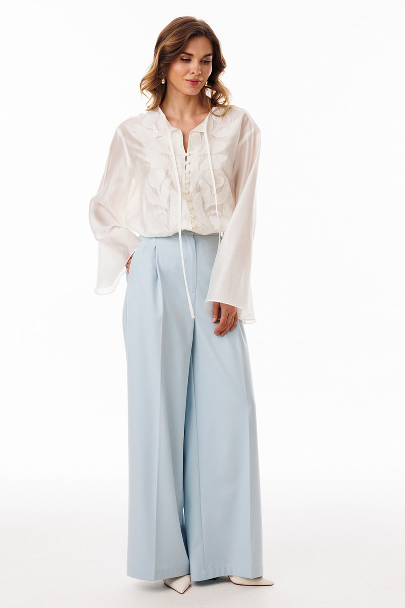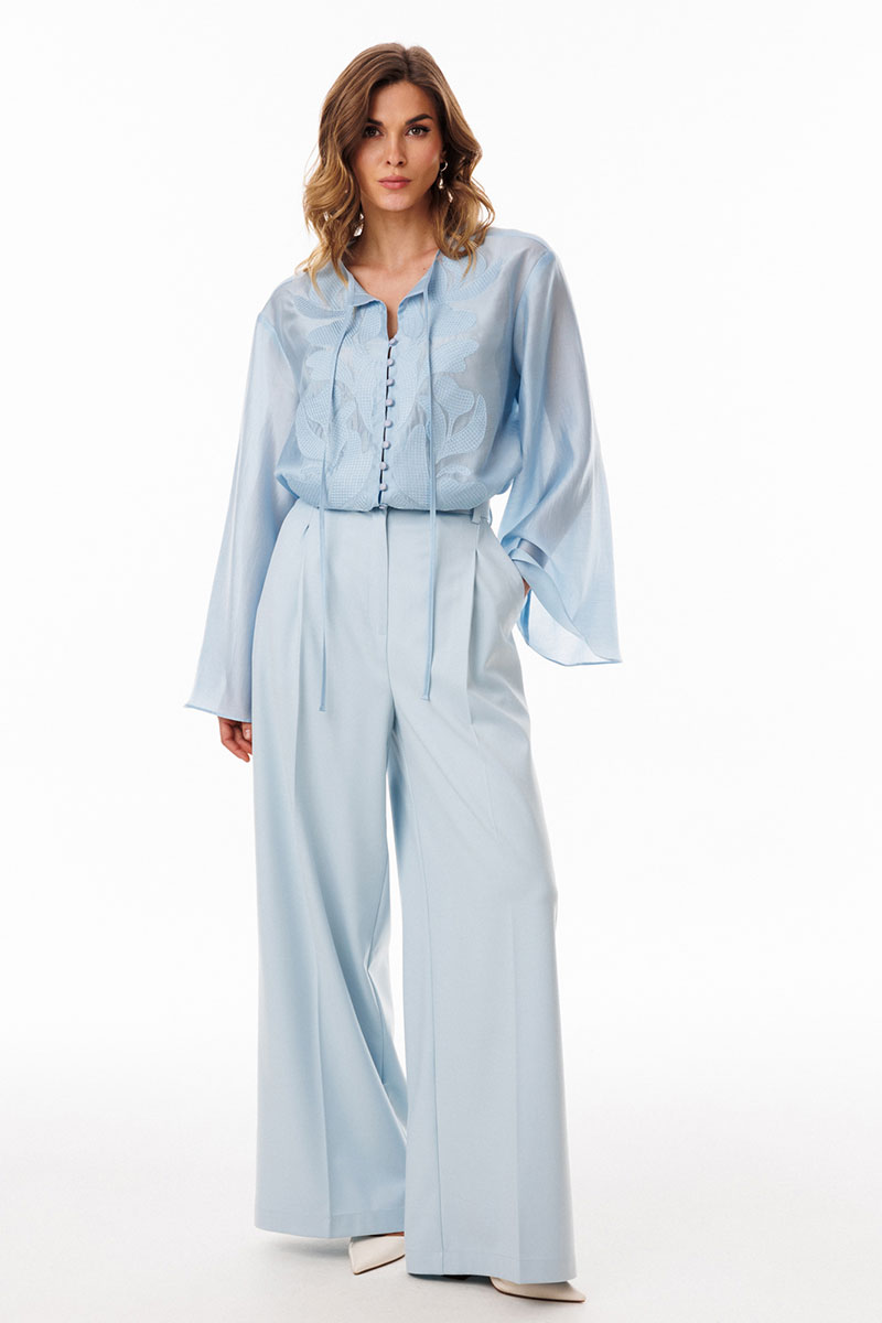 Брюки-палаццо выполнены из плательно-костюмной ткани. Брюки на притачном поясе, длиной в пол, расширенные к низу. Спереди складки и боковые карманы с наклонным входом. Застежка спереди на молнию с гульфиком и пуговицу. На задних частях обработаны талиевые вытачки.