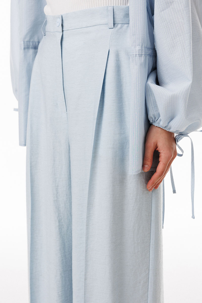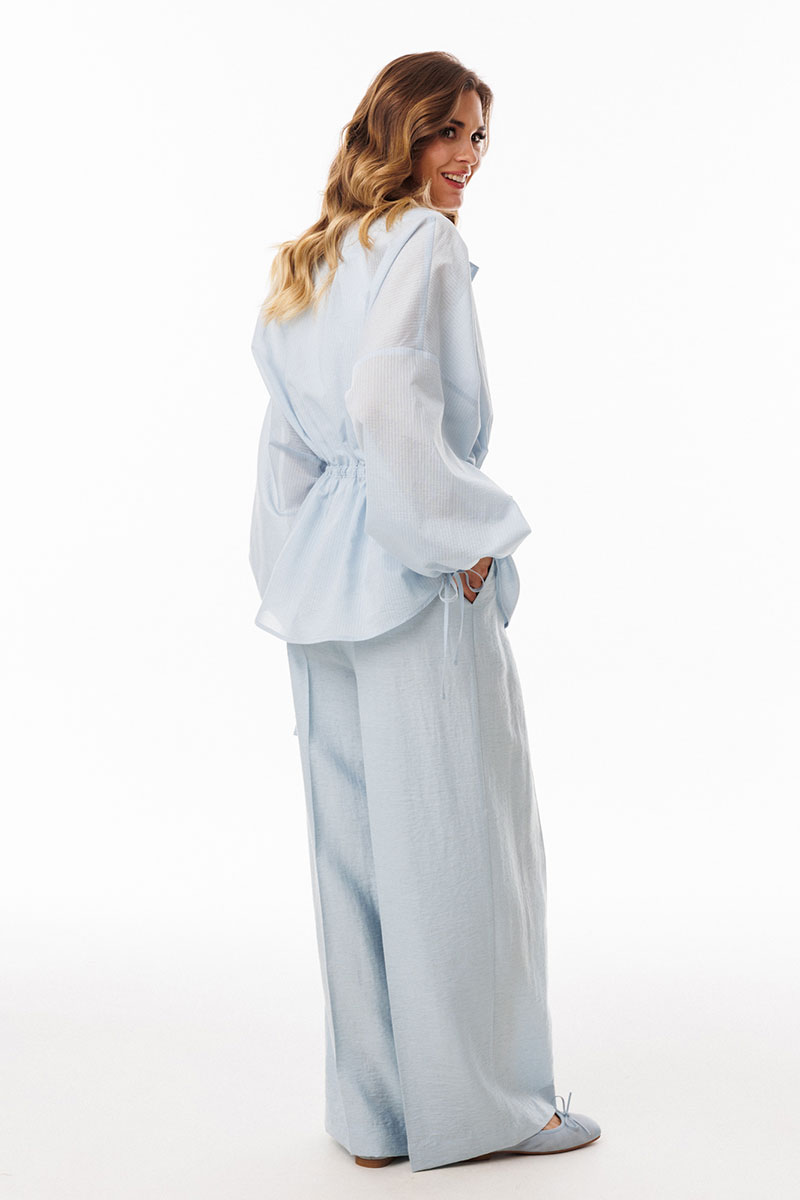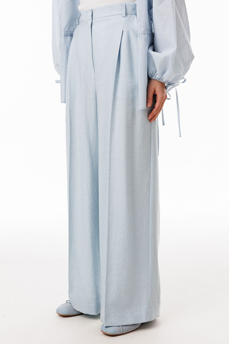 Брюки-палаццо выполнены из плательно-блузочной ткани. Брюки на притачном поясе, длиной в пол, расширенные к низу. Спереди складки и боковые карманы с наклонным входом. Застежка спереди на молнию с гульфиком и пуговицу. На задних частях обработаны талиевые вытачки.