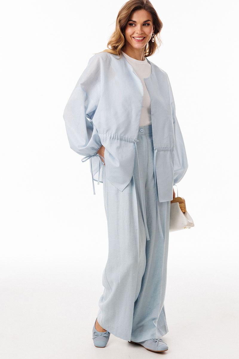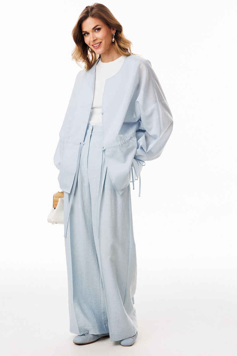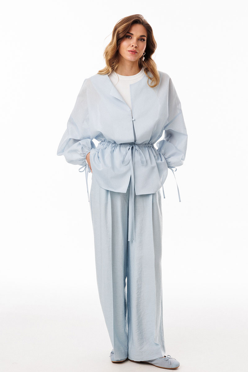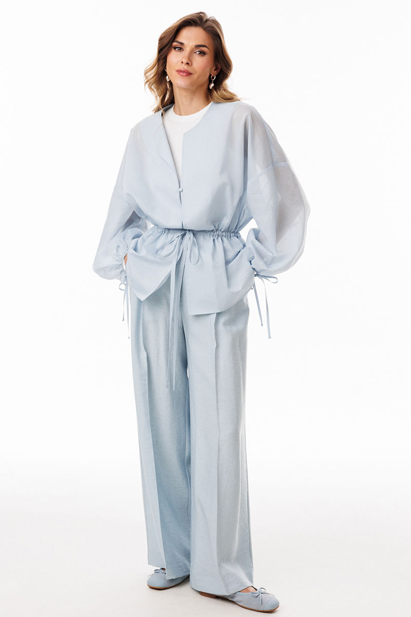 Брюки-палаццо выполнены из плательно-блузочной ткани. Брюки на притачном поясе, длиной в пол, расширенные к низу. Спереди складки и боковые карманы с наклонным входом. Застежка спереди на молнию с гульфиком и пуговицу. На задних частях обработаны талиевые вытачки.