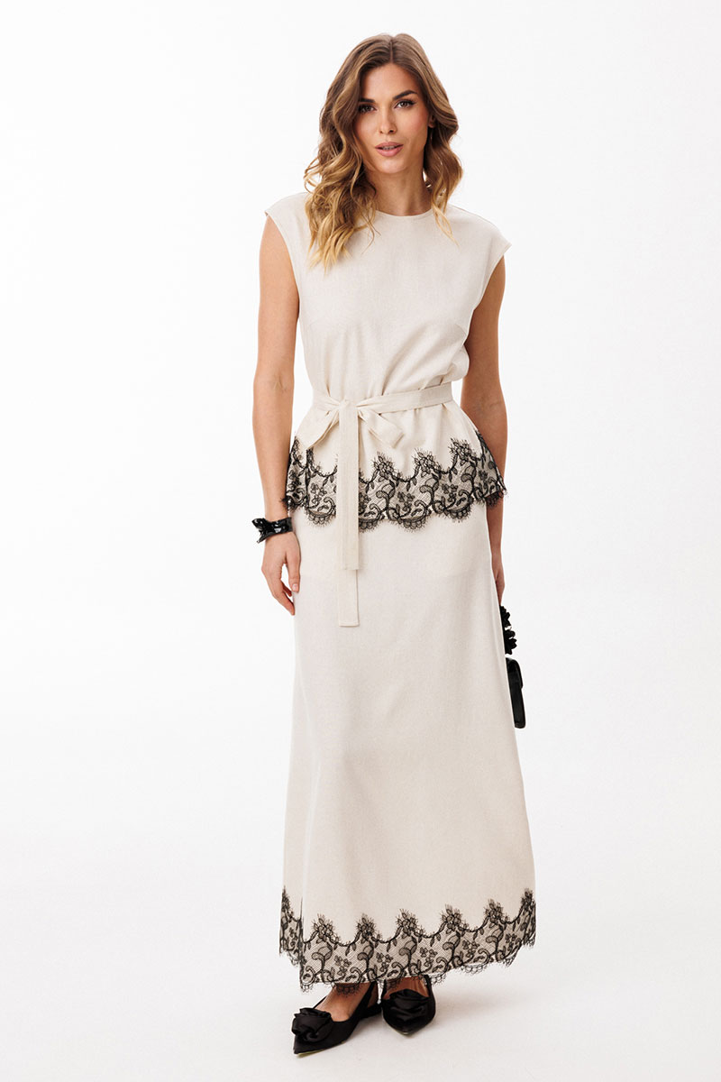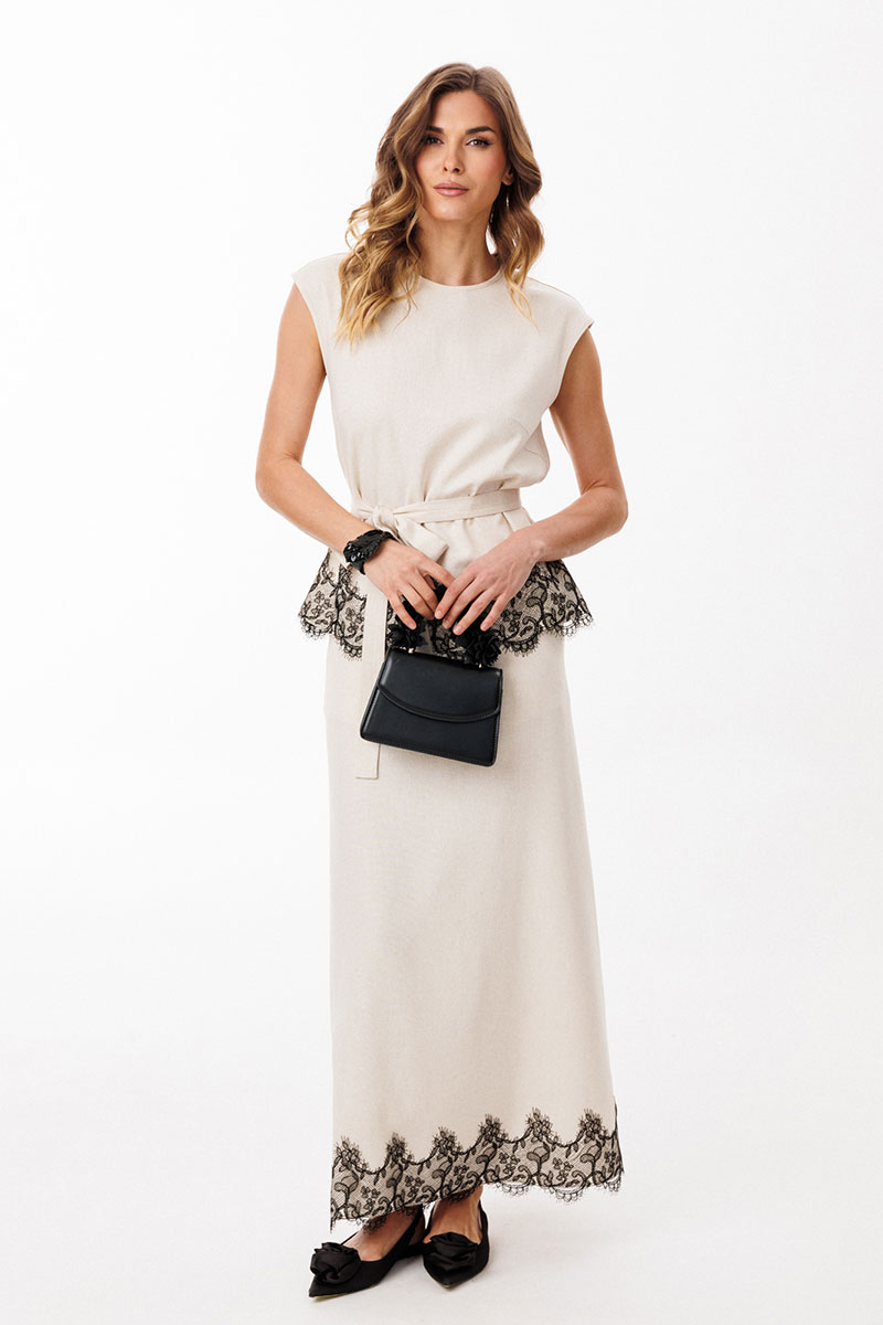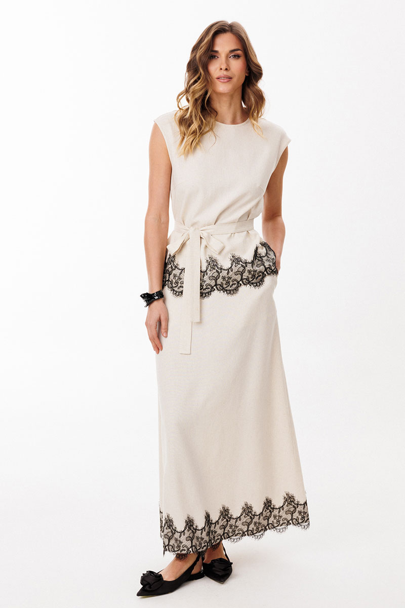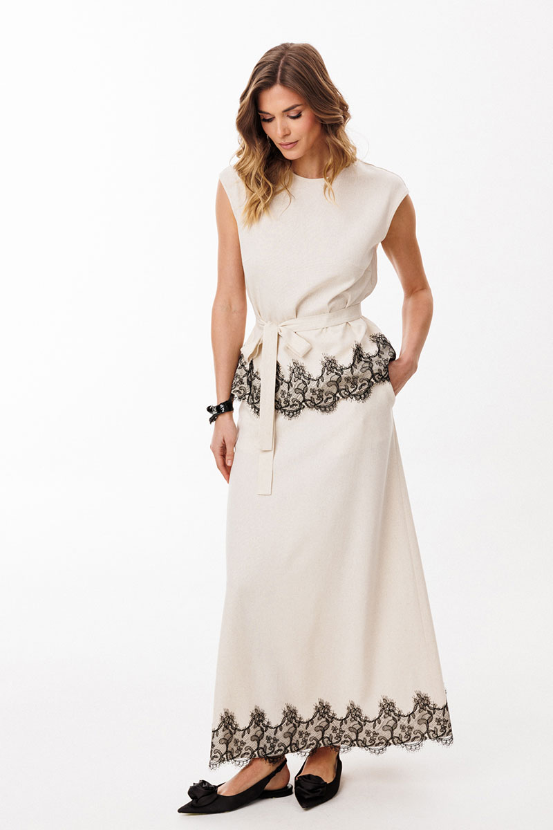 Юбка выполнена из льна. Юбка А-образного силуэта, длиной до линии щиколотки, на притачном поясе. На переднем полотнище обработаны боковые карманы с наклонным входом. На заднем полотнище обработаны талиевые вытачки и средний шов с застежкой на потайную молнию. Пояс застегивается на пуговицу. Юбка декорирована по низу настрочным кружевом. Юбка без подкладки.