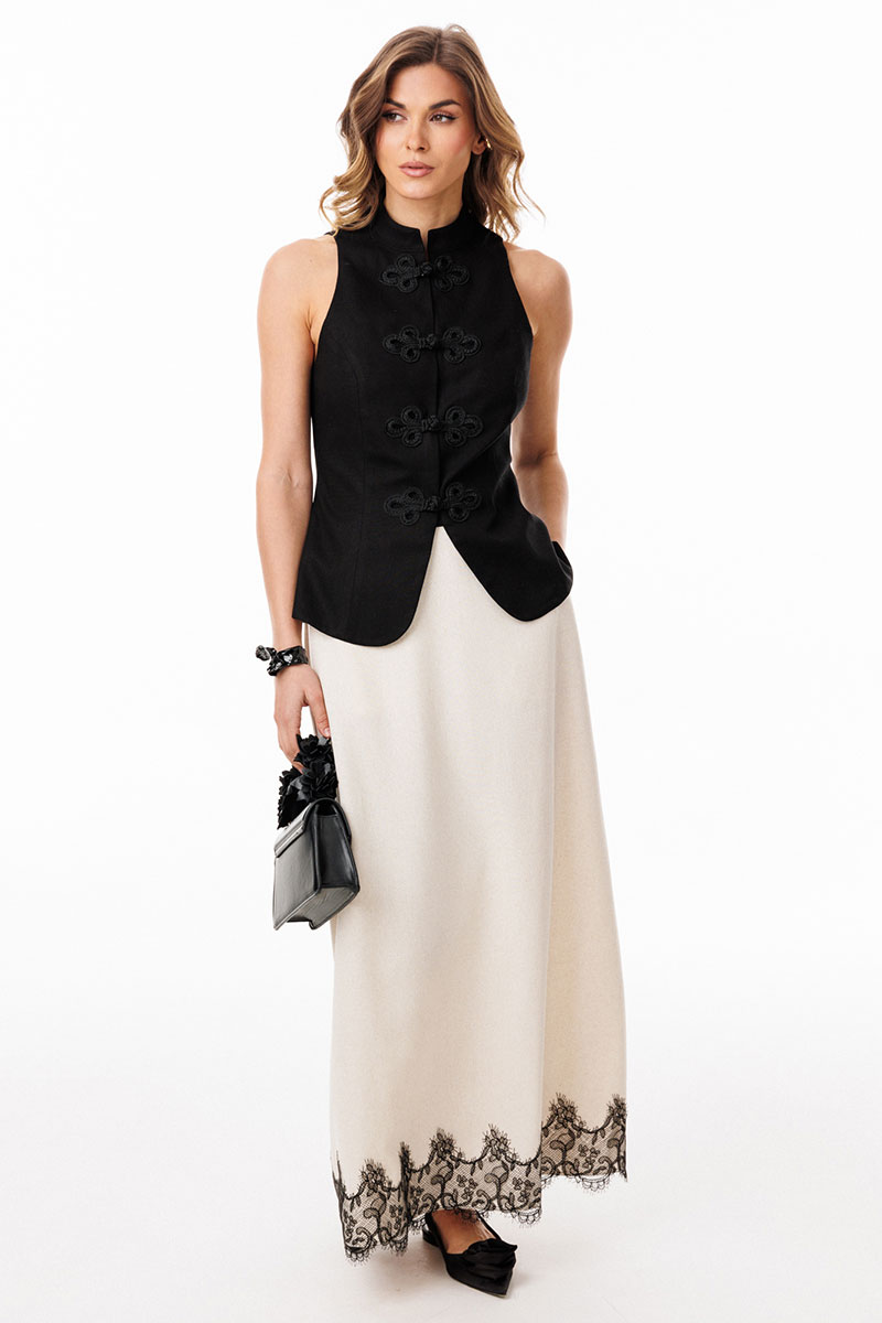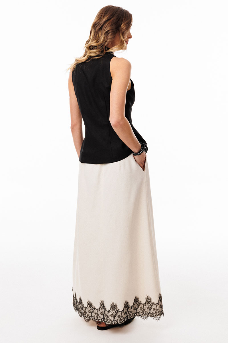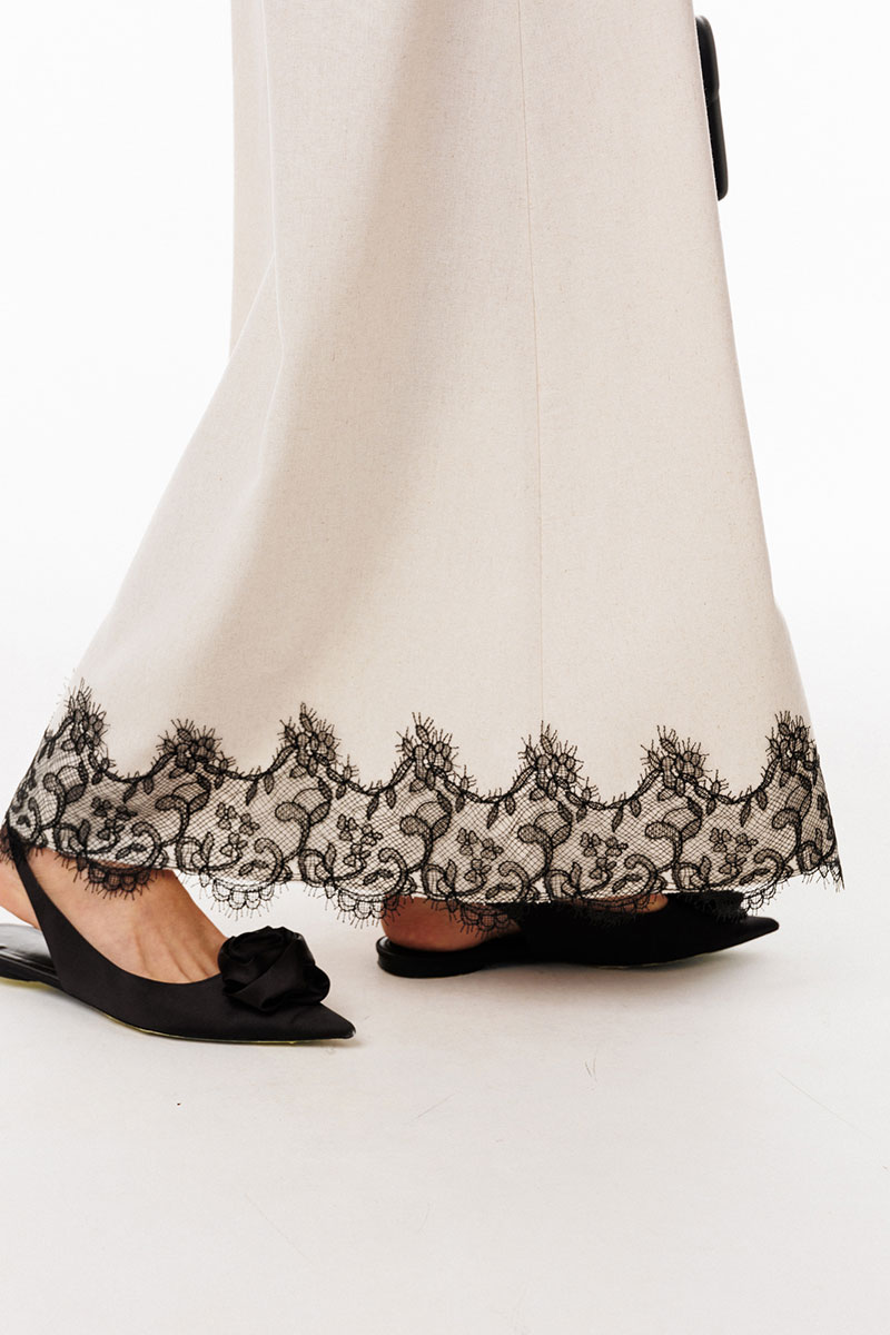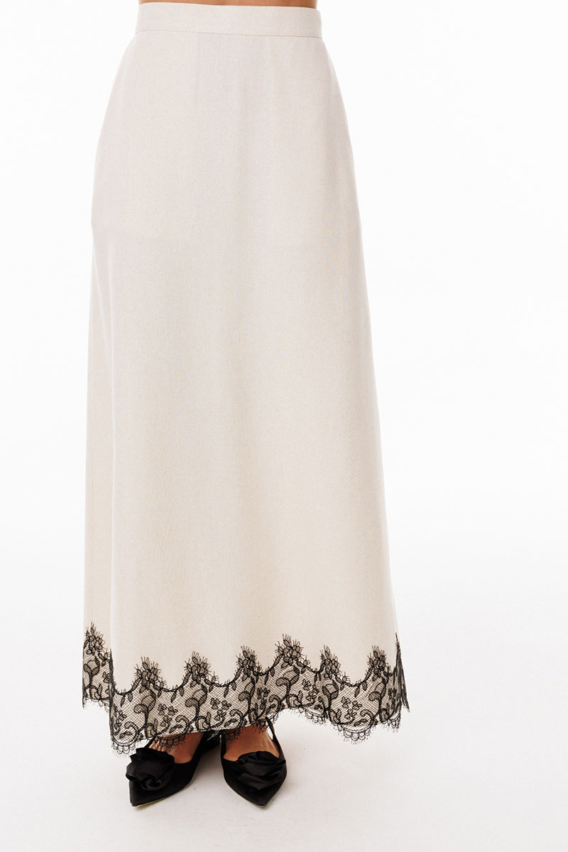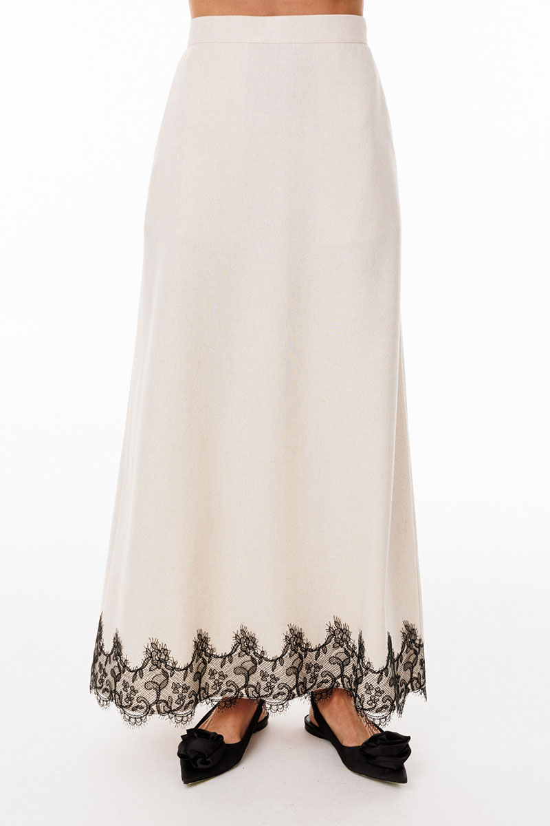 Юбка выполнена из льна. Юбка А-образного силуэта, длиной до линии щиколотки, на притачном поясе. На переднем полотнище обработаны боковые карманы с наклонным входом. На заднем полотнище обработаны талиевые вытачки и средний шов с застежкой на потайную молнию. Пояс застегивается на пуговицу. Юбка декорирована по низу настрочным кружевом. Юбка без подкладки.