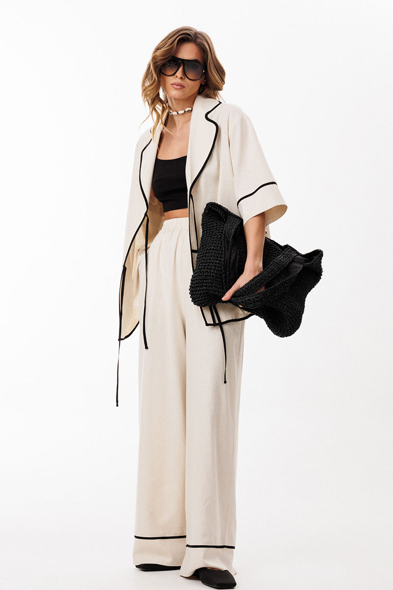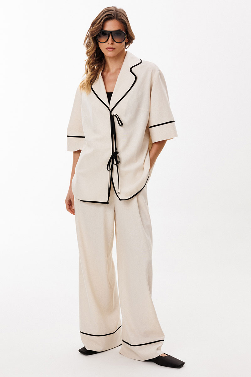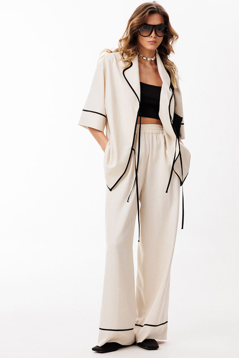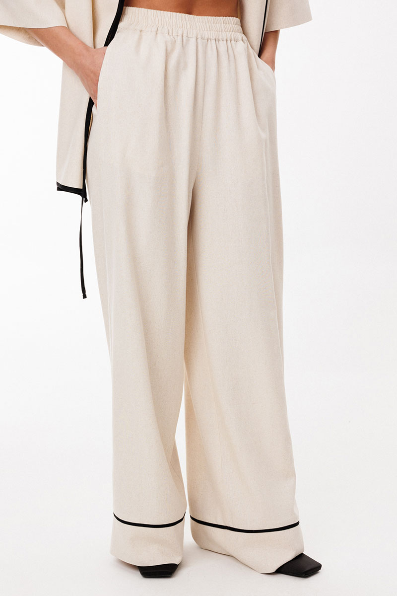 Брюки выполнены из льна. Брюки прямого силуэта, длиной в пол, на притачном поясе с эластичной тесьмой. На передних частях обработаны боковые карманы с наклонным входом. Низ брюк обработан притачной манжетой с кантом из отделочной ткани.
