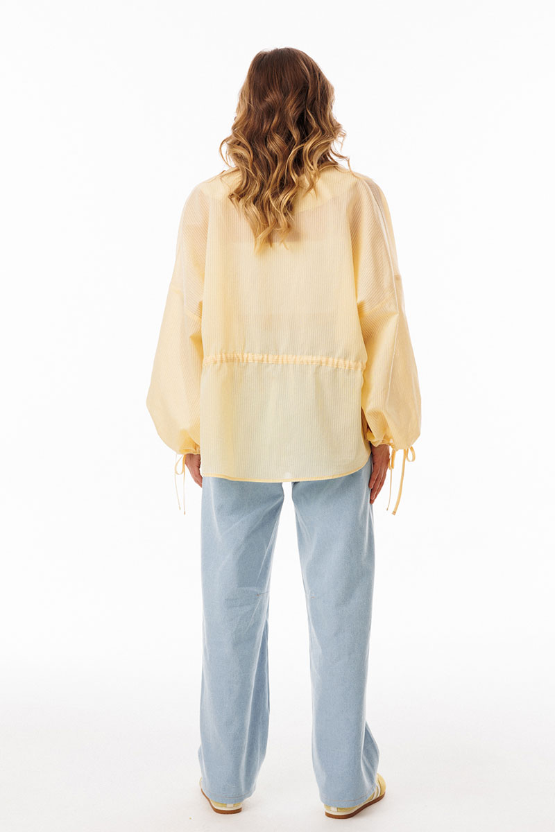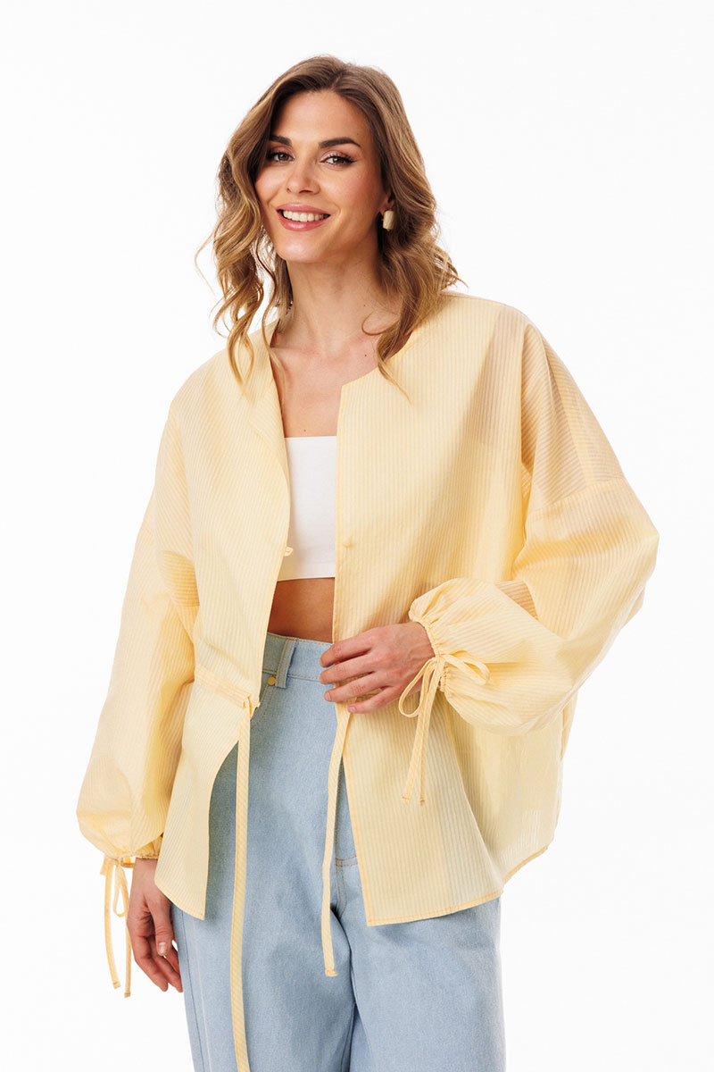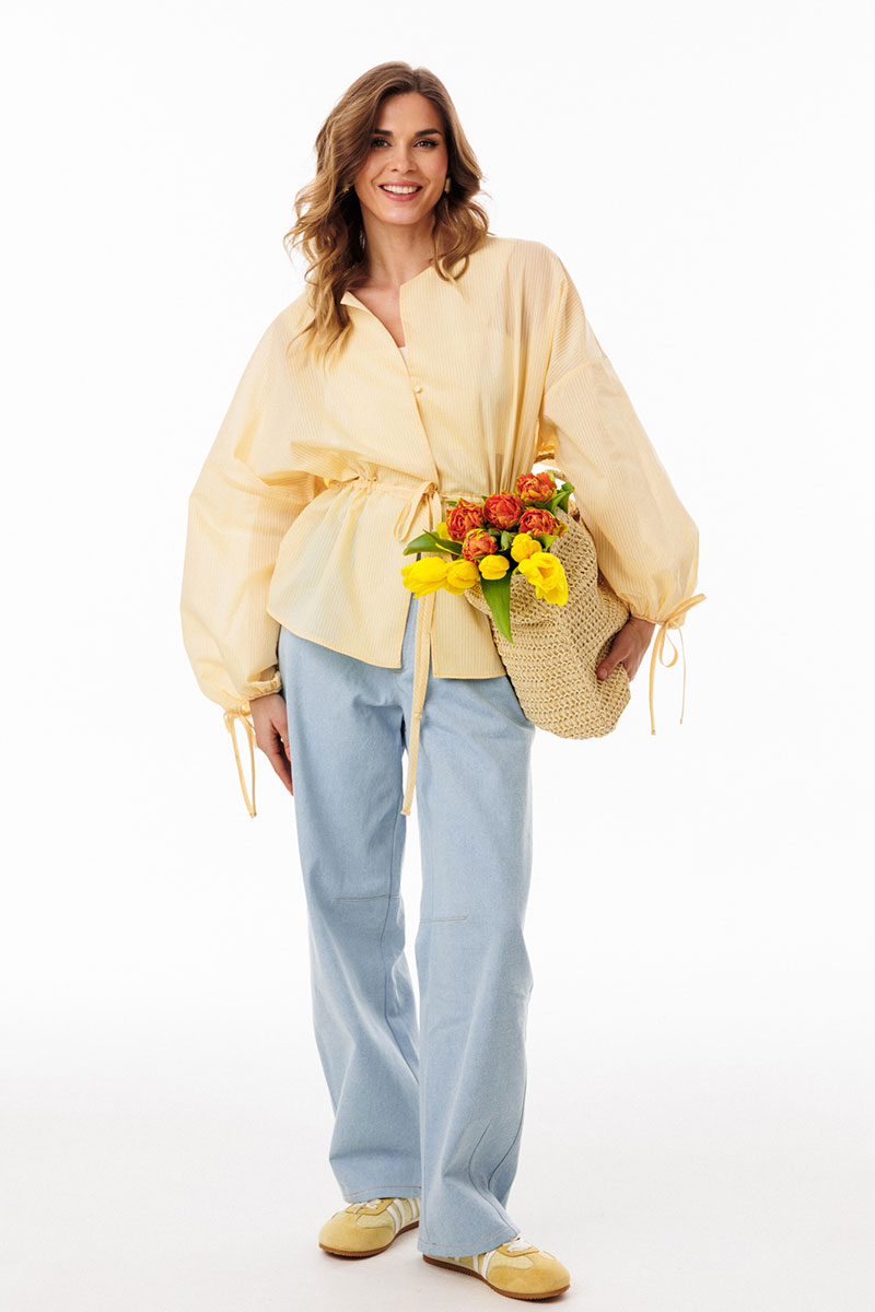 Блузка из выполнена из плательно-блузочной ткани в мелкую полоску. Блузка Х-образного силуэта, длиной до линии бедер. По переду обработана центральная застежка встык на две навесные петли и пуговицы. Спинка цельная. Горловина округлой формы. Плечевой шов удлинен. Рукав покроя кимоно, одношовный, расширенный и присборенный по низу с эластичной тесьмой. Низ рукава декорирован бантиком из основной ткани. Низ блузки фигурной формы. По линии талии обработана кулиса со шнуром из основной ткани.