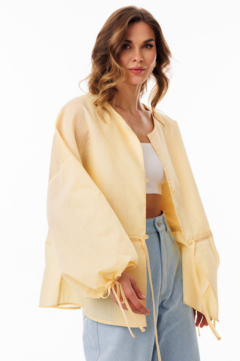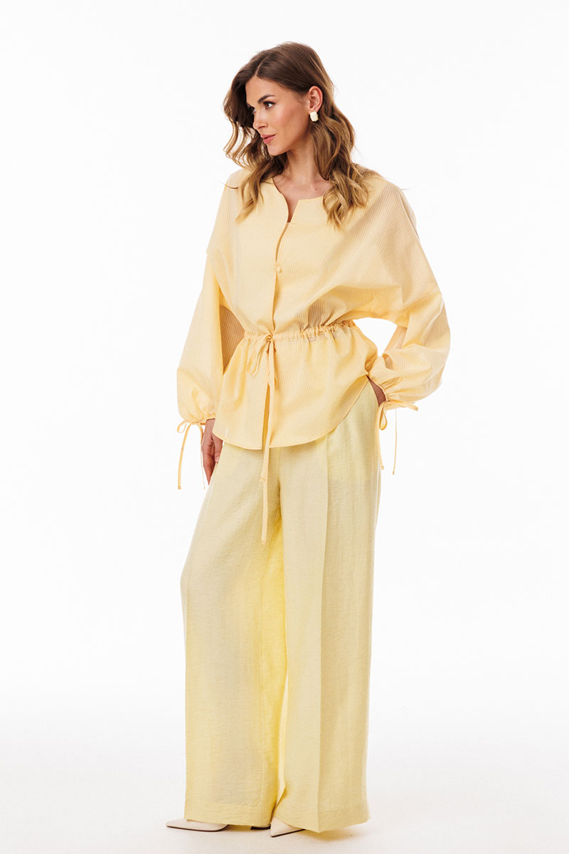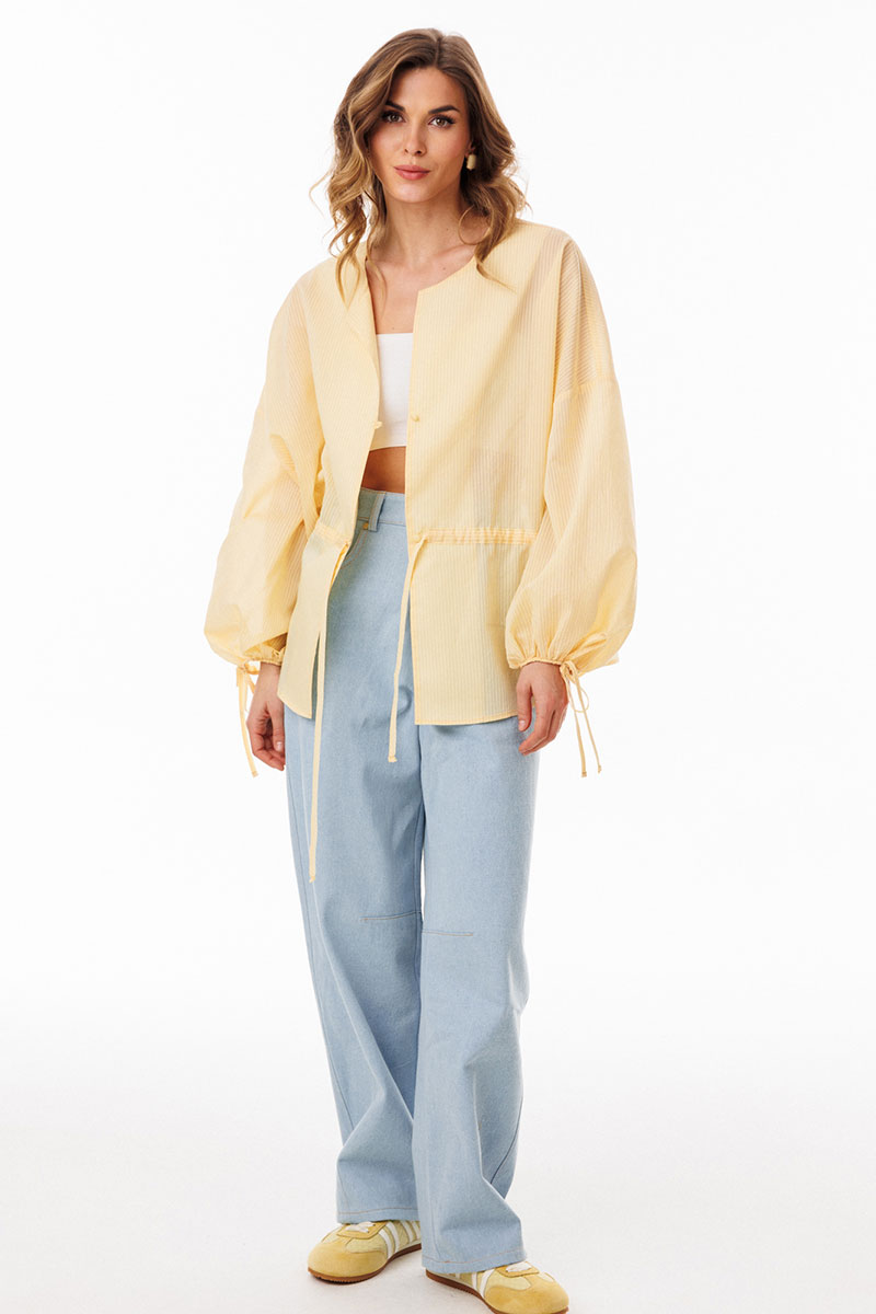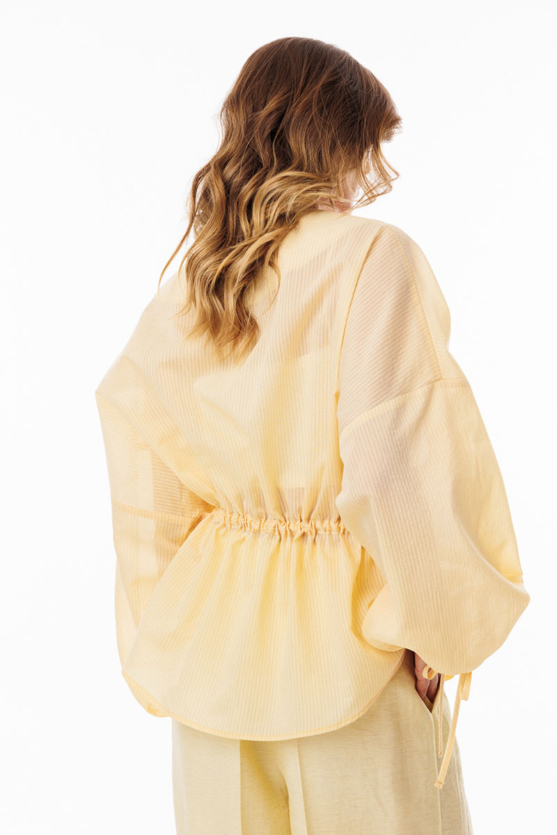 Блузка из выполнена из плательно-блузочной ткани в мелкую полоску. Блузка Х-образного силуэта, длиной до линии бедер. По переду обработана центральная застежка встык на две навесные петли и пуговицы. Спинка цельная. Горловина округлой формы. Плечевой шов удлинен. Рукав покроя кимоно, одношовный, расширенный и присборенный по низу с эластичной тесьмой. Низ рукава декорирован бантиком из основной ткани. Низ блузки фигурной формы. По линии талии обработана кулиса со шнуром из основной ткани.