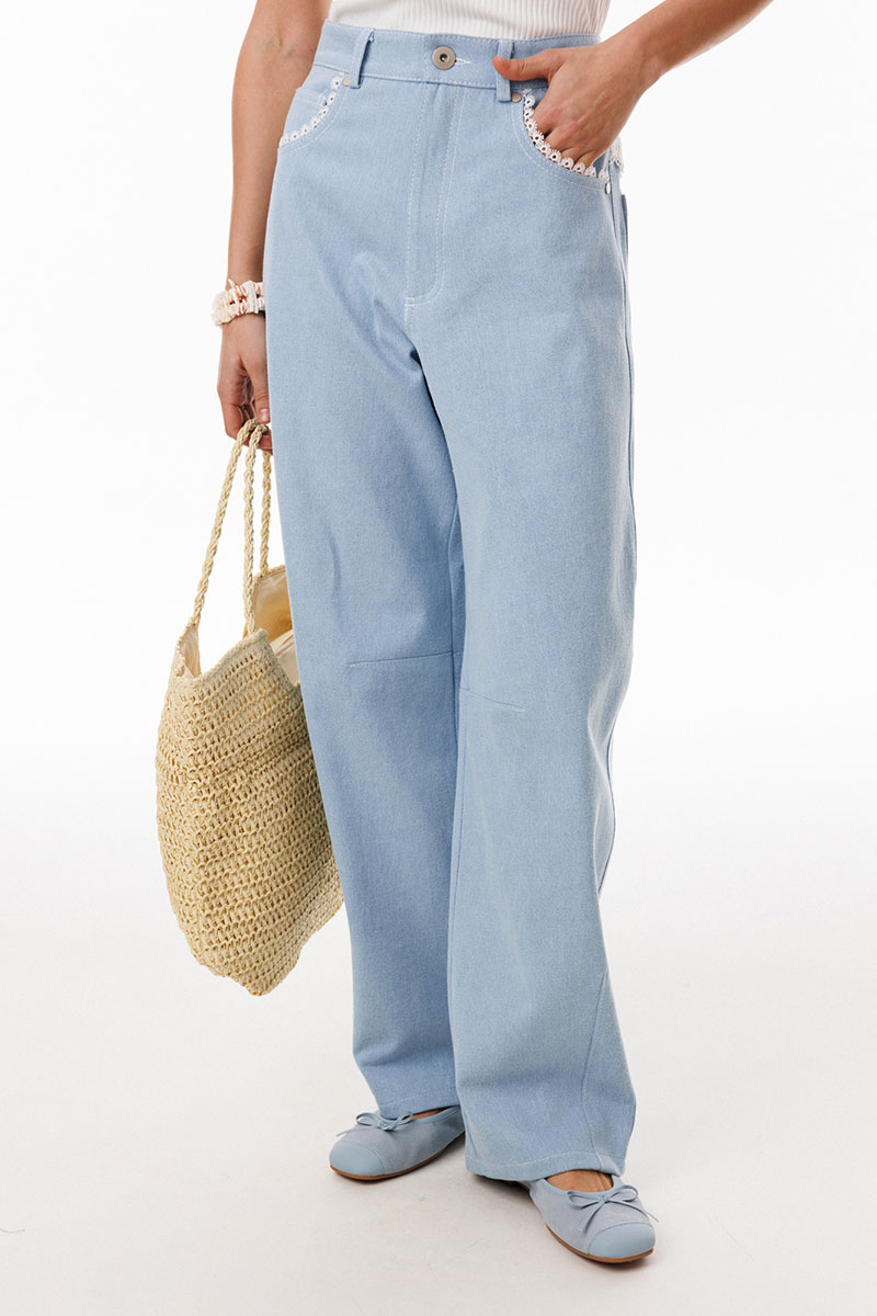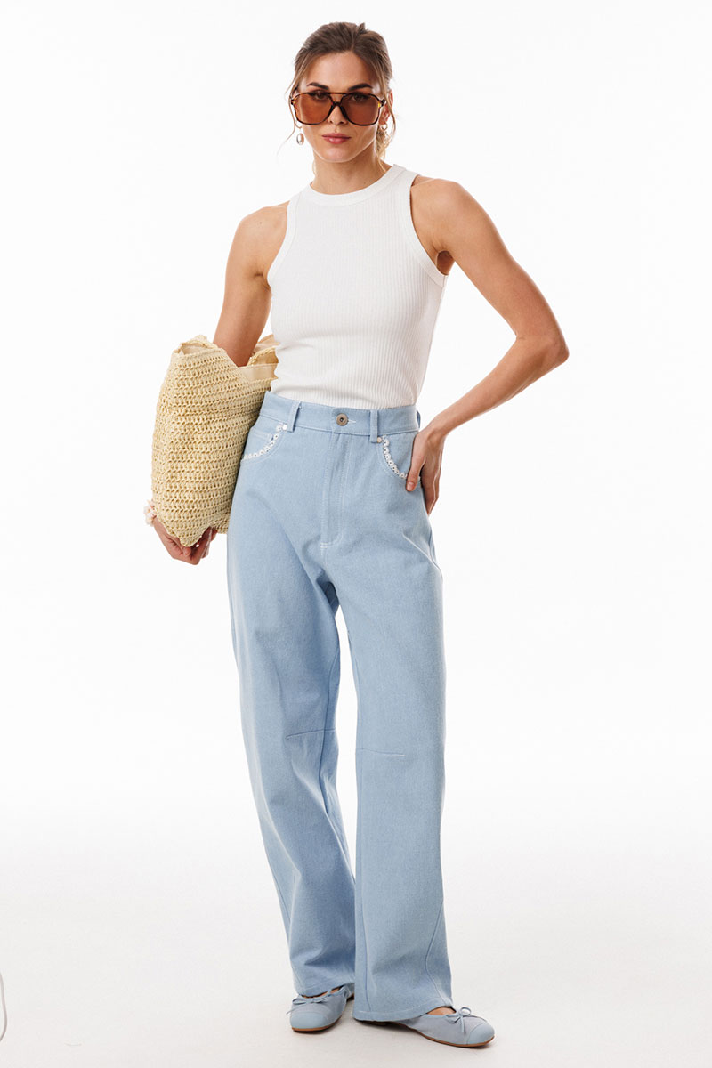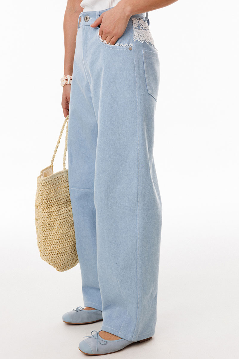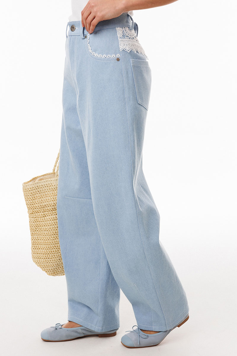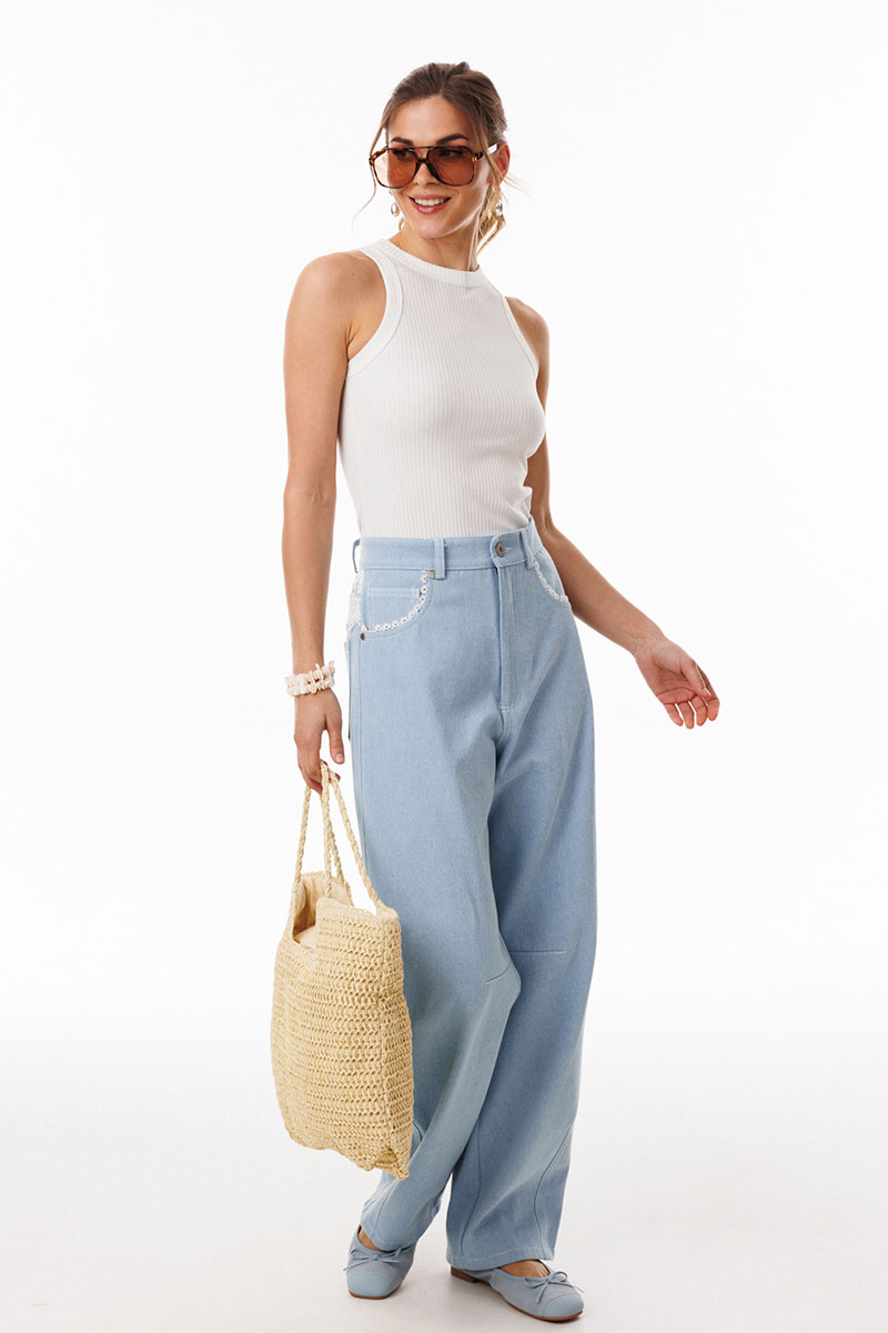 Джинсы-"Багги" (мешковатые, широкие) выполнены из плотного джинса. Брюки на притачном поясе, длиной до линии щиколотки, расширенные от бедер и слегка зауженные к низу. Спереди боковые карманы с фигурным входом. Застежка на пуговицу и молнию с гульфиком. На задних частях кокетки декорированы кружевом, и есть функциональные накладные карманы. На передней части брюк карманы декорированы кружевом. На передней и задней части коленные вытачки.