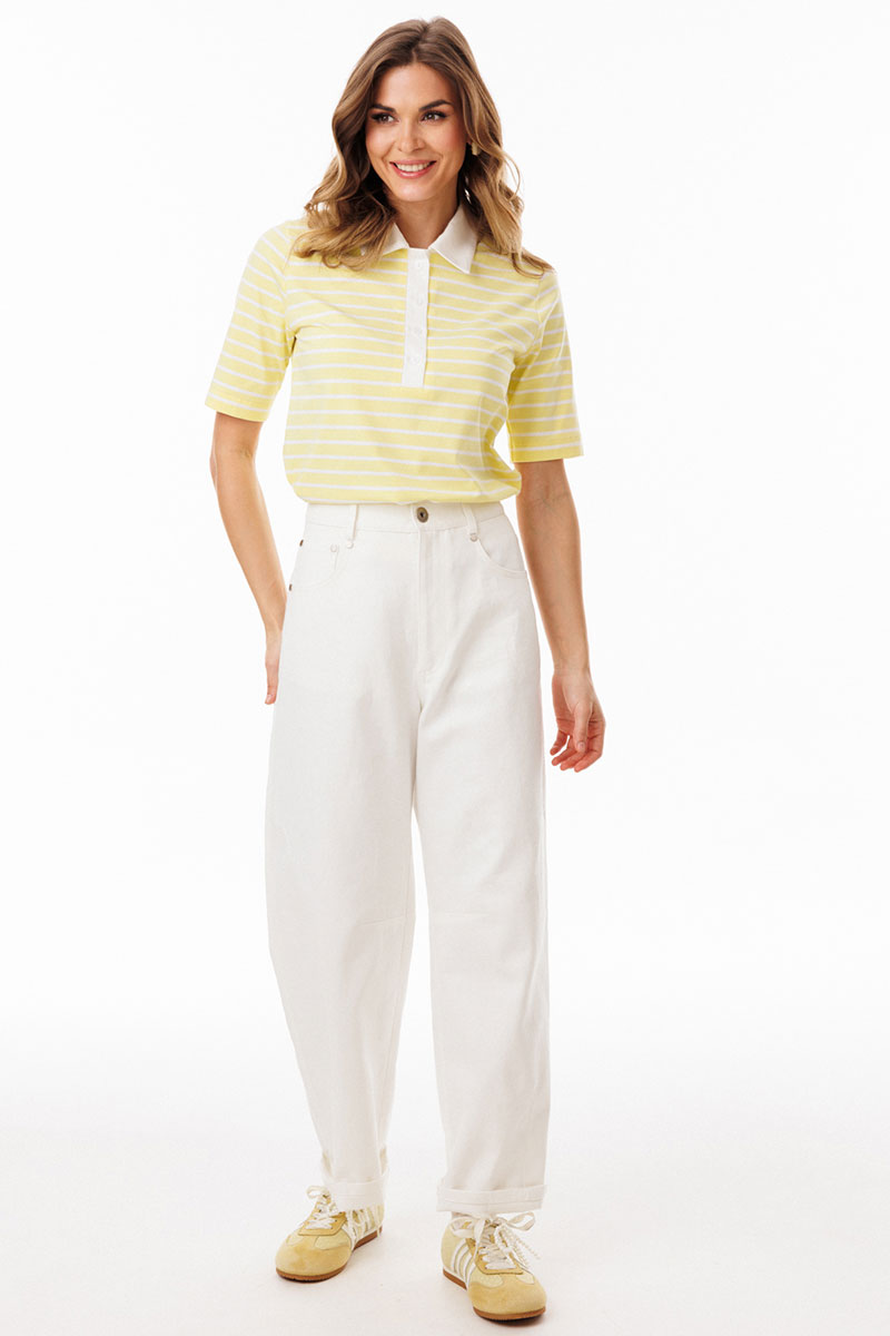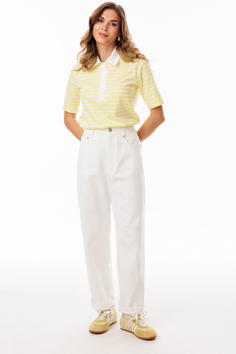 Джемпер выполнен из трикотажного полотна в полоску. Джемпер полуприлегающего силуэта, длиной выше линии бедер. Спереди застежка на пуговицы. Воротник стояче-отложной. Воротник и планка выполнены из гладкокрашенного трикотажного полотна. Плечевой шов удлинен. Рукав втачного покроя, одношовный, выше линии локтя.