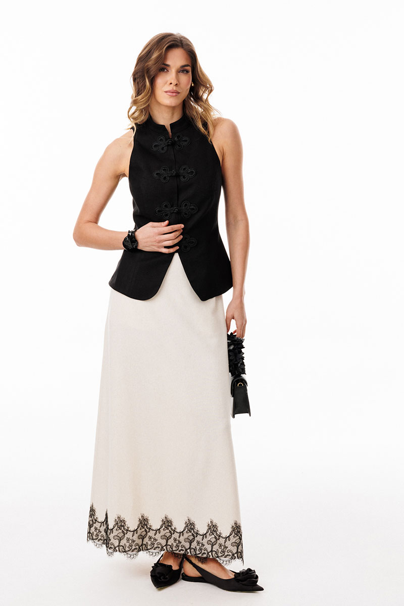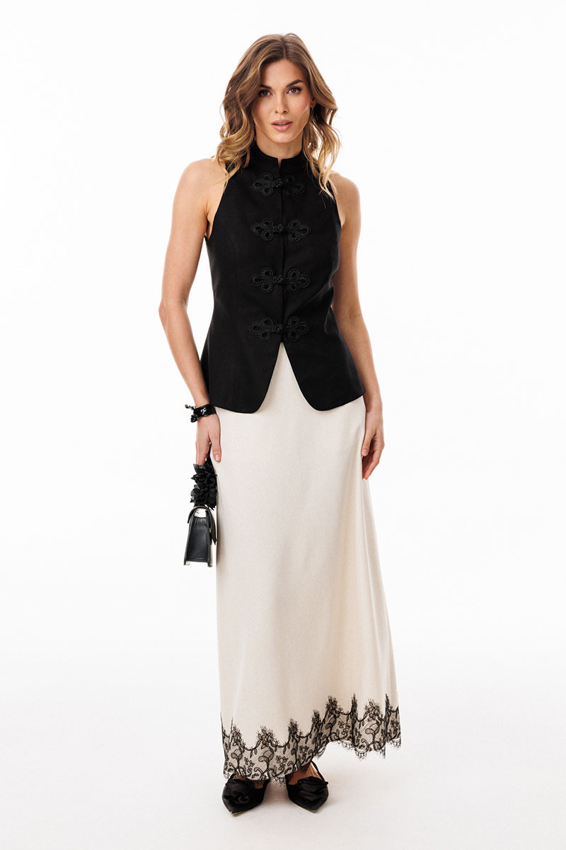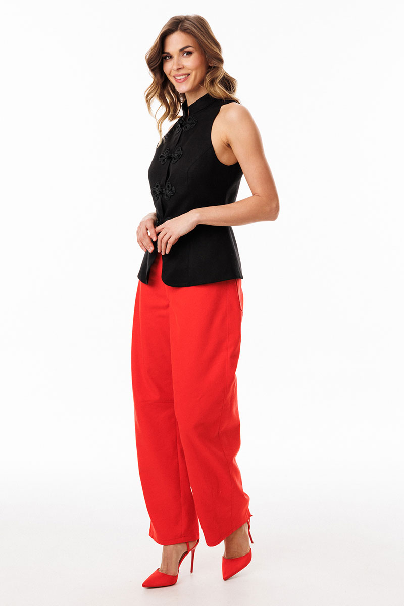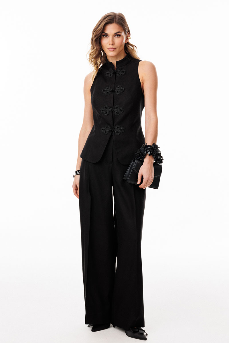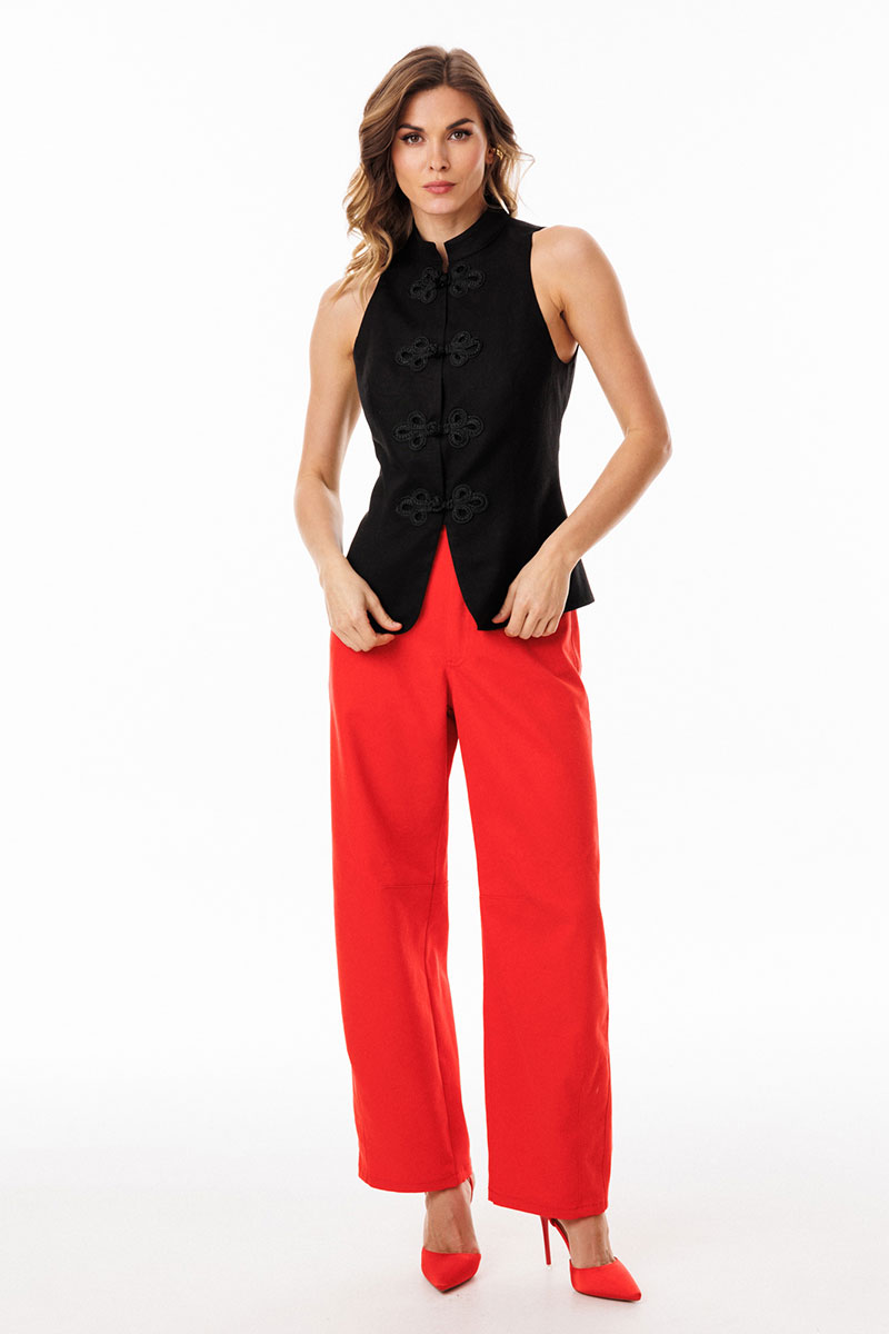 Жилет выполнен из плательно-блузочной ткани. Жилет приталенного силуэта, длиной выше линии бедер. По переду обработаны рельефы от проймы до низа, центральная застежка встык на кнопки с декоративными клевантами. Плечевой шов заужен. Горловина округлой формы, обработана воротником-стойкой. На спинке обработаны талиевые вытачки. Низ борта закругленной формы. Жилет на притачной по низу подкладке.
