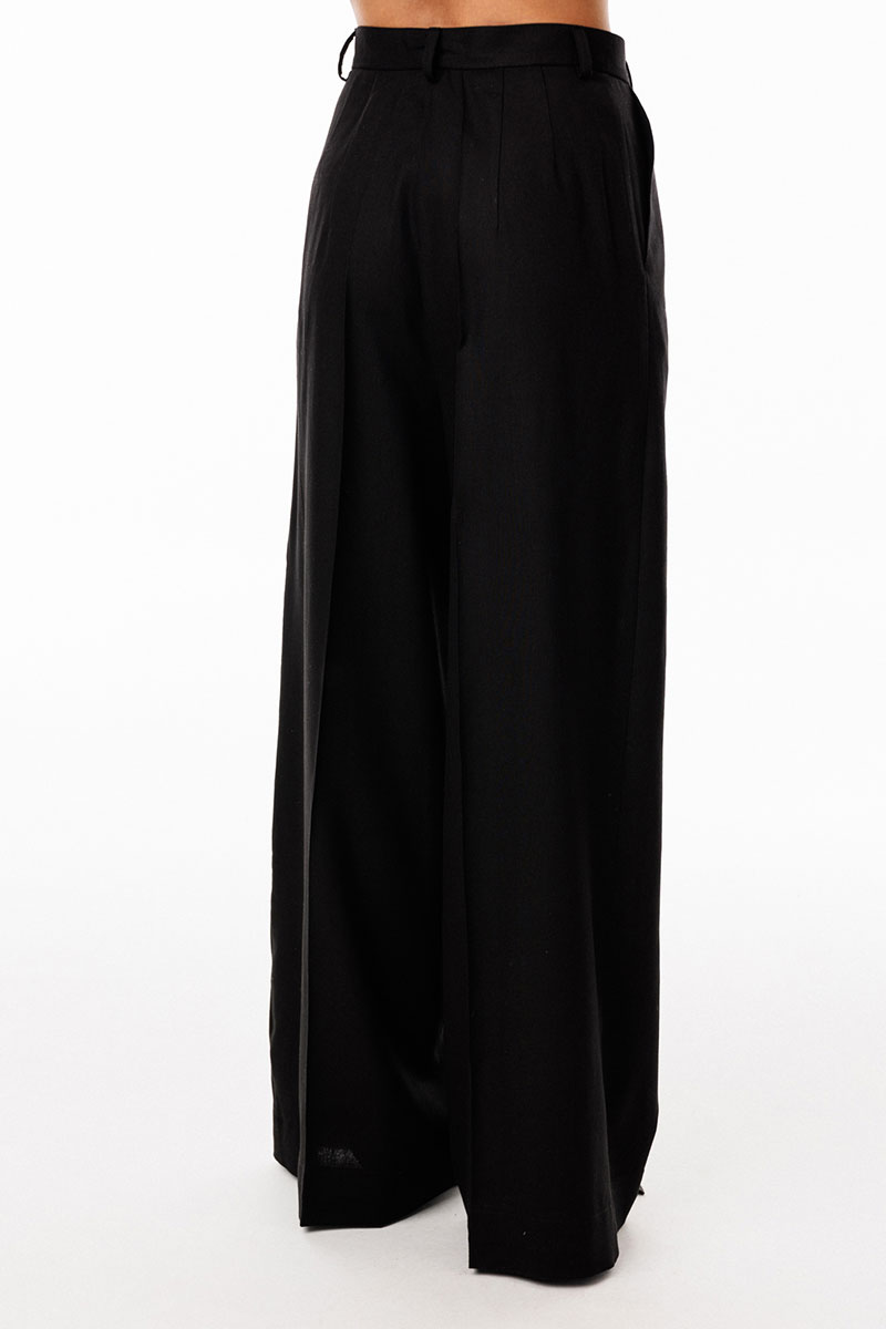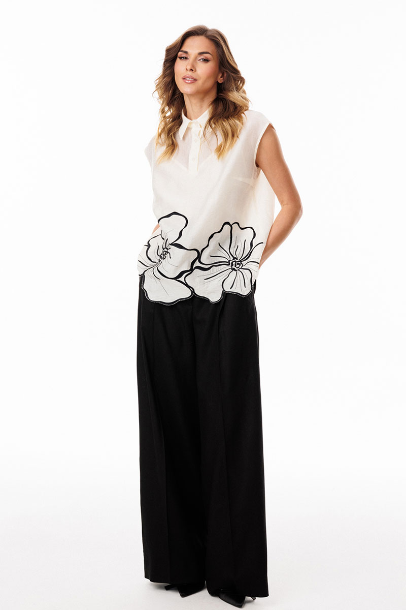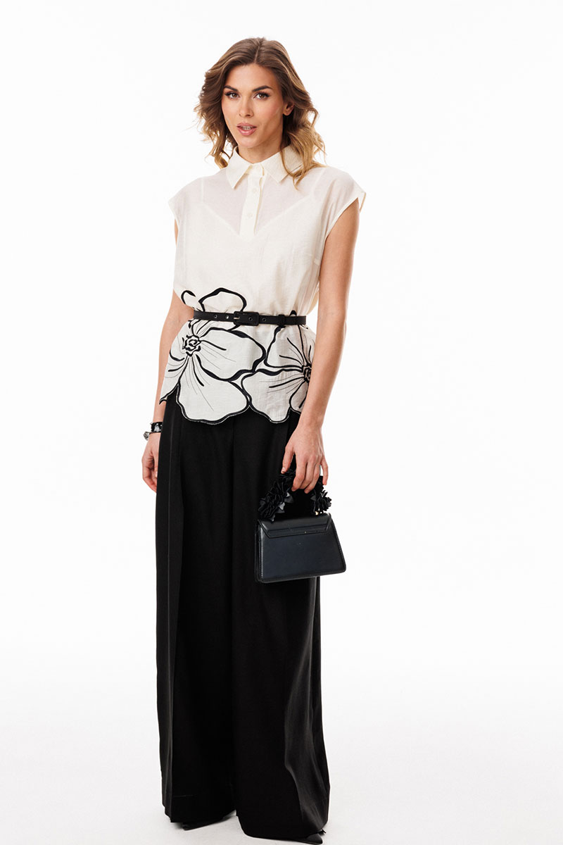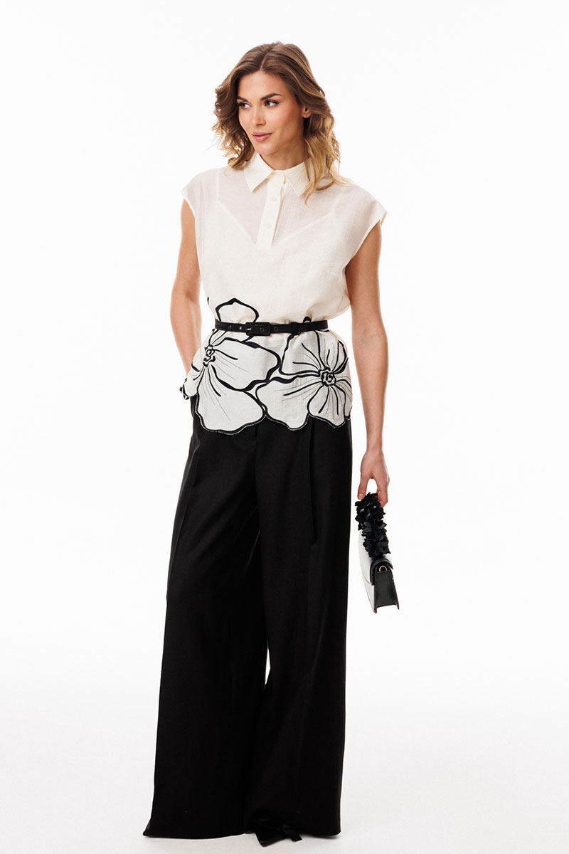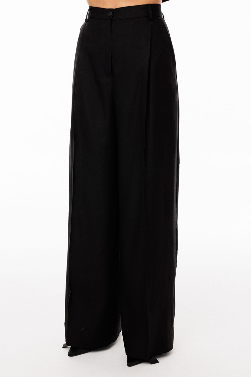 Брюки-палаццо выполнены из льна. Брюки на притачном поясе, длиной в пол, расширенные к низу. Спереди складки и боковые карманы с наклонным входом. Застежка спереди на молнию с гульфиком и пуговицу. На задних частях обработаны талиевые вытачки.
