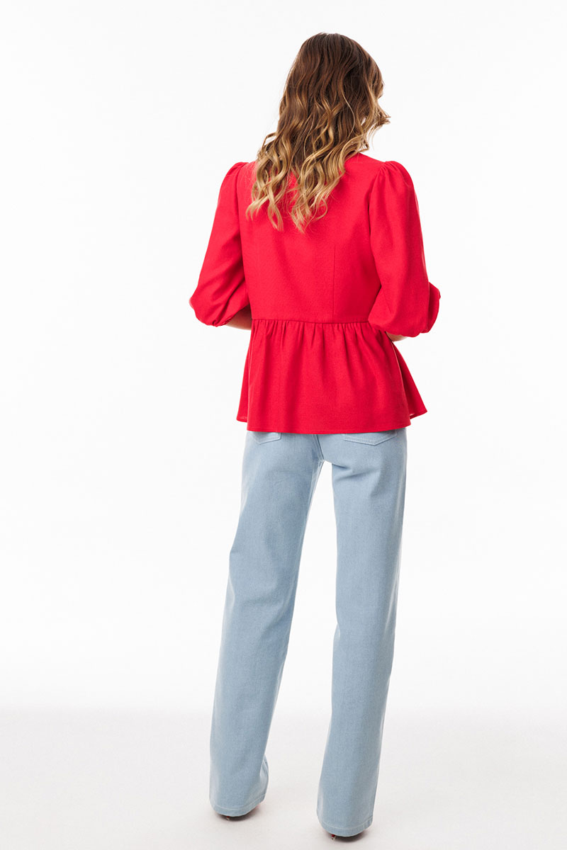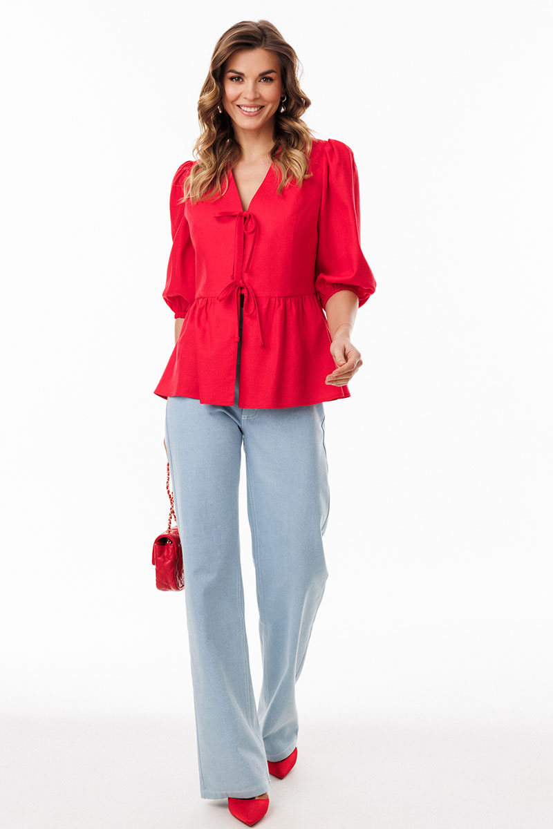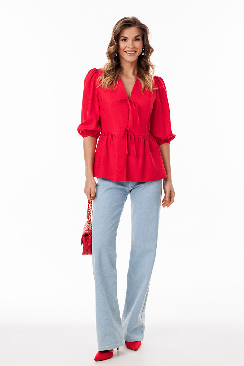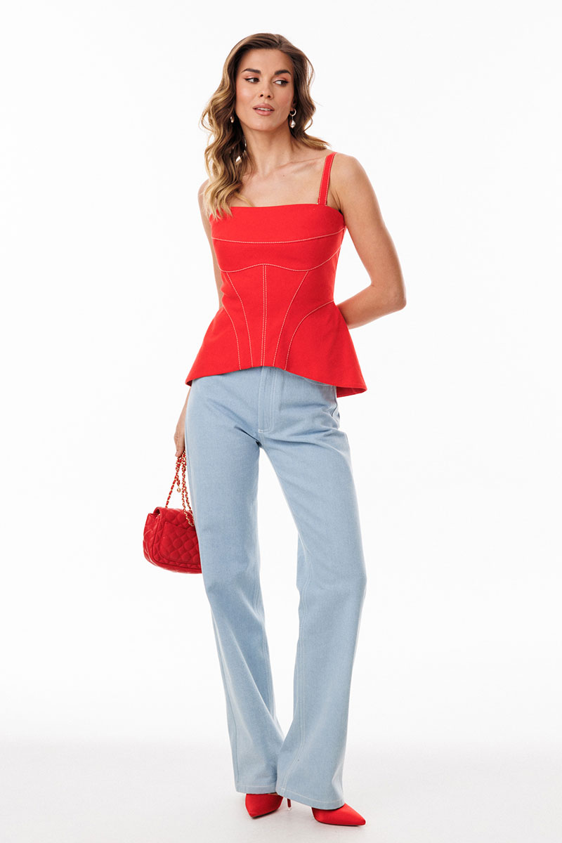 Брюки выполнены из джинса. Брюки прямого силуэта, на притачном поясе, длиной в пол. Спереди боковые карманы с фигурным входом. Застежка спереди на молнию с гульфиком и пробивную пуговицу. Сзади накладные карманы, декорированные нашивкой. Рекомендуется перед корректировкой длины изделие постирать.