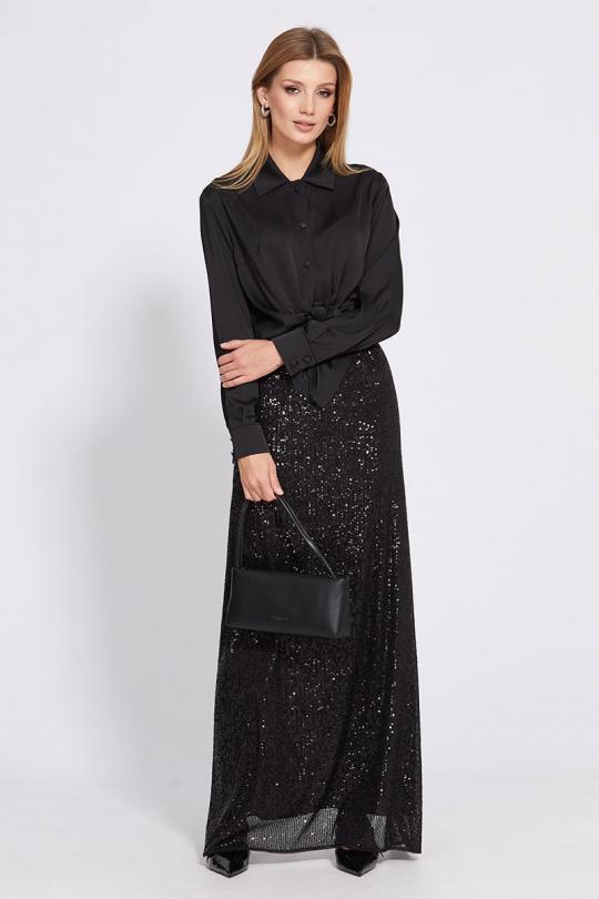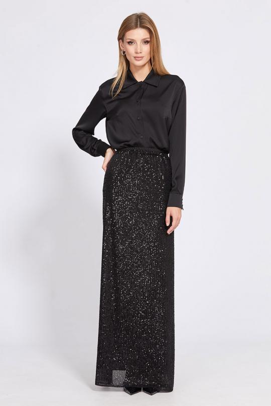 Юбка прямого силуэта, длиной в пол, из трикотажного полотна с пайетками. Сзади в среднем шве шлица. Юбка на отлетной по низу подкладке. Верх юбки на цельнокроенном поясе с эластичной тесьмой.