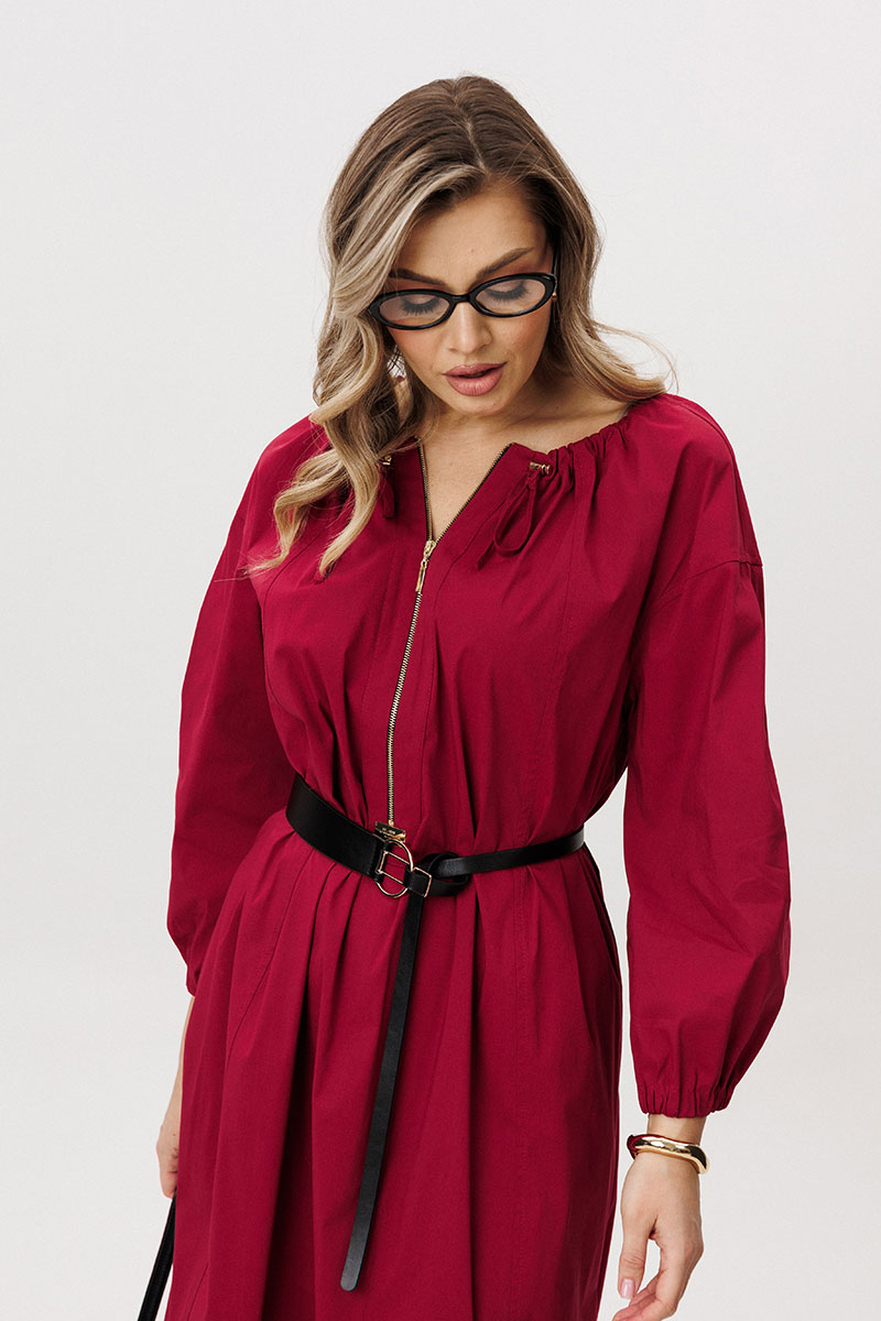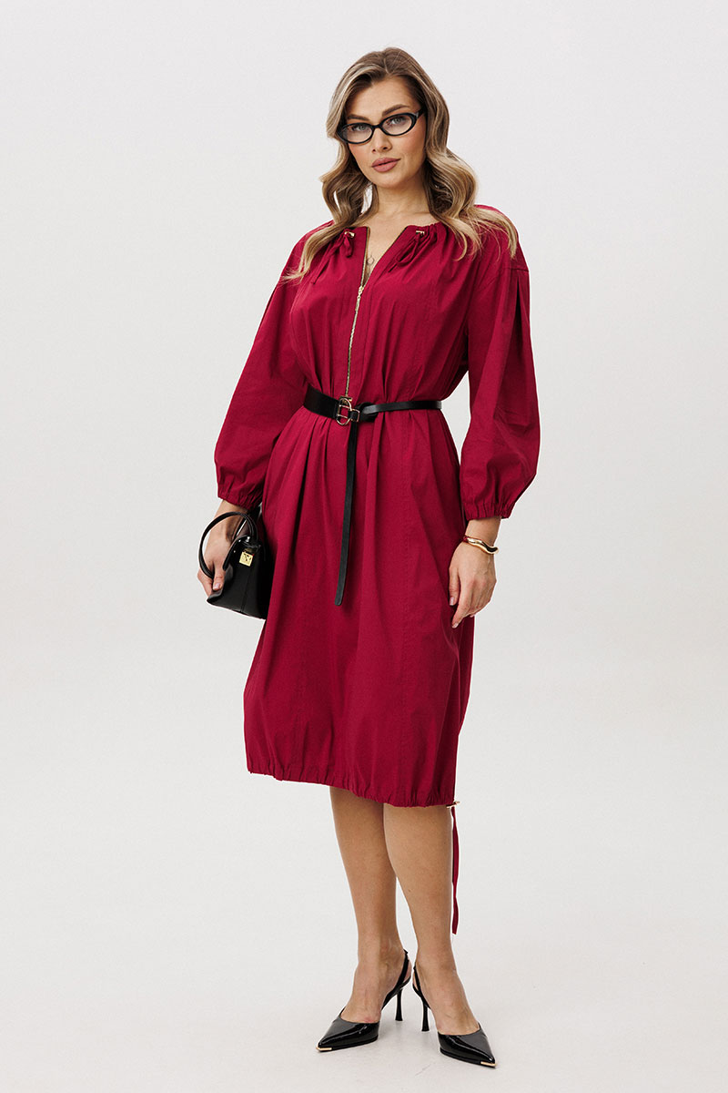 Свободный силуэт, рубашечный рукав, круглая расширенная горловина с кулисой и эластичной тесьмой. Полочка с вертикальными рельефами от горловины, застёжкой на декоративную молнию в