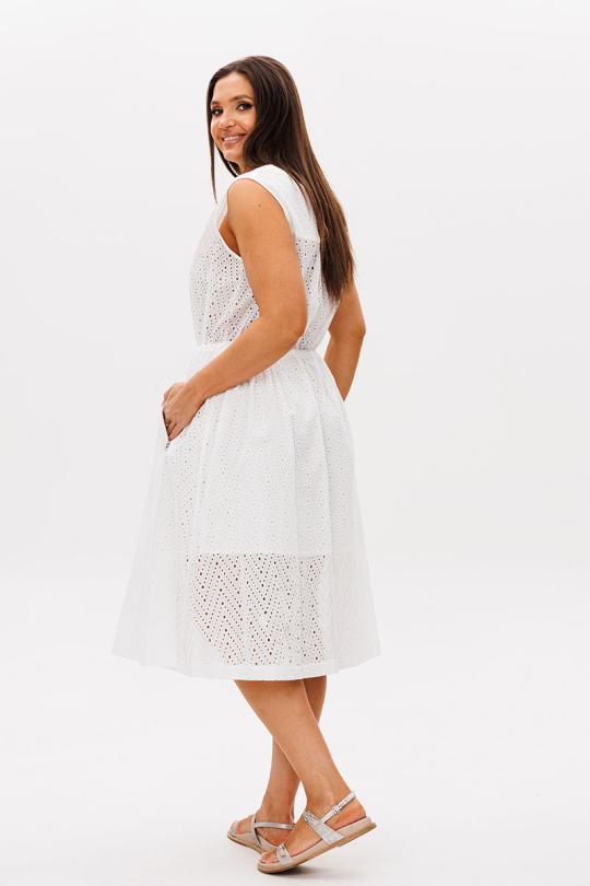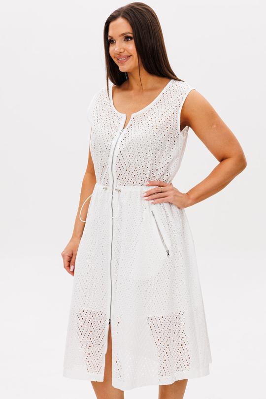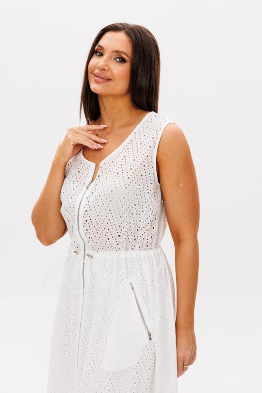 Платье без рукава с отрезным лифом и конической юбкой - силуэт песочные часы. По центру полочка - сквозная застёжка -молния. На передних полотнищах юбки - прорезной карман с молнией. По талии - кулиса с регулирующейся тесьмой и фиксаторами.