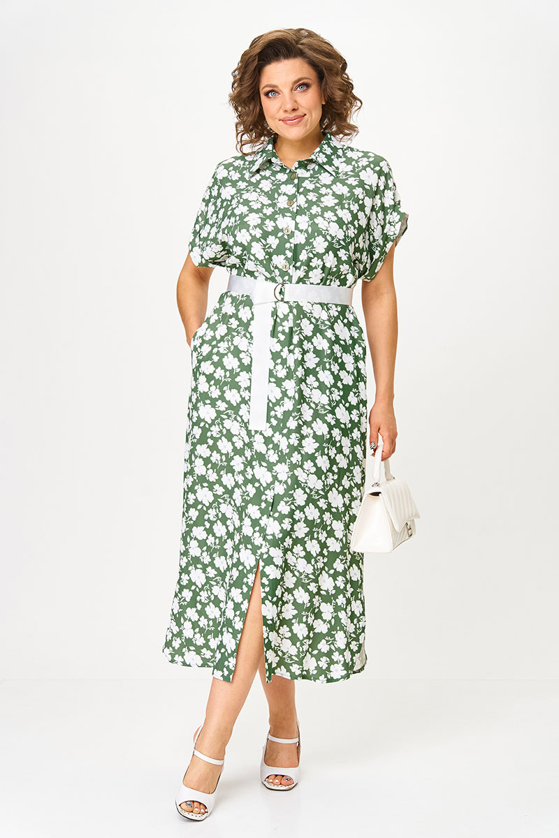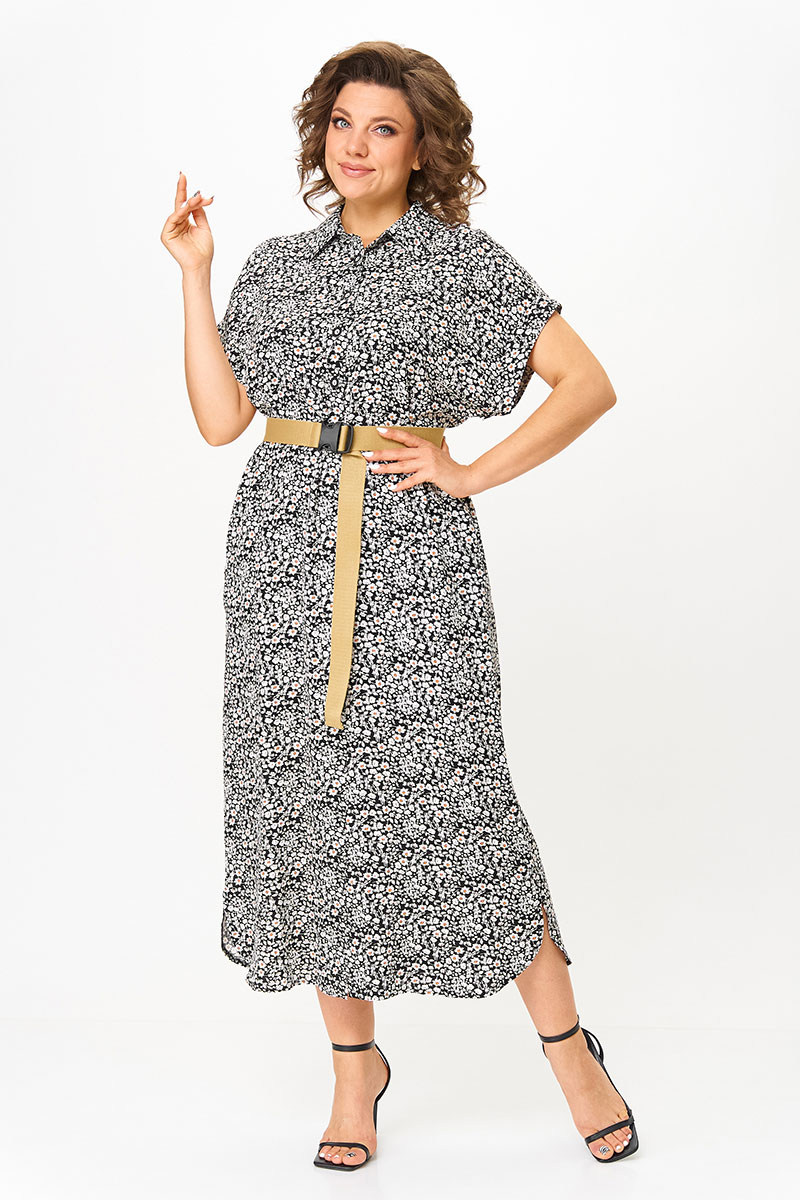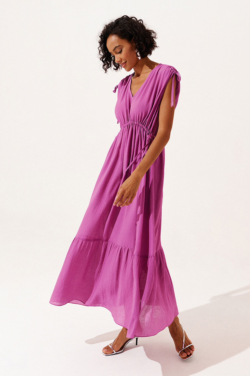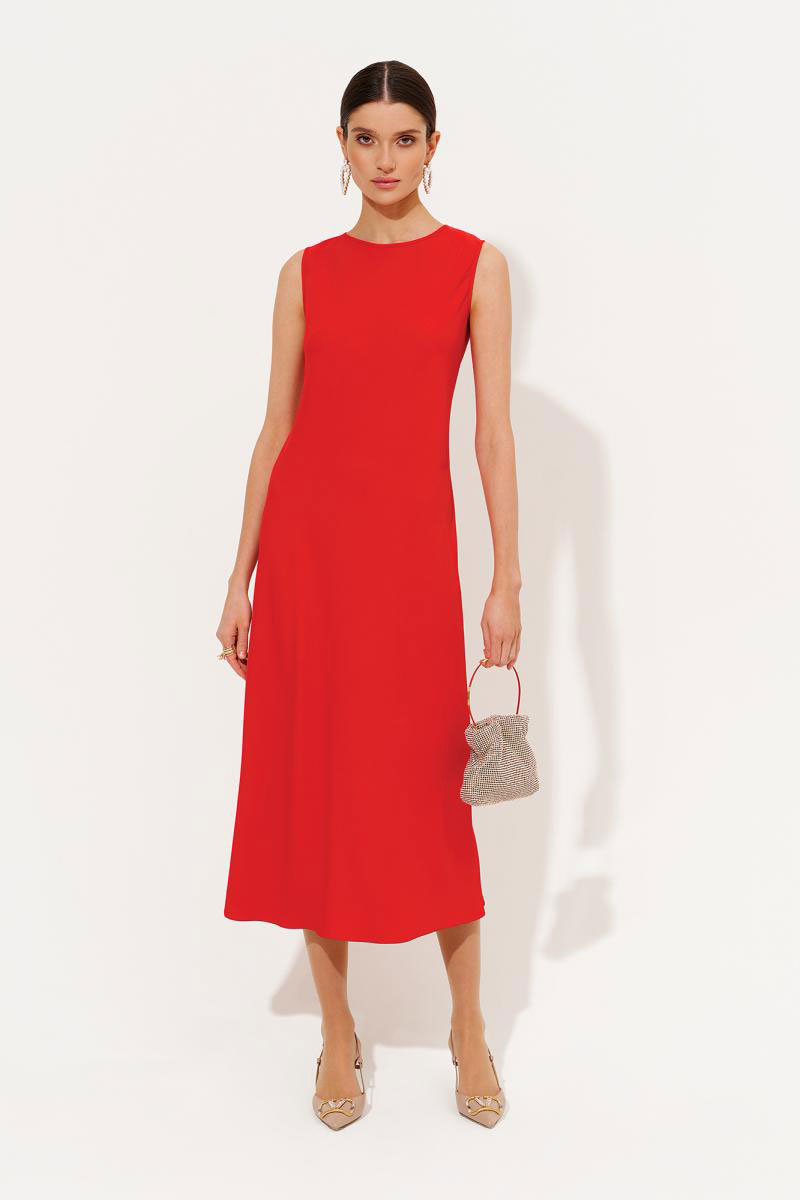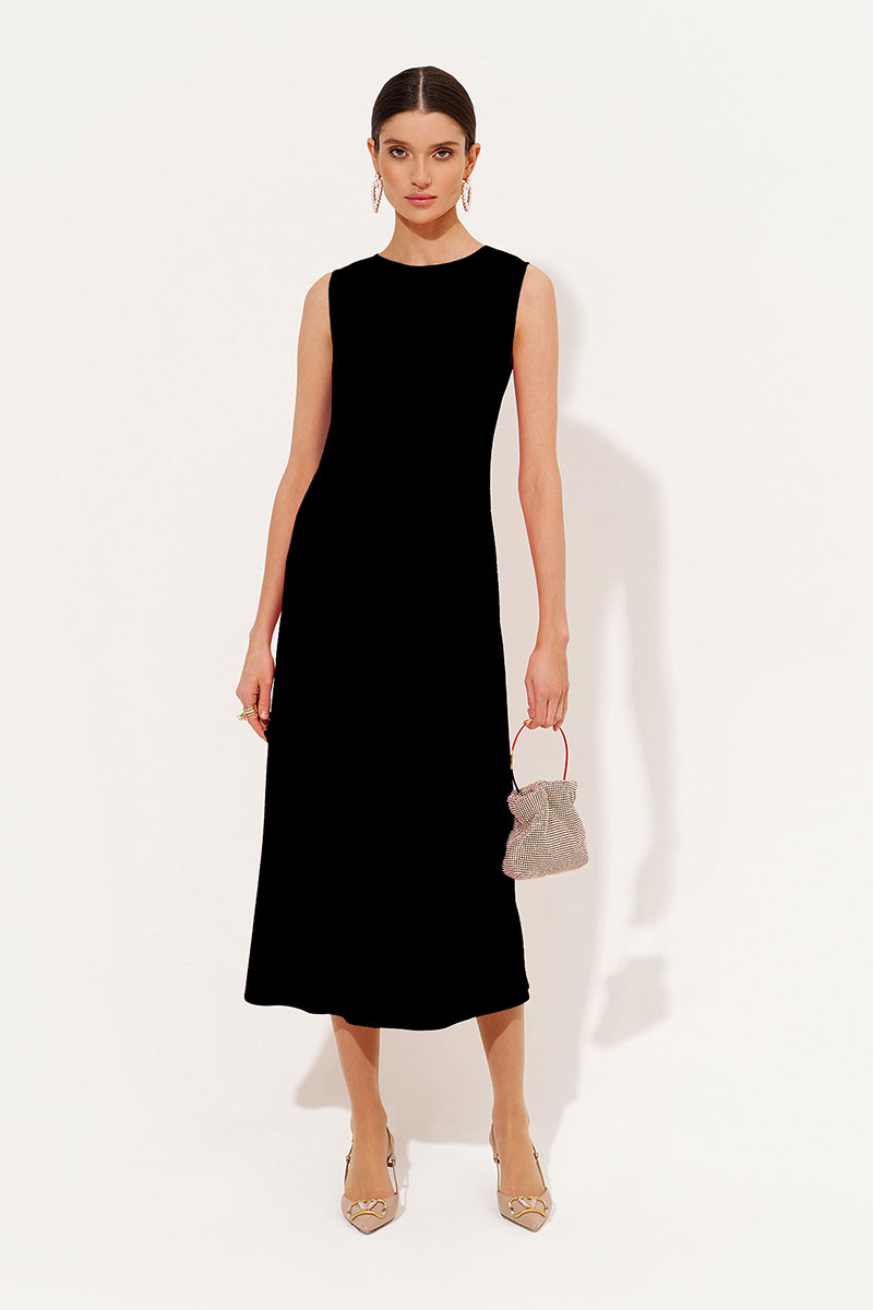 Свободный А-силуэт с цельнокроенным рукавом, ассиметричные линии членения отрезной нижней части платья с коническими вставками и эффектным разрезом. Оригинальный вырез горловины с завязкой-бантом на спинке.