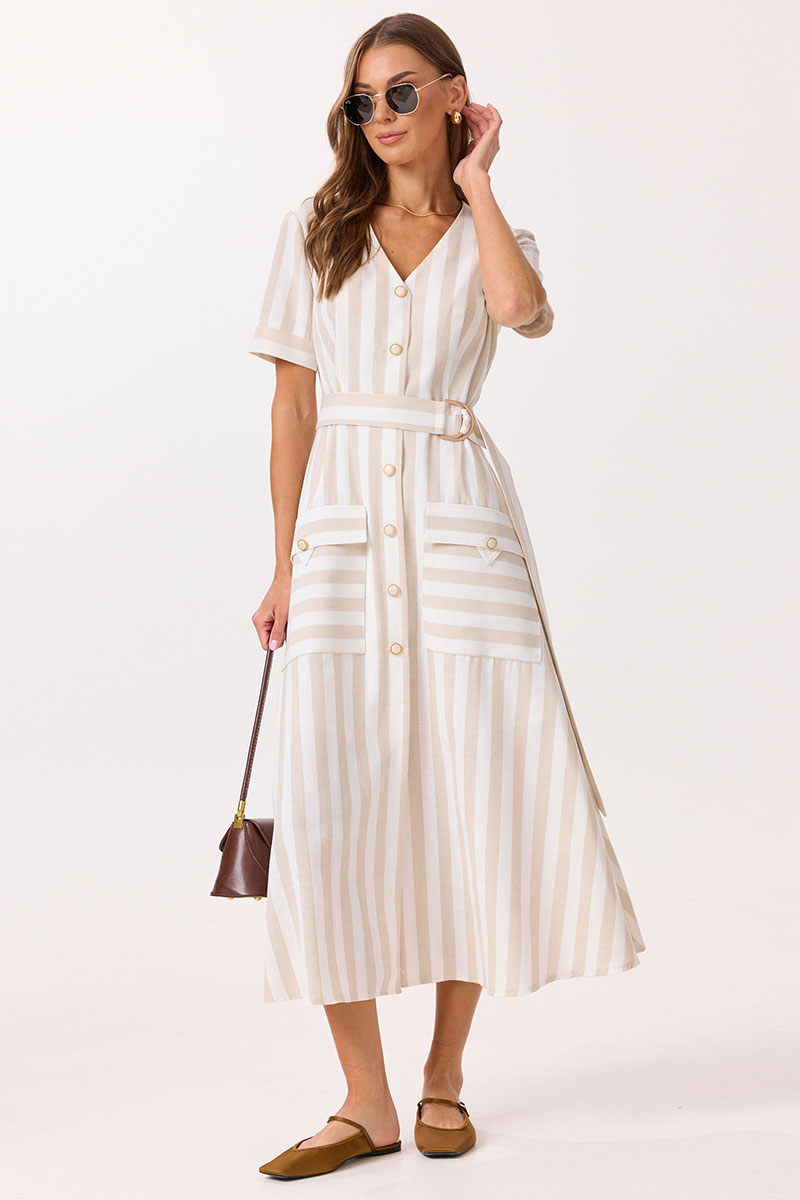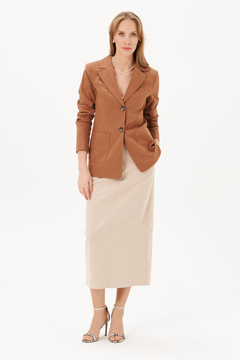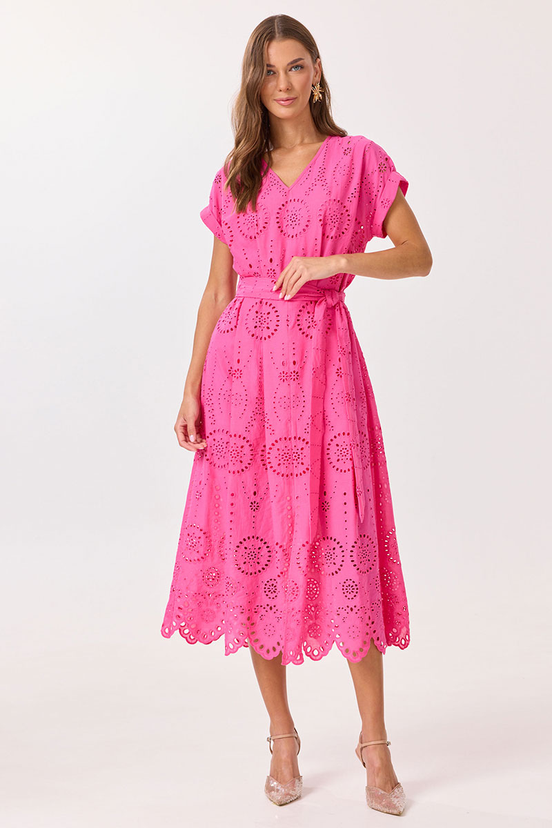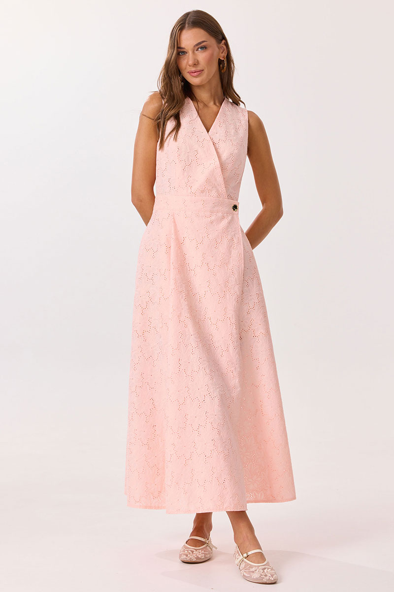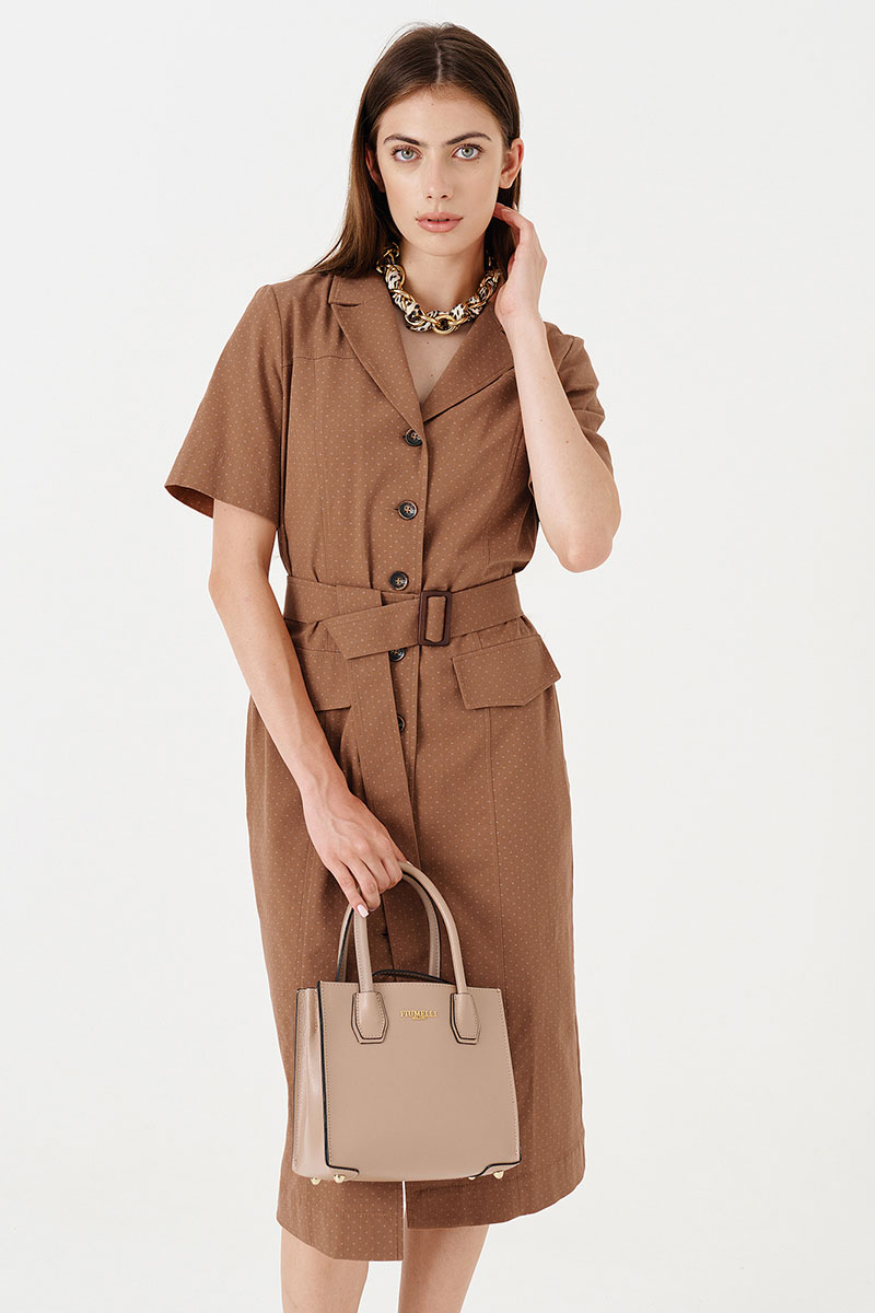 Свободный А-силуэт с цельнокроенным рукавом, ассиметричные линии членения отрезной нижней части платья с коническими вставками и эффектным разрезом. Оригинальный вырез горловины с завязкой-бантом на спинке.