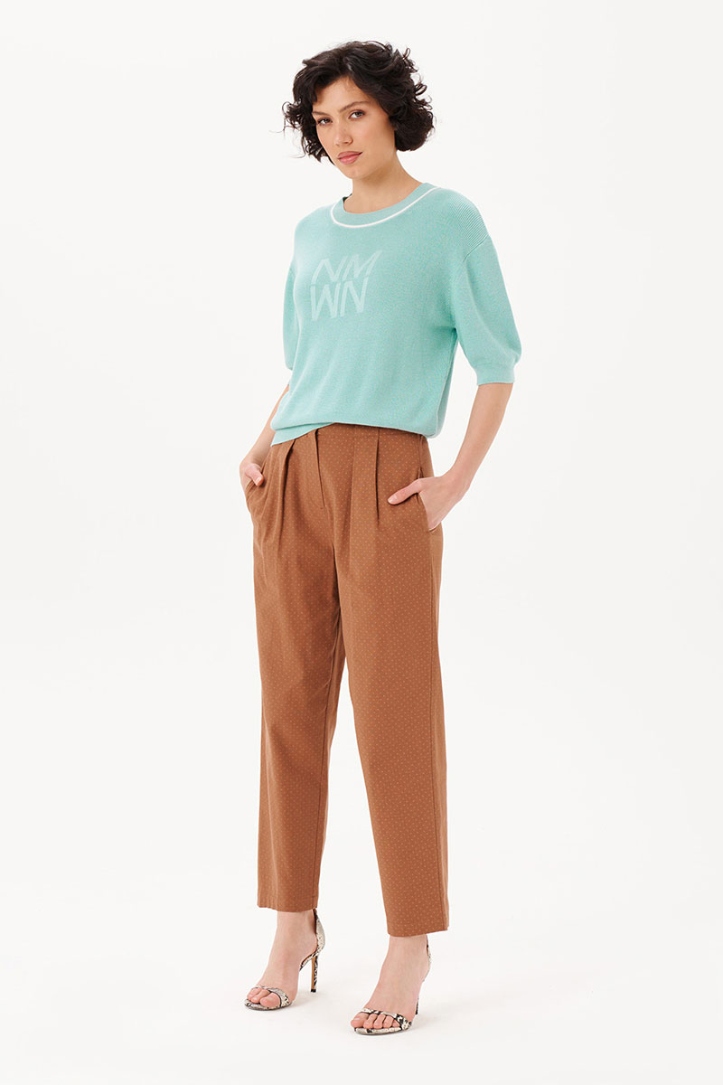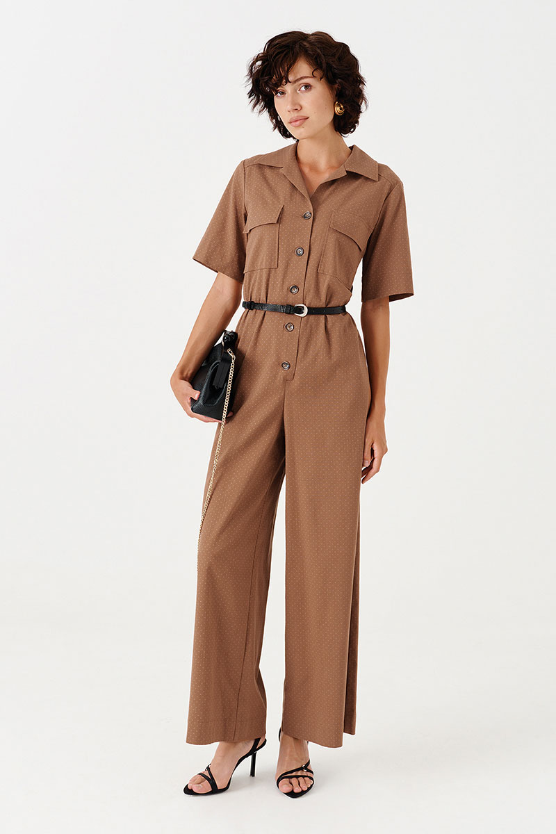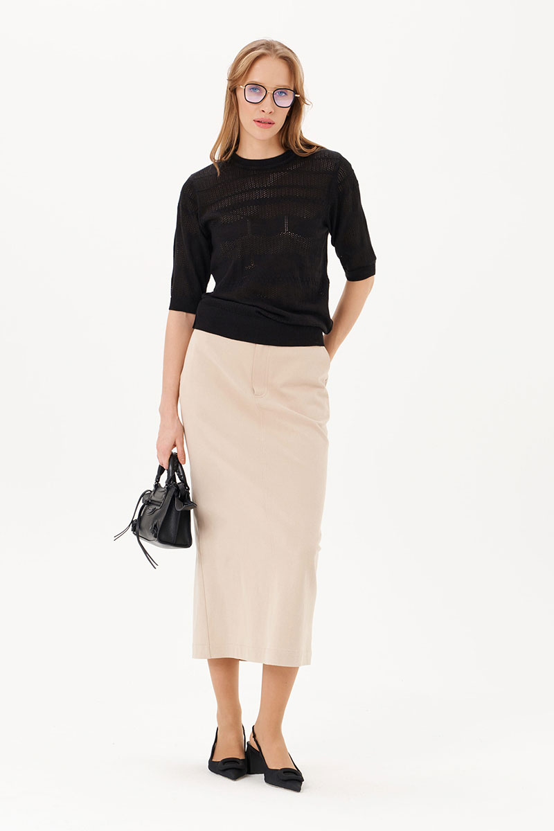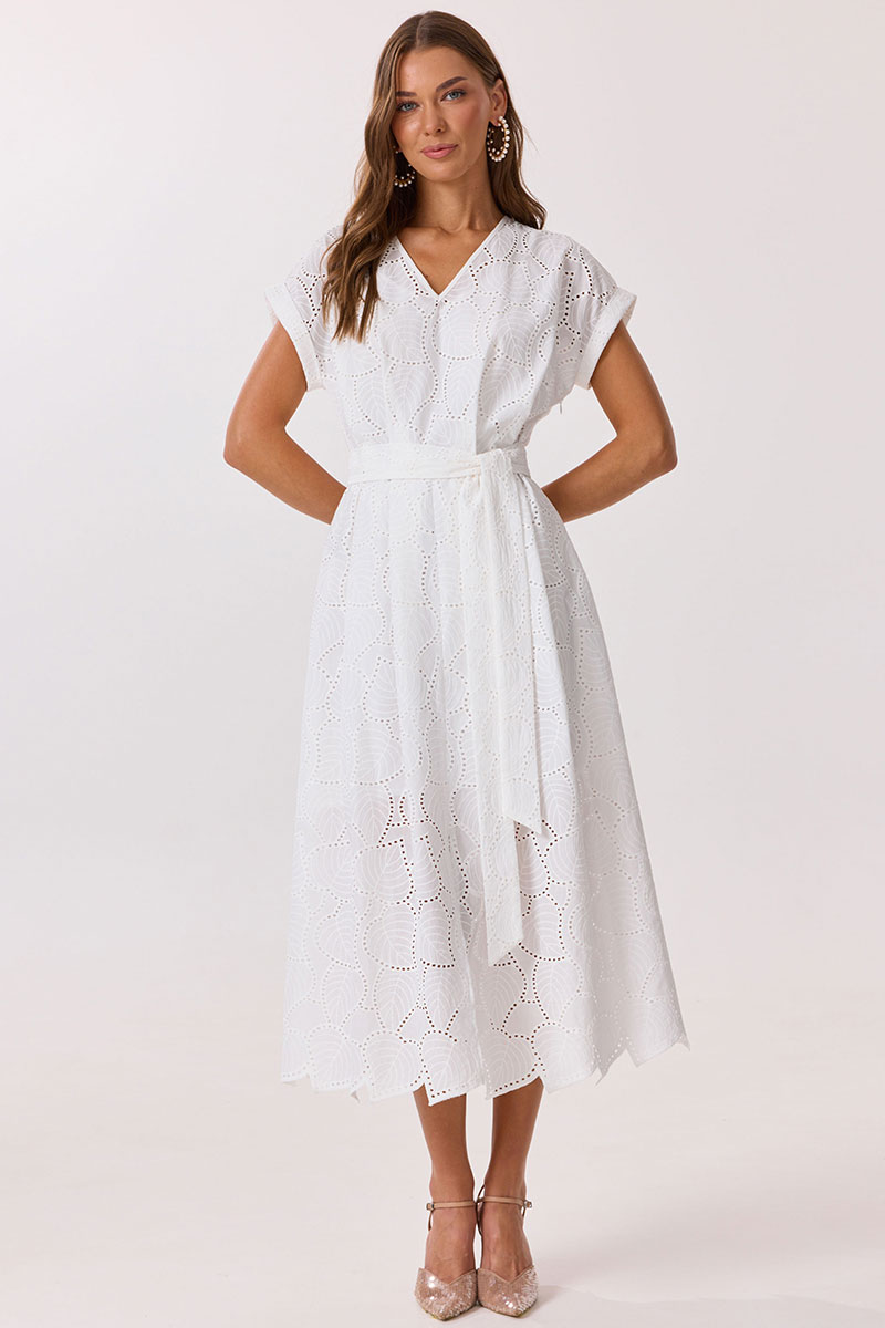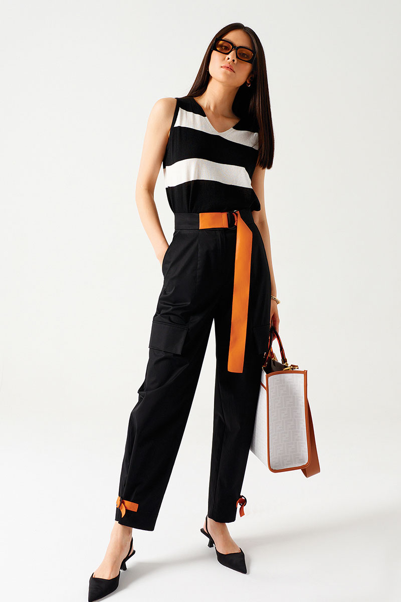 Свободный А-силуэт с цельнокроенным рукавом, ассиметричные линии членения отрезной нижней части платья с коническими вставками и эффектным разрезом. Оригинальный вырез горловины с завязкой-бантом на спинке.