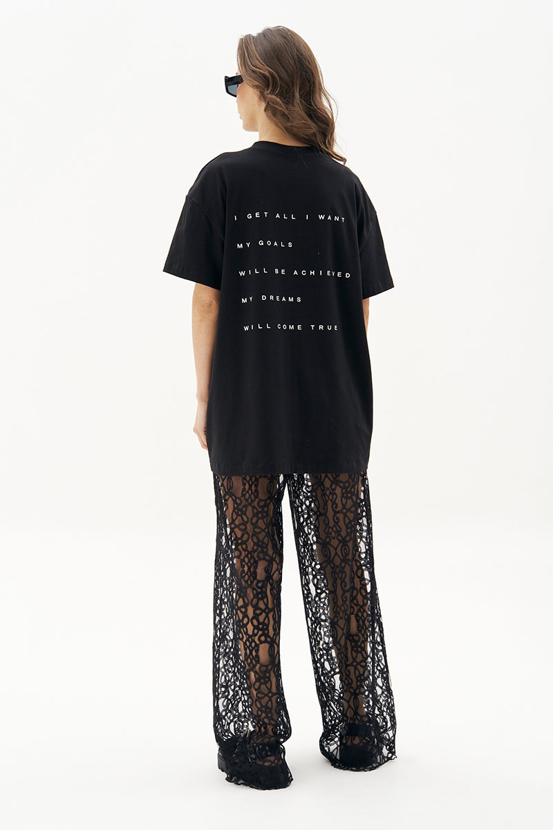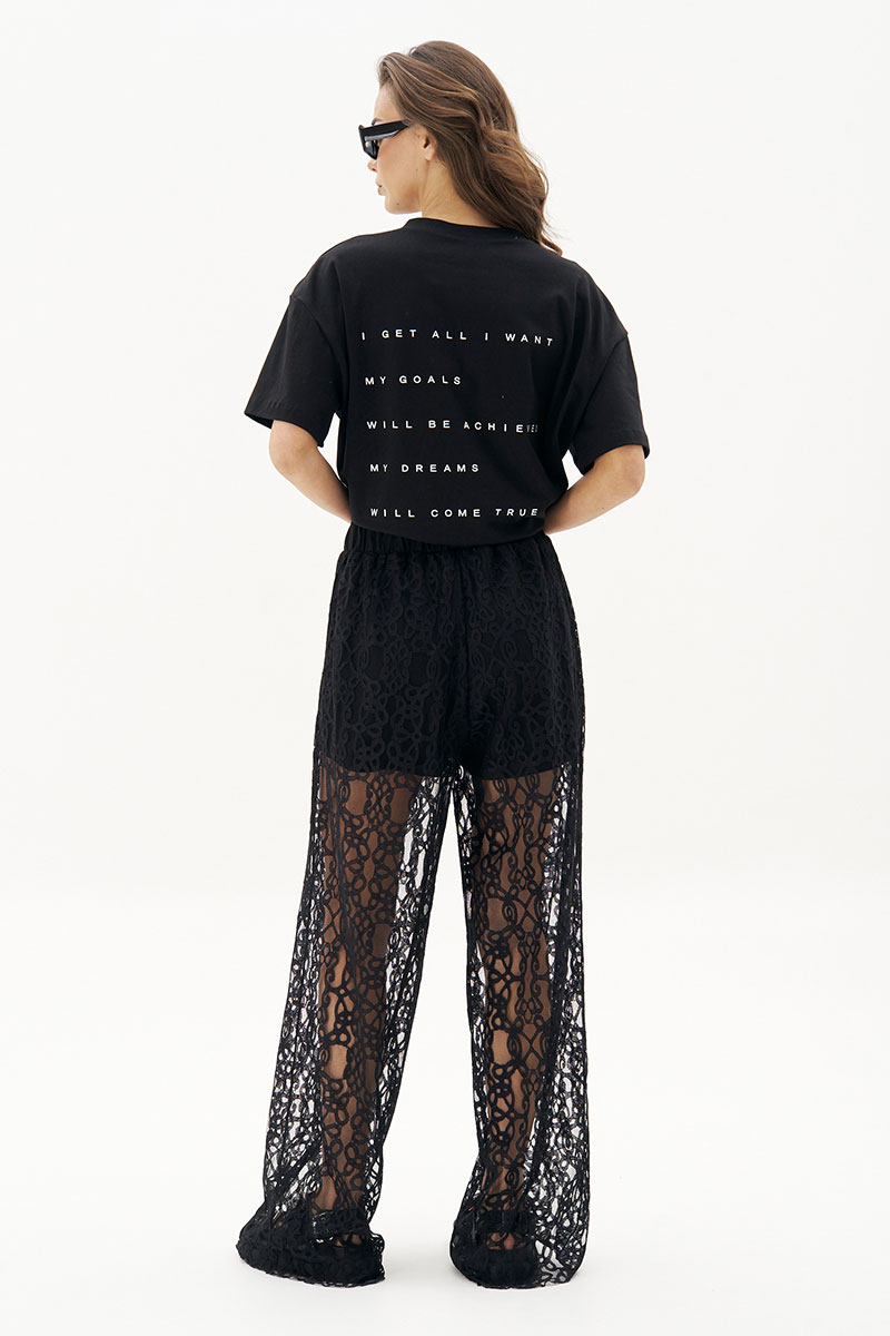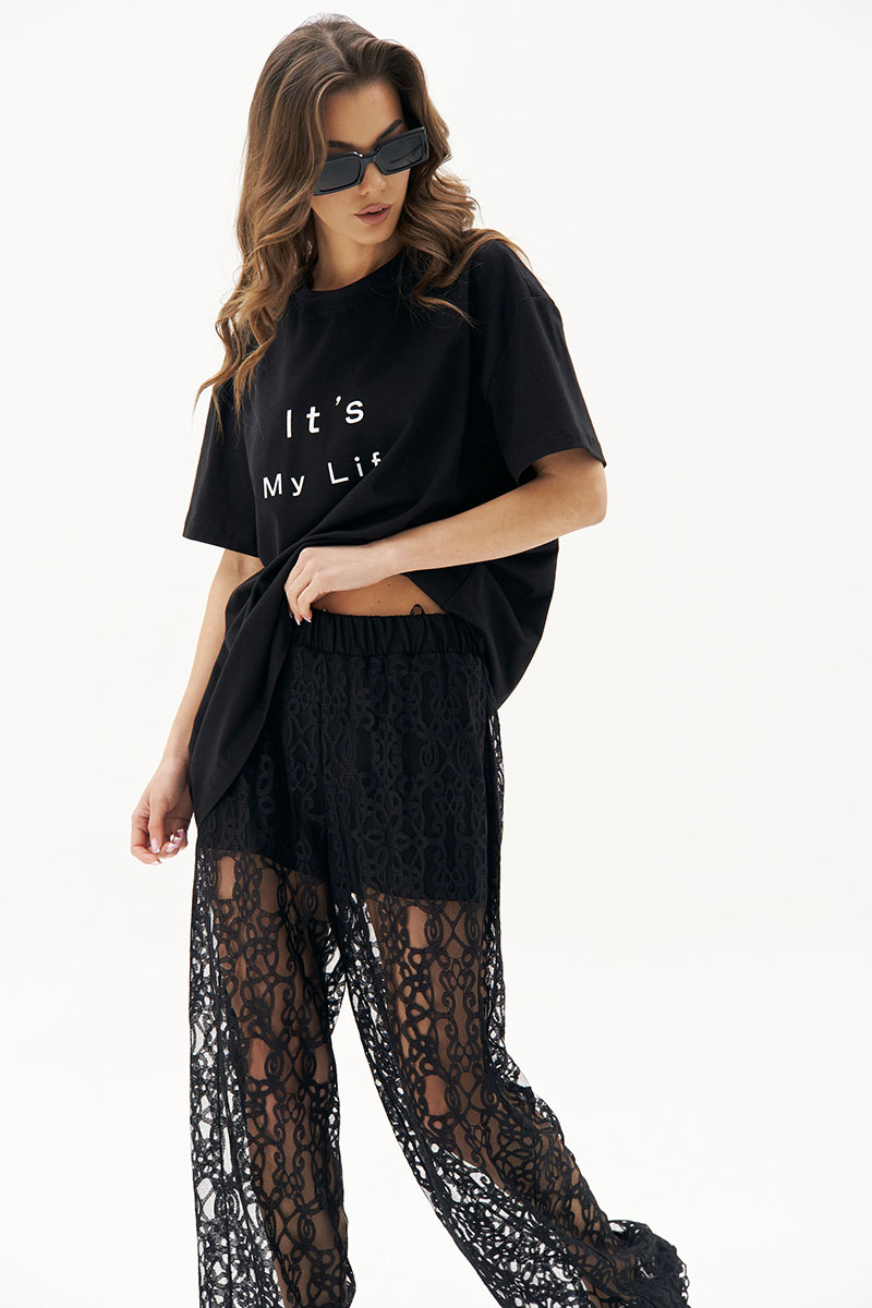 Свободная футболка и гипюровые брюки с эластичными шортами внутри.