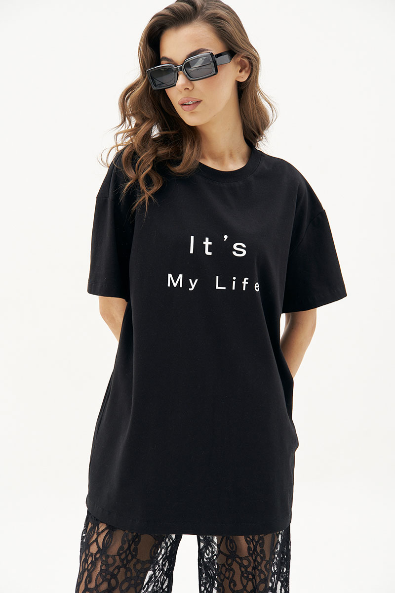 Футболка широкая, удлинённая, с дизайнерским принтом и заниженной линией плеча.