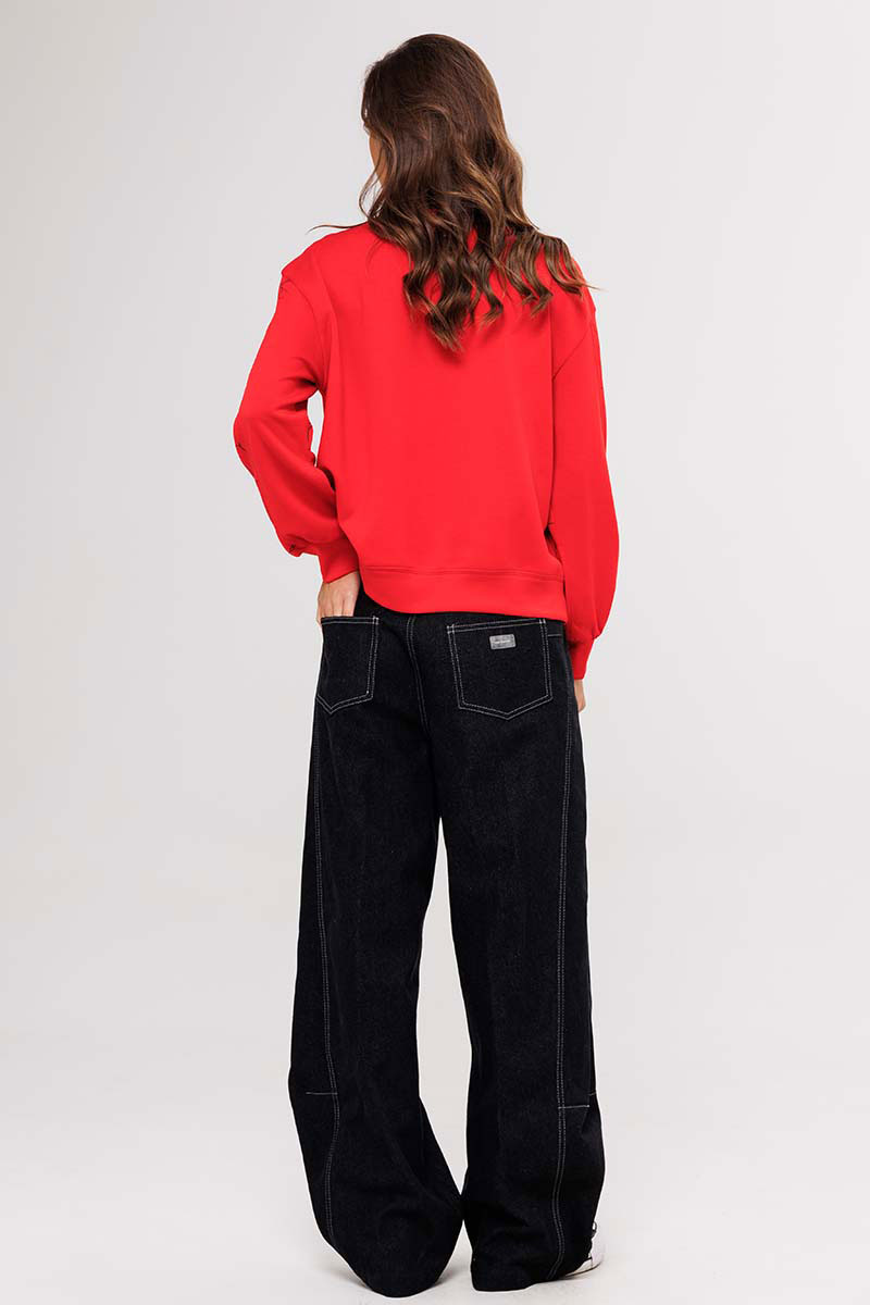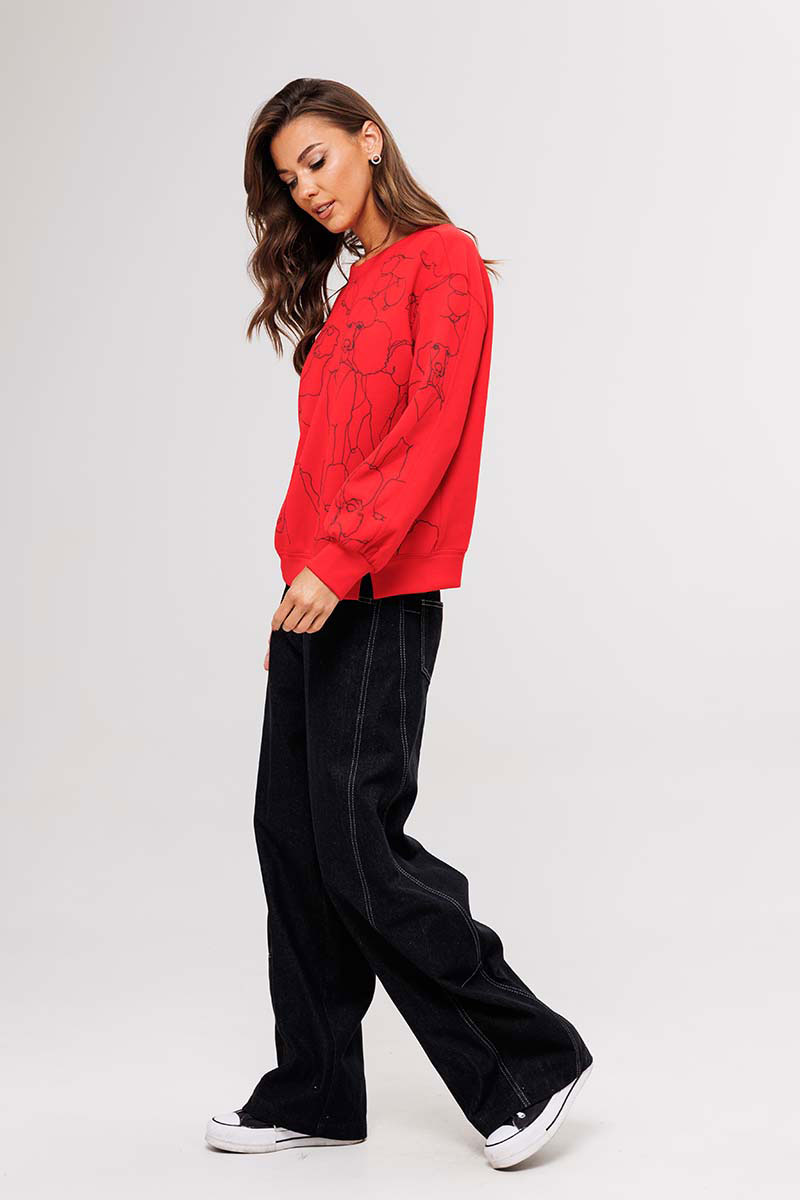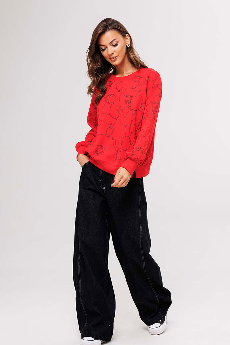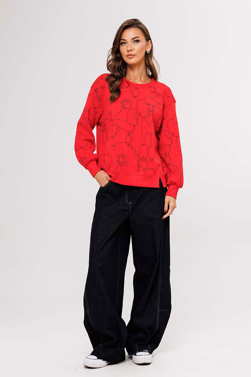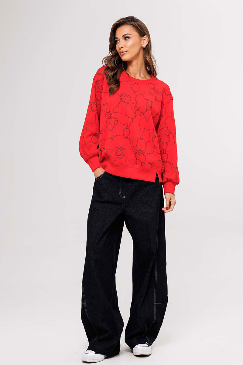 Свободный оверсайз джемпер с заниженной линией плеча, рукавом расширенным в области оката и дизайнерским принтом. По низу изделия и рукавов - притачной эластичный манжет. Рукав из 4-х частей с эффектным разрезом в области запястья.