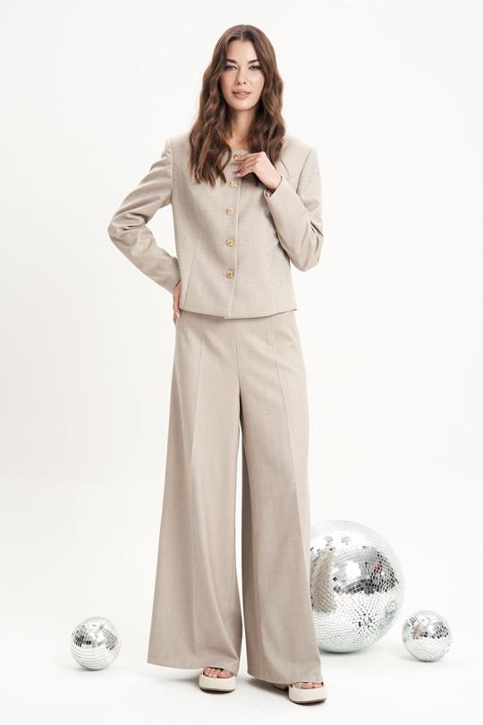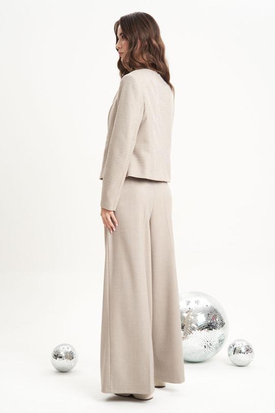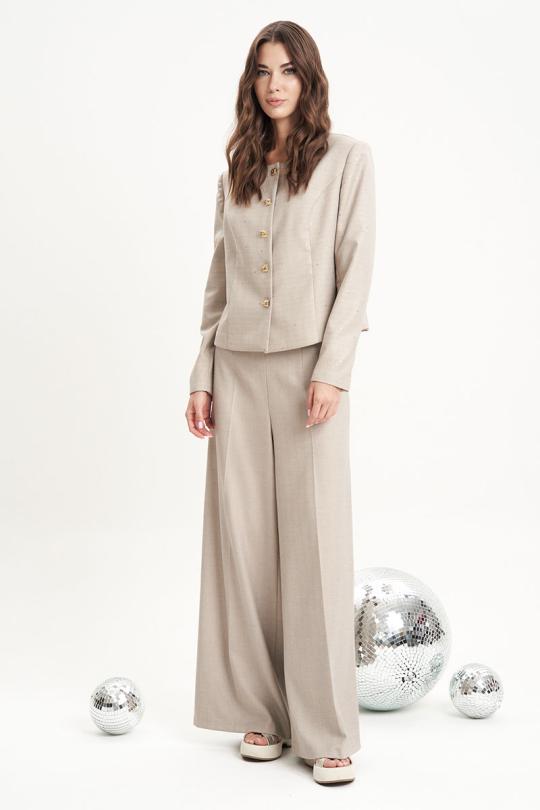 Жакет из необычного по текстуре материала с вкраплением пайетки, брюки из полотна без пайетки. Полуприлегающий силуэт пиджака с центральной застёжкой, круглым вырезом горловины и