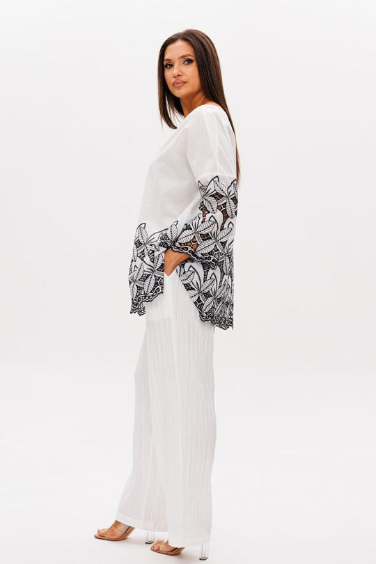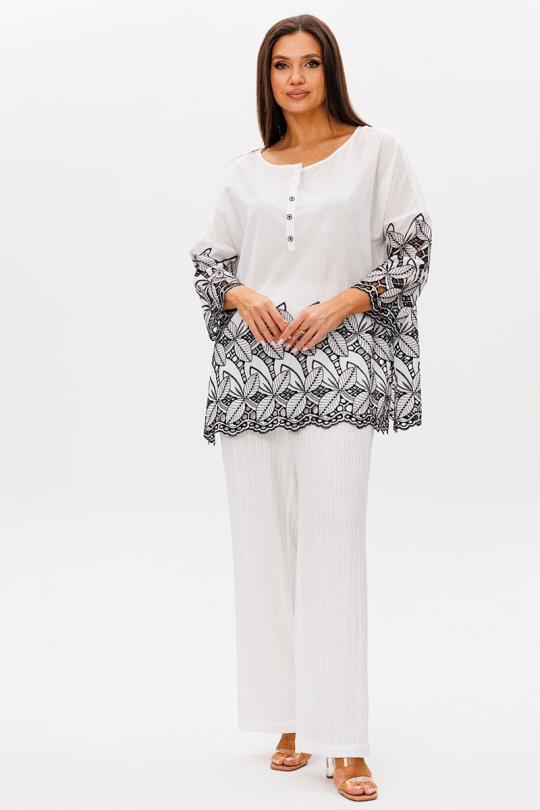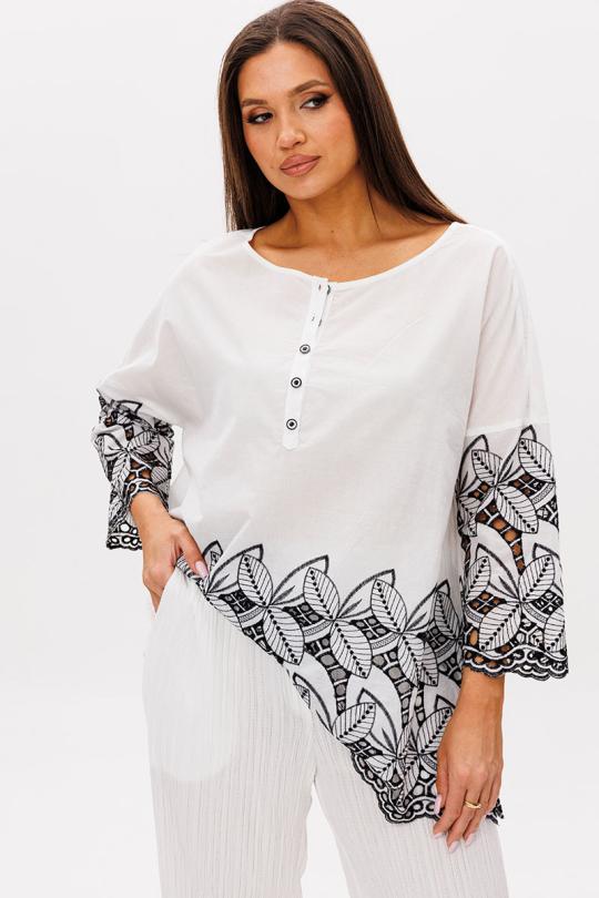 Свободная блуза-туника из хлопчатобумажного батиста с контрастной вышивкой. Рубашечный покрой, круглая расширенная горловина, частичная застежка в верхней части полочки, рукав длины