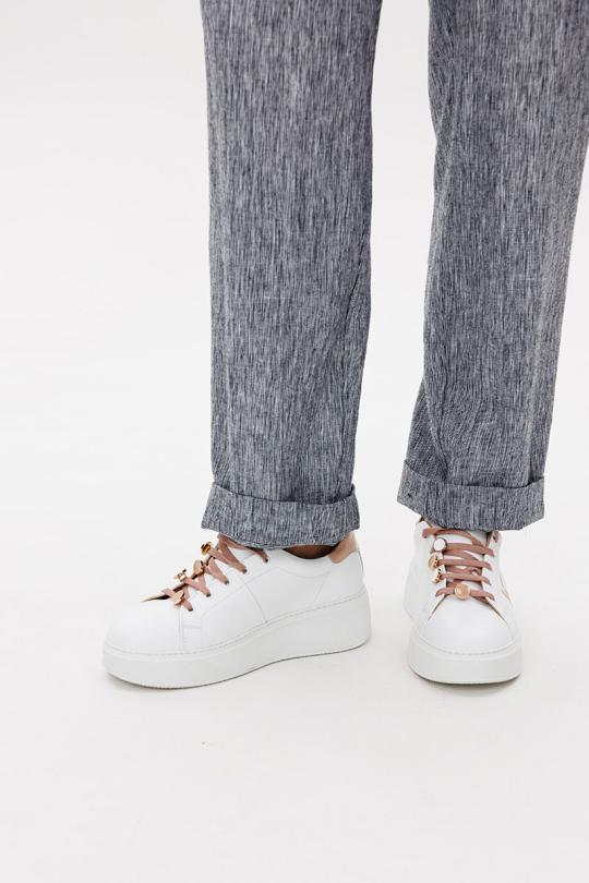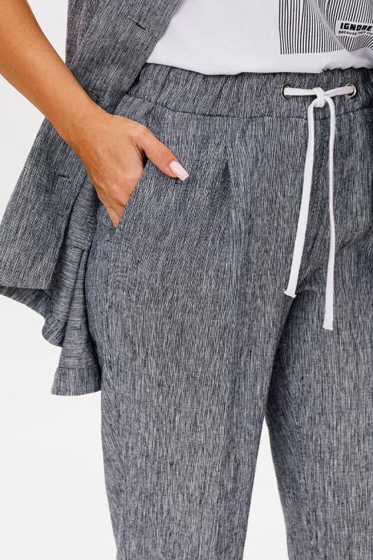 Брюки в расслабленном стиле, слегка зауженные к низу, на притачном эластичном поясе с люверсами и отделочным шнуром, с наклонными боковыми карманами и мягкой складкой на передних