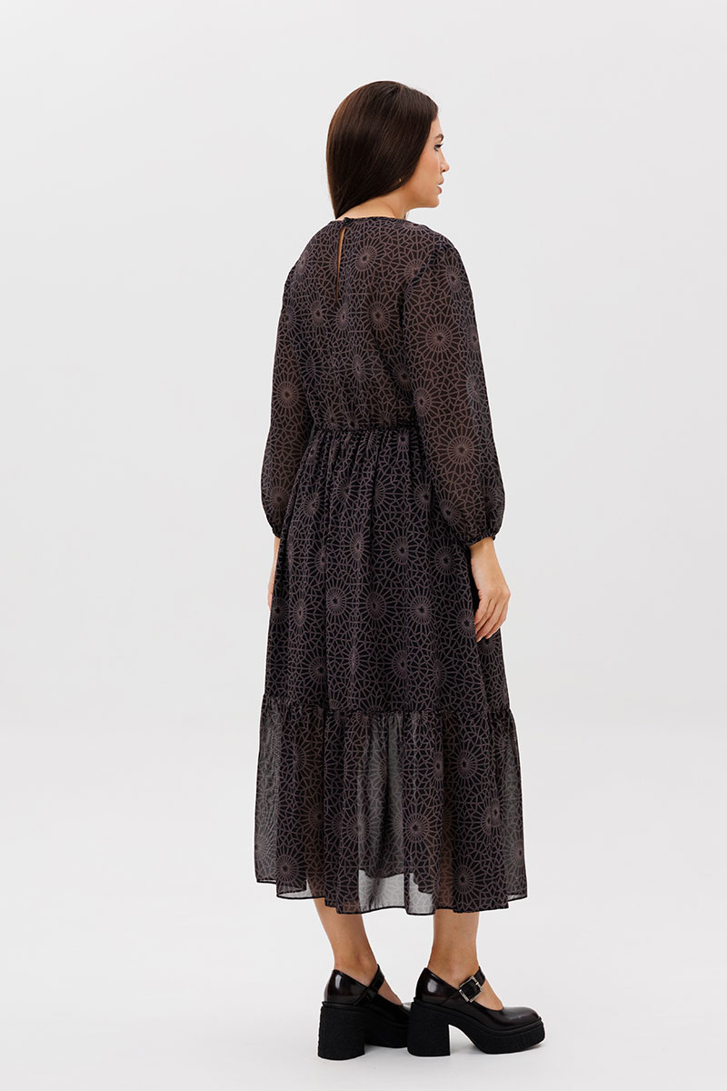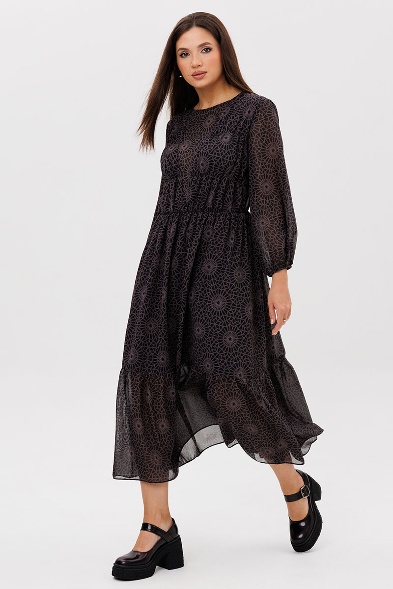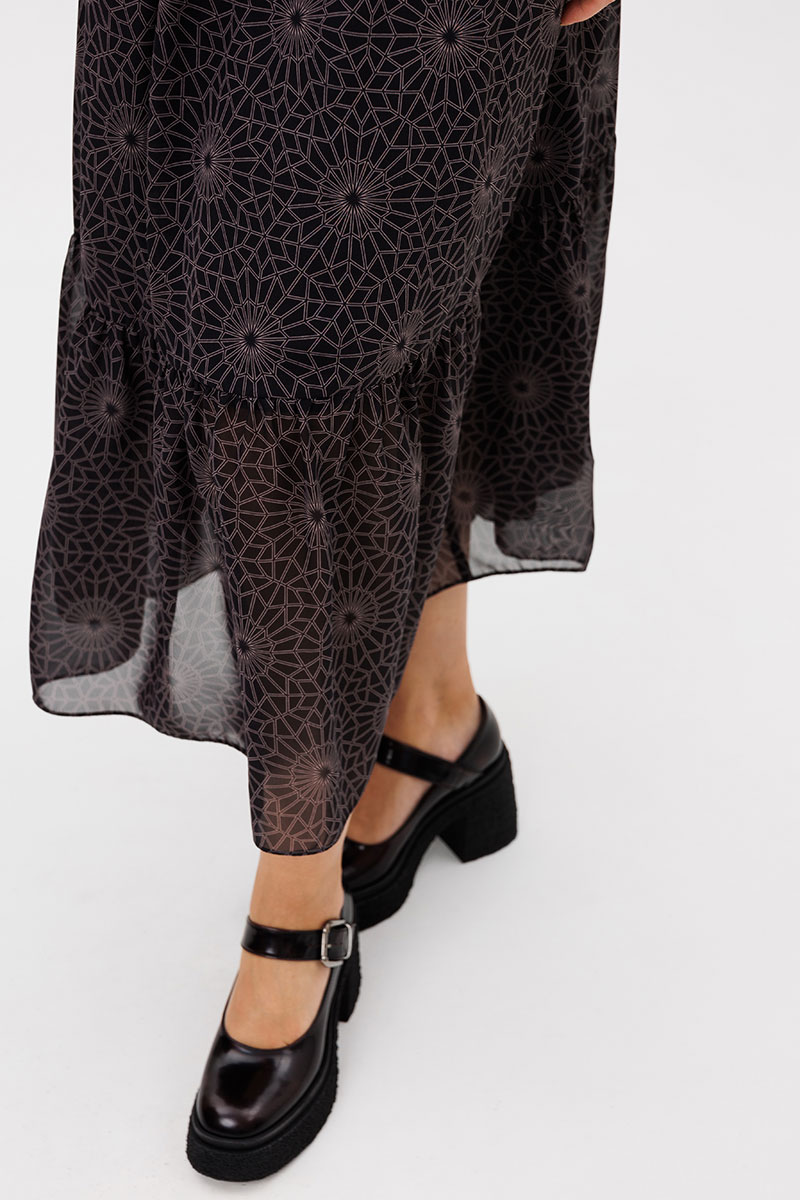 Легкое и воздушное, микс нежности и дерзости, воплощенный в комбинации противоположностей: нежного шифона и геометрического принта. А-образный силуэт, втачной рукав, со сборкой по