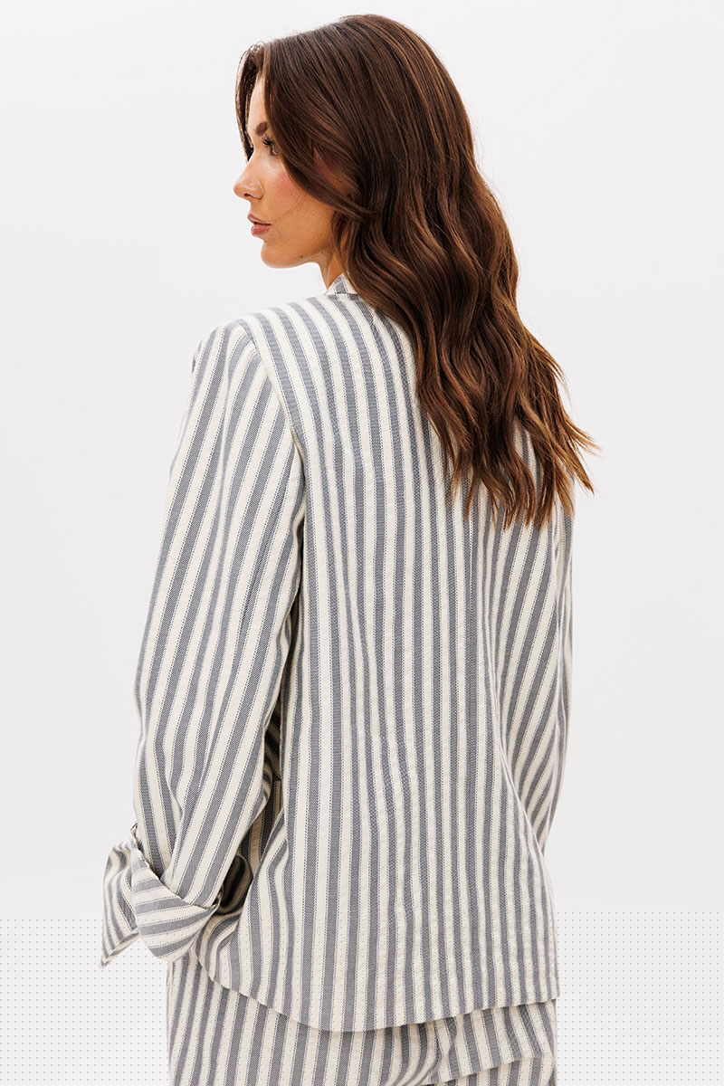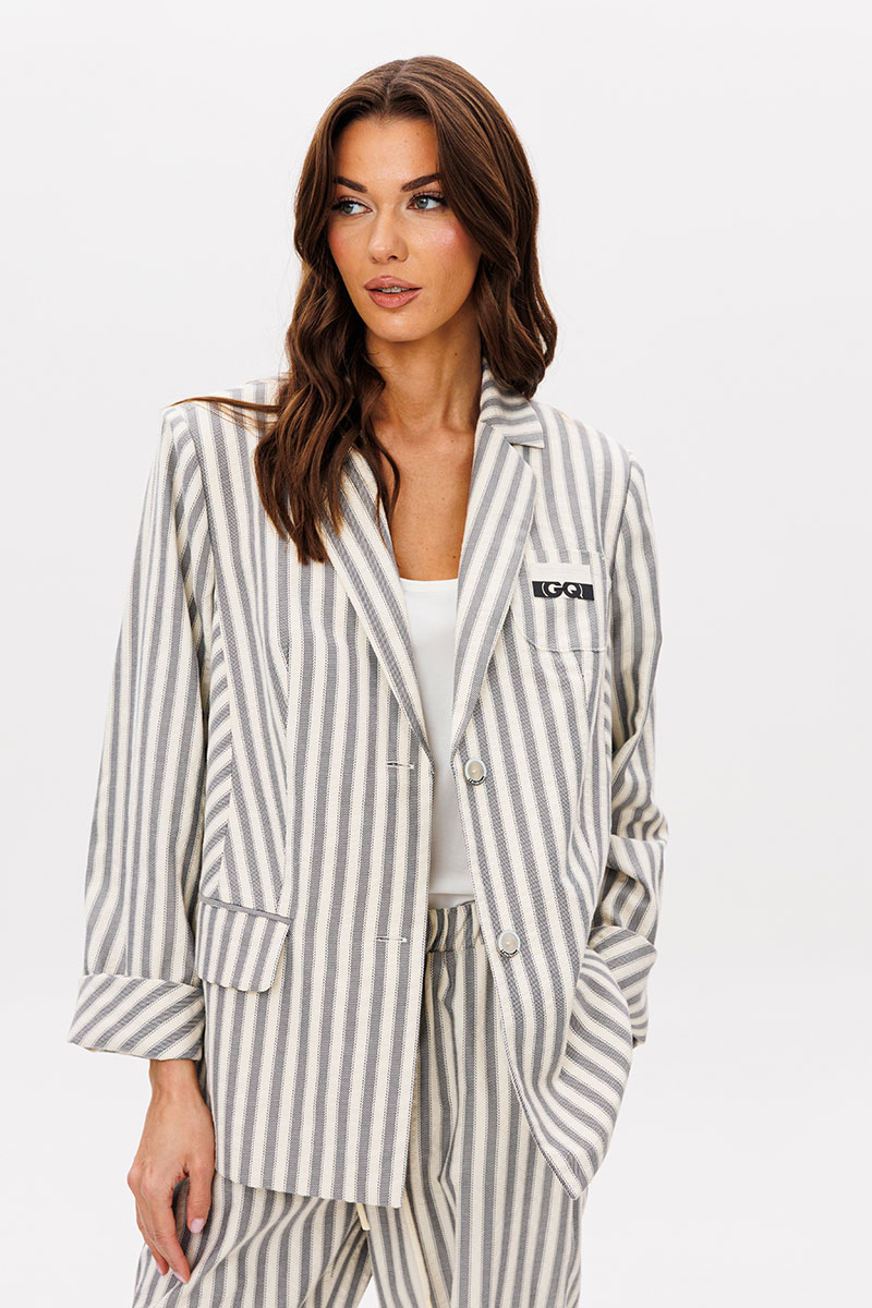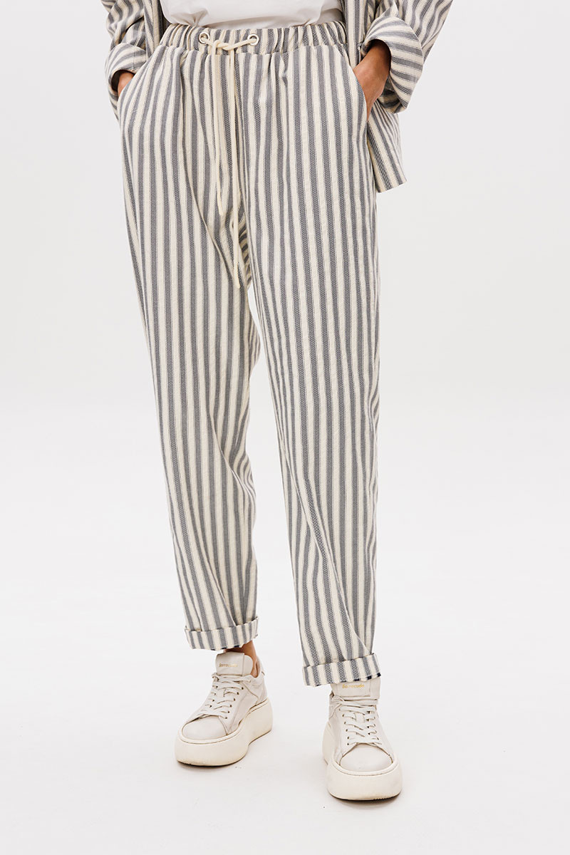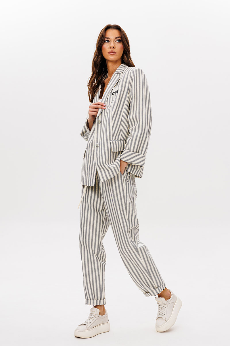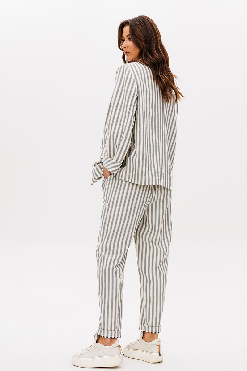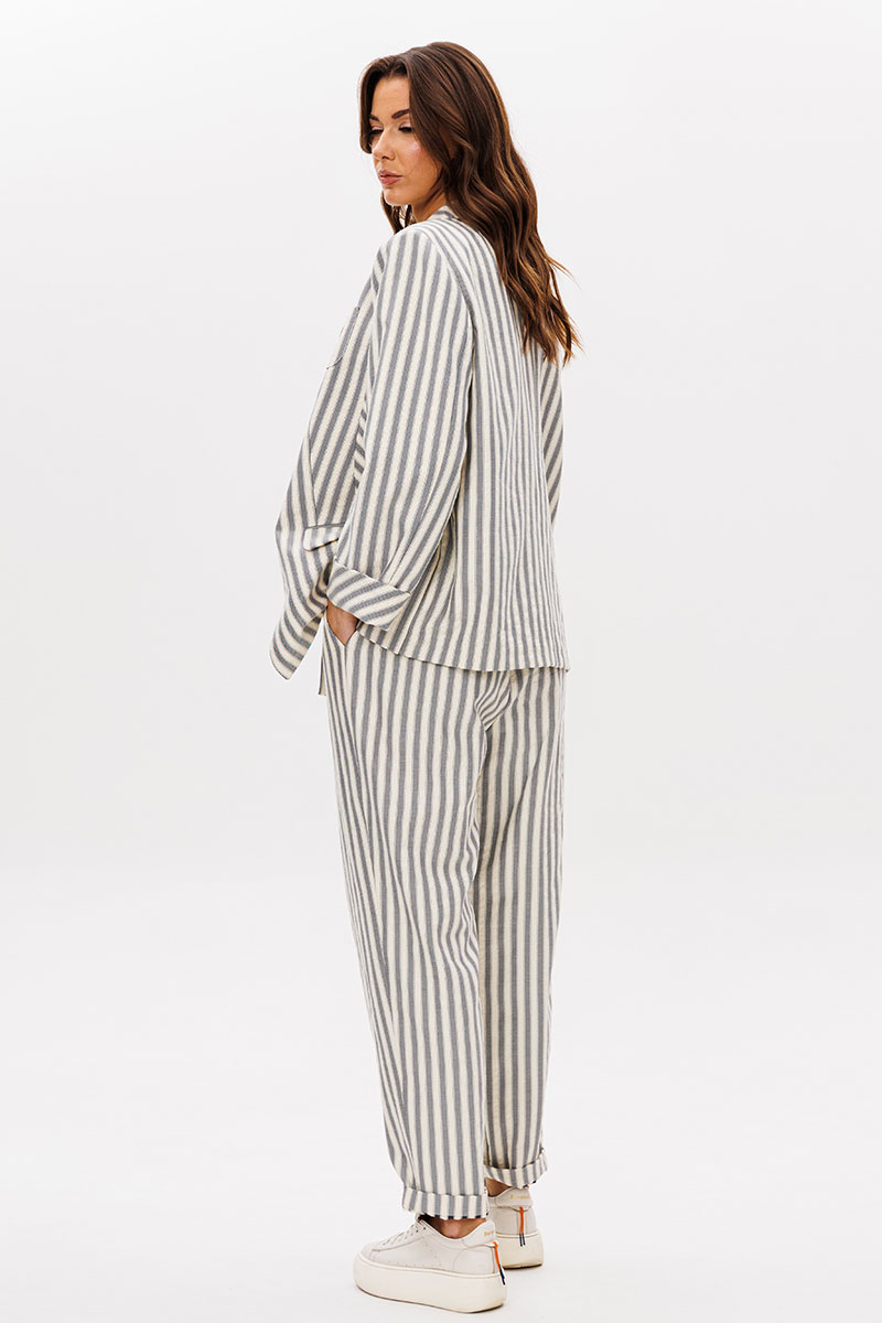 Совместимы ли официальность и комфорт, деловой или спортивный стиль? Судя по нашей модели эти противоположности отлично уживаются друг с другом. Мягкие, расслабленные брюки на резинке и свободный, упрямленный пиджак из трендовой льняной полоски - то, что подойдет вам в случае, если хочется создать комфортный образ.