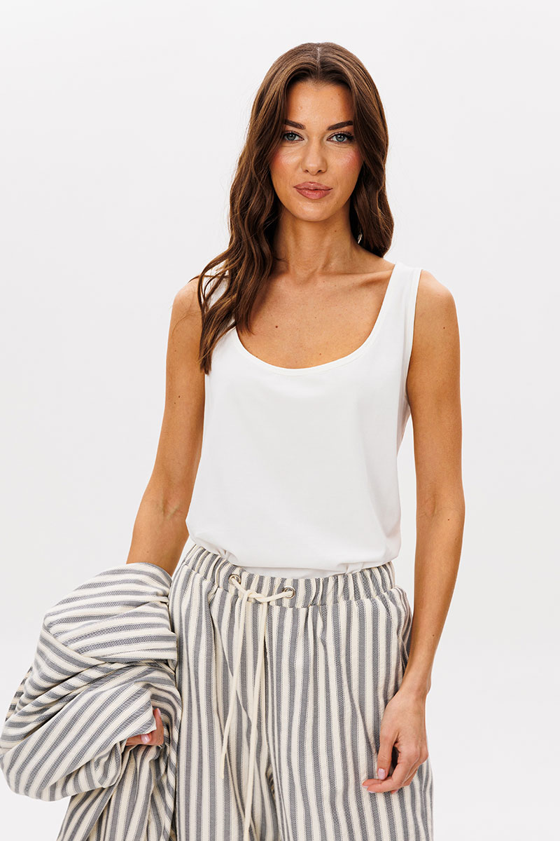 Модель дополнена майкой из хлопчатобумажного трикотажного полотна, свободного покроя, без рукавов.