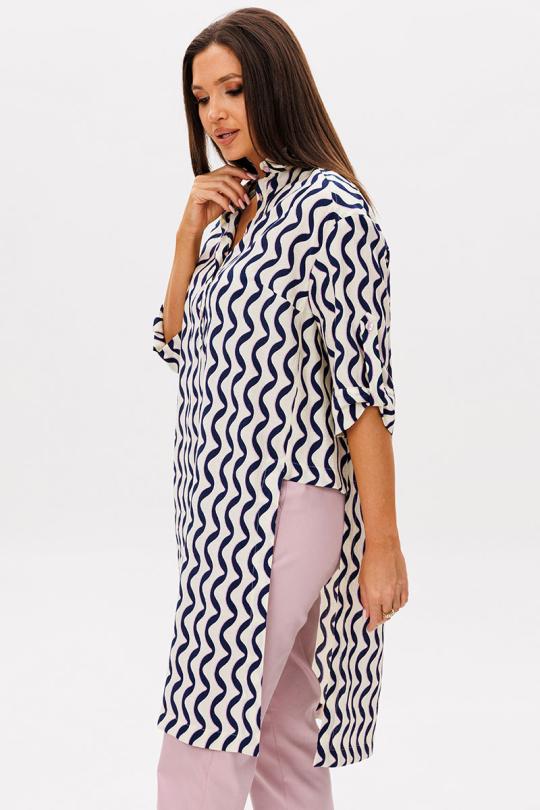 Туника выполнена из вискозного материала что делает её воздухопроницаемой, гигроскопичной. Застёжка по переду на длиной планке-«поло», воротник рубашечный на отрезной