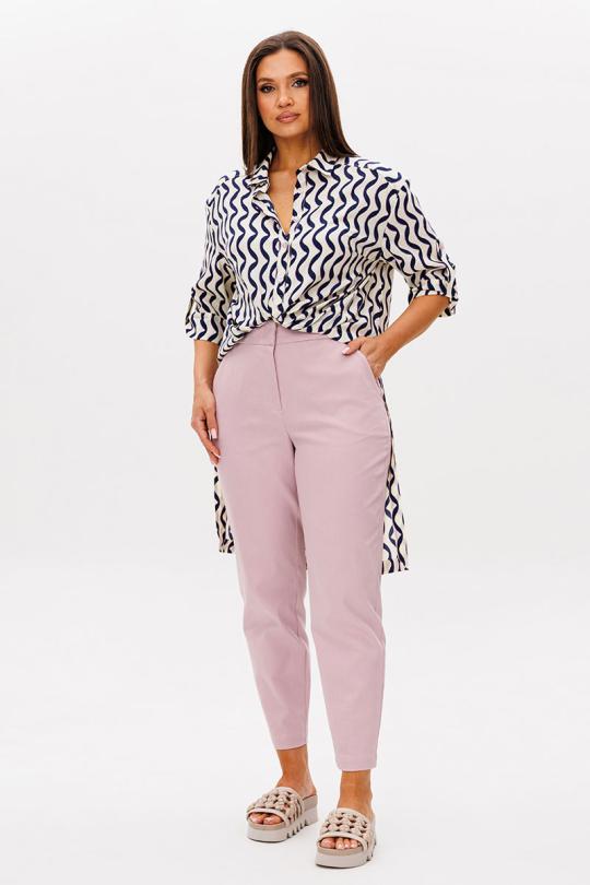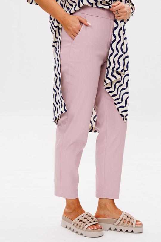 Брюки на широком приточном поясе с эластичной лентой по спинке, зауженные к линии низа. Имеют наклонные боковые карманы и имитацию кармана с листочкой на задней половинке.