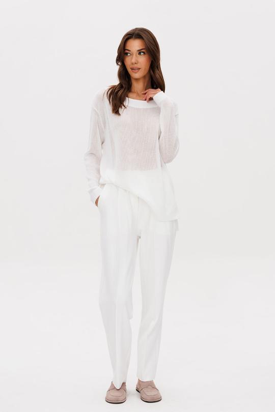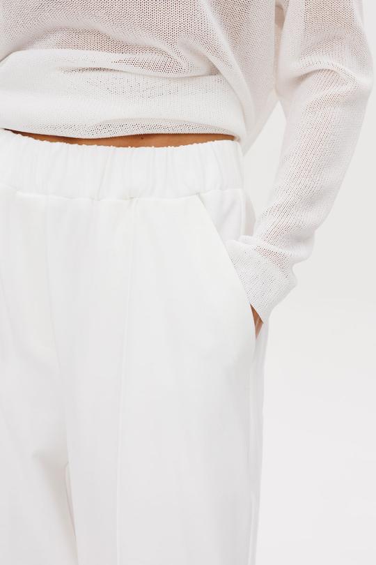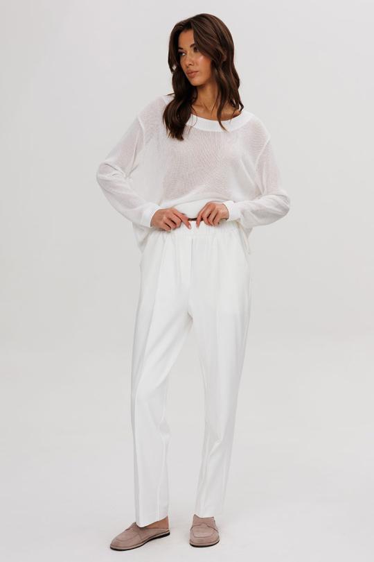 Брюки в расслабленном стиле, на притачном эластичном поясе, с наклонными боковыми карманами и защипом по центру передних половинок, визуально удлиняющих ноги. Брюки заужены к низу, из
