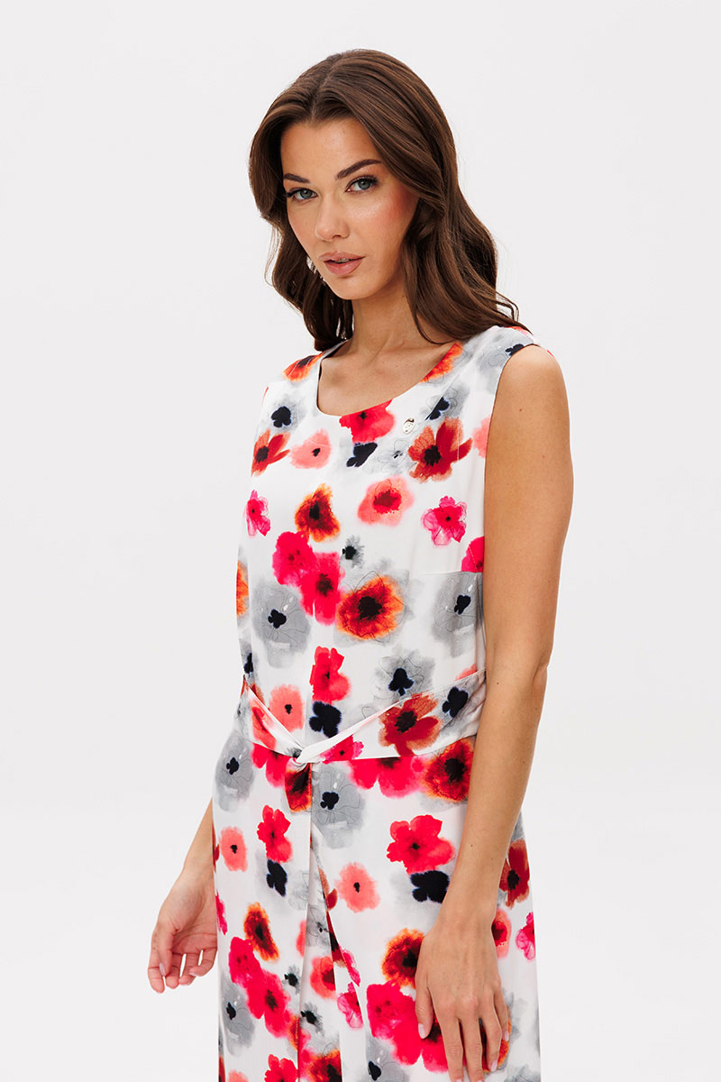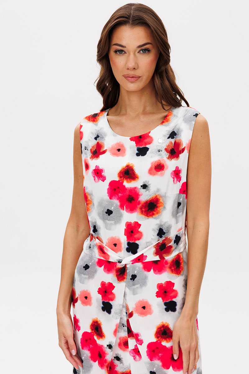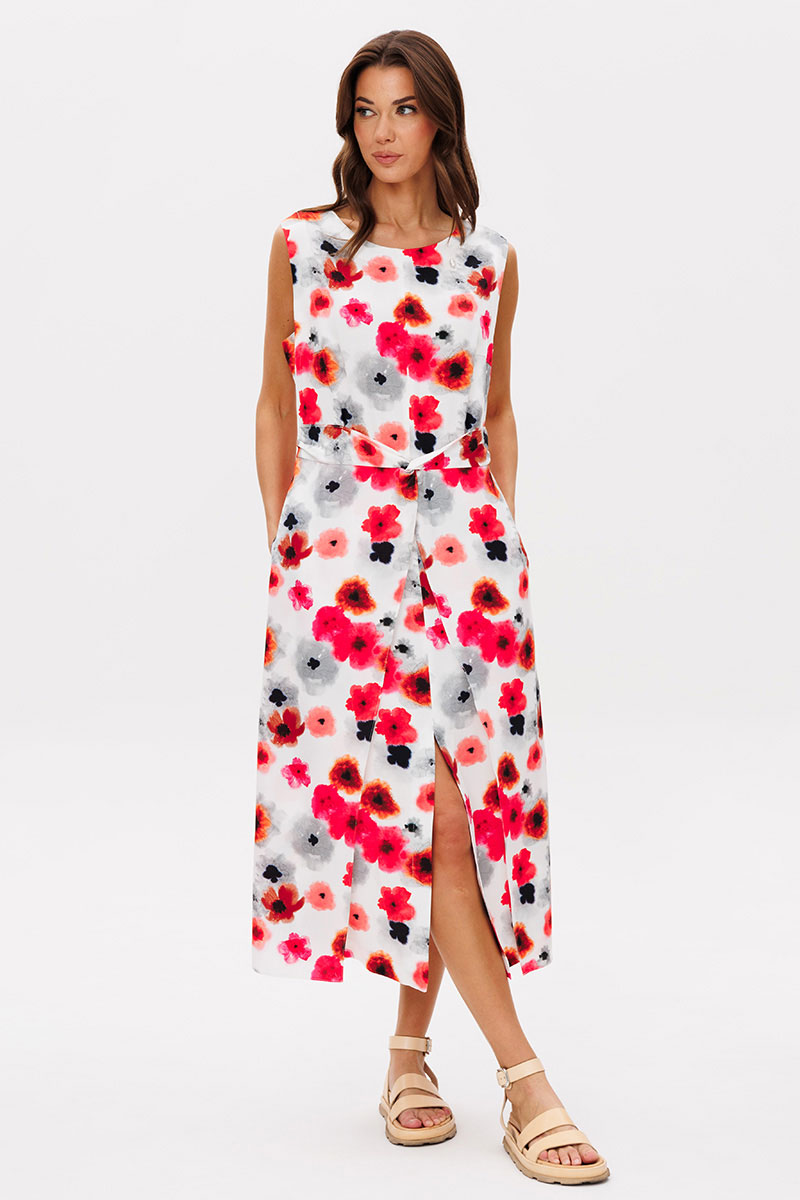 Платье из комфортного вискозного полотна, А-образного силуэта, без рукава, с эффектными отлетными деталями. Полочка с отрезным лифом с вытачкой, изящной драпировкой-поясом, и