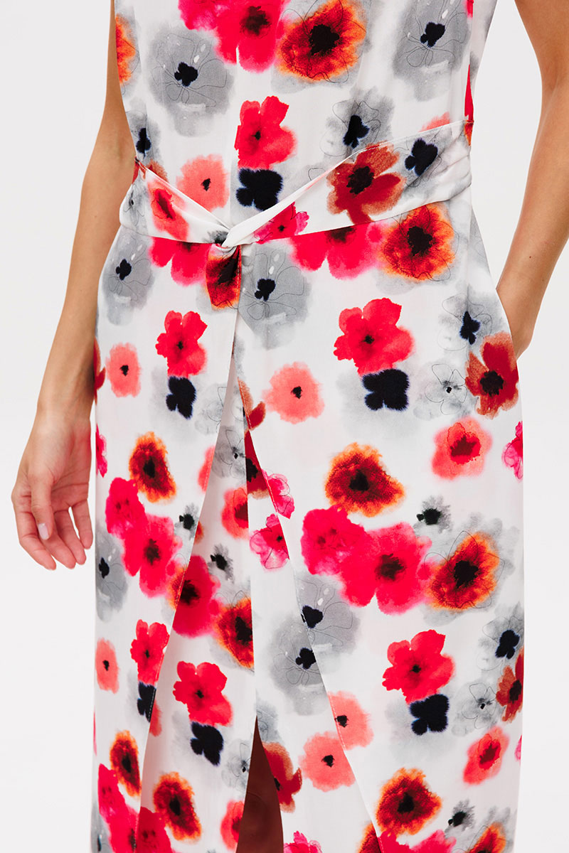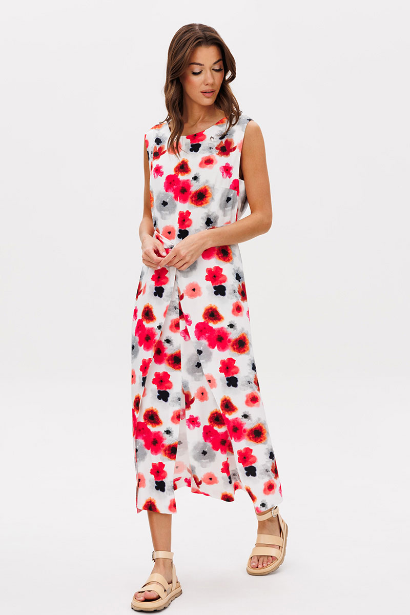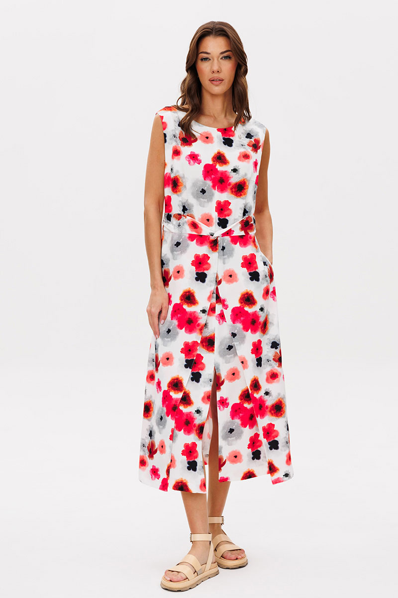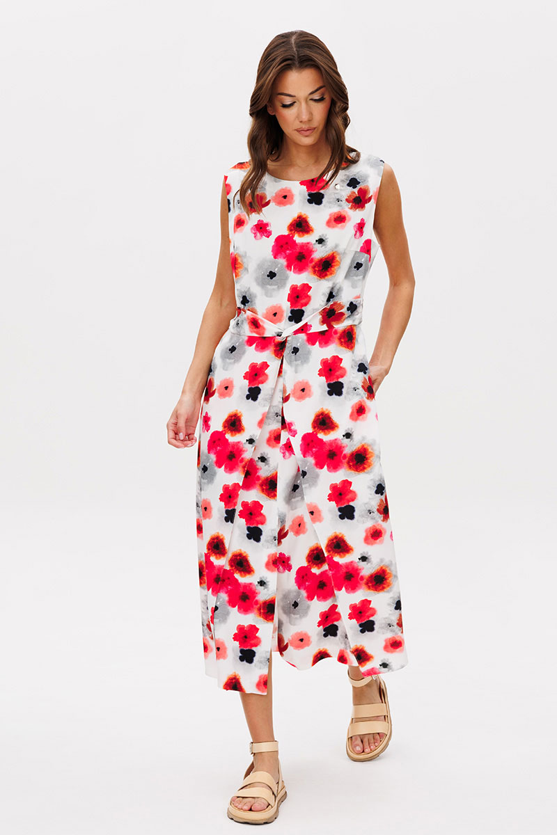 Платье из комфортного вискозного полотна, А-образного силуэта, без рукава, с эффектными отлетными деталями. Полочка с отрезным лифом с вытачкой, изящной драпировкой-поясом, и