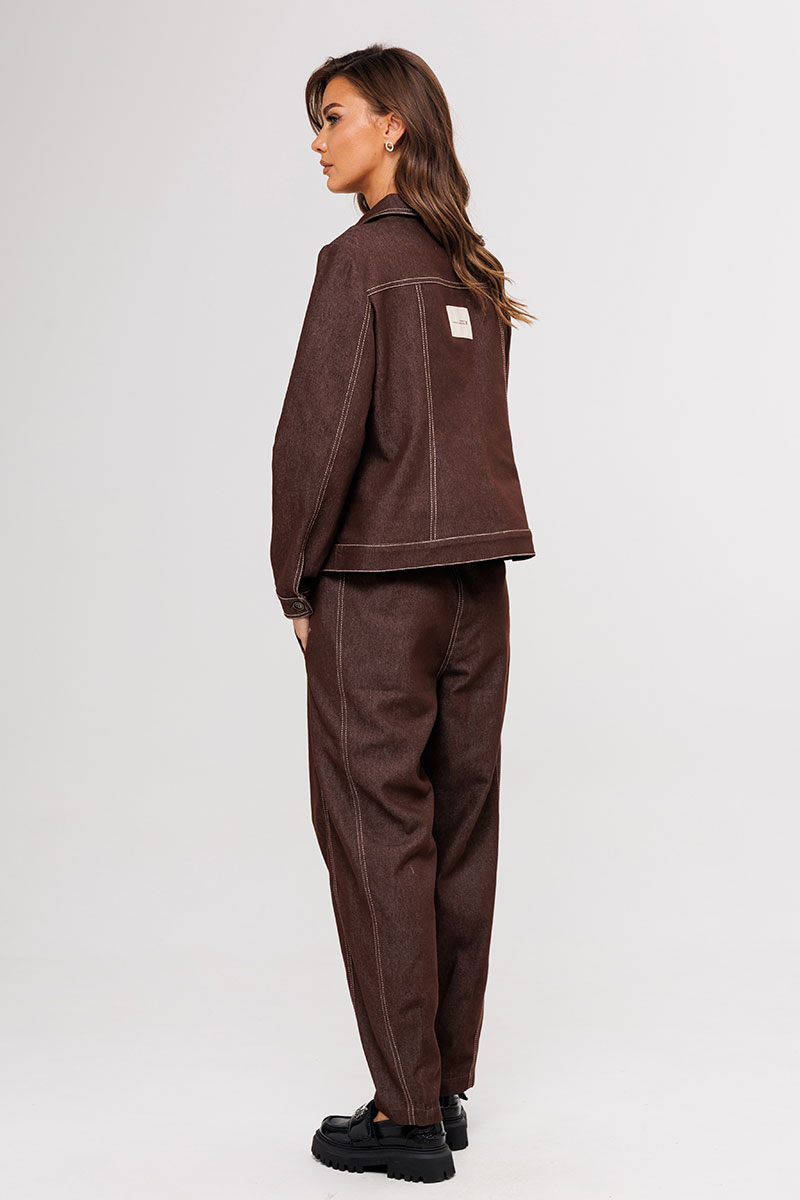 В осеннем сезоне нельзя не отметить трендовость денима. Брючный комплект, нестандартного цвета и кроя-новое прочтение казалось бы уже знакомых нам вещей. Комплект, создающий
