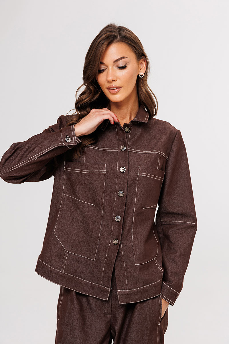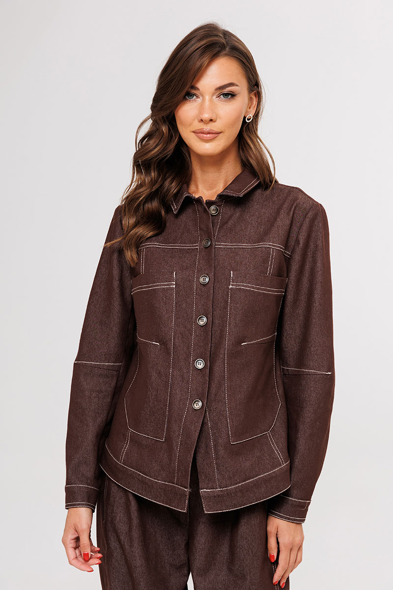 Жакет-рубашка полуприлегающего силуэта, втачного покроя с центральной фигурной застежкой на отрезной планке, втачным двухшовным рукавом на манжете и притачном поясом по низу,