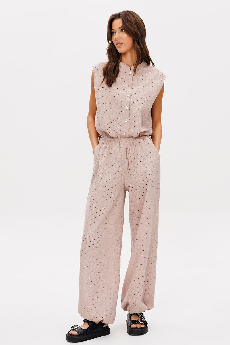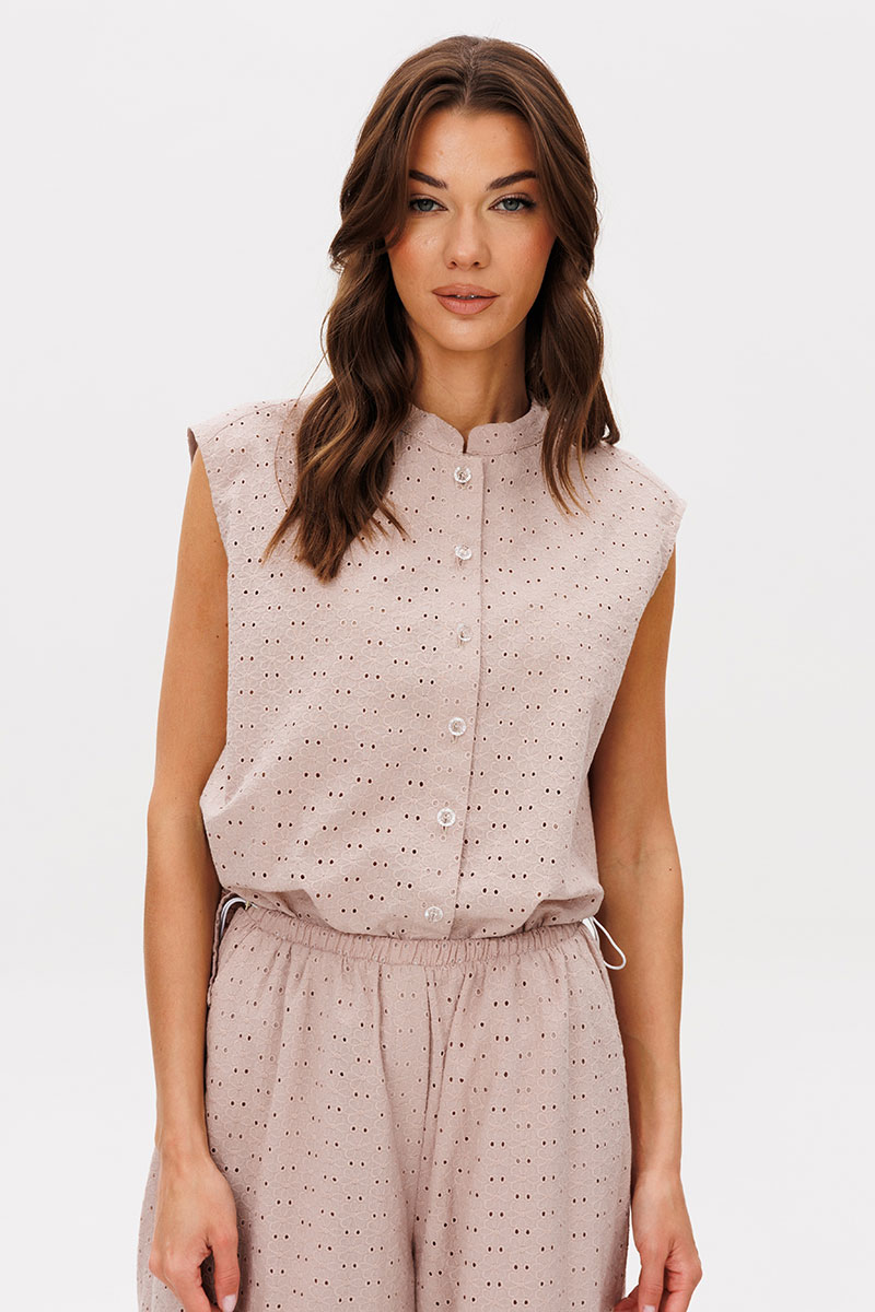 Нежный костюм из хлопкового шитья в мягком бежевом оттенке. Идеальный вариант для ваших красивых каникул. Шитье вернулось к нам в новом прочтении, таким оно еще никогда не было.