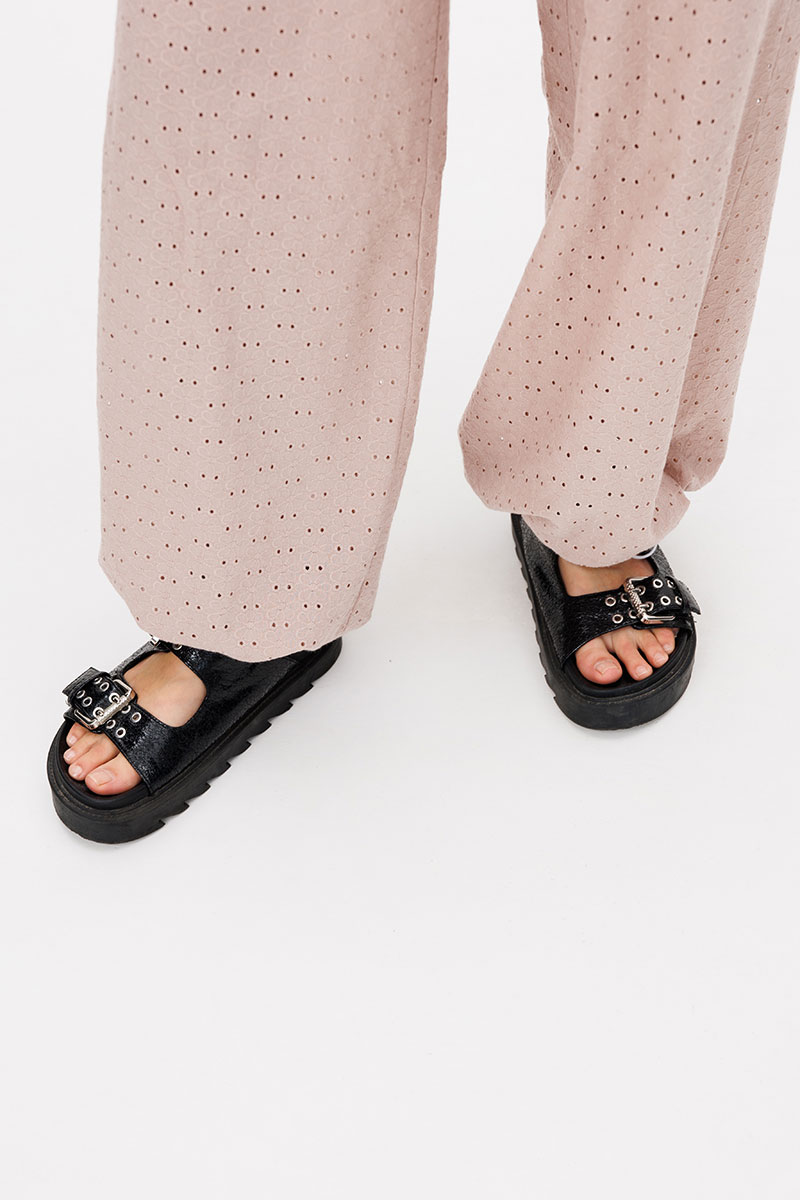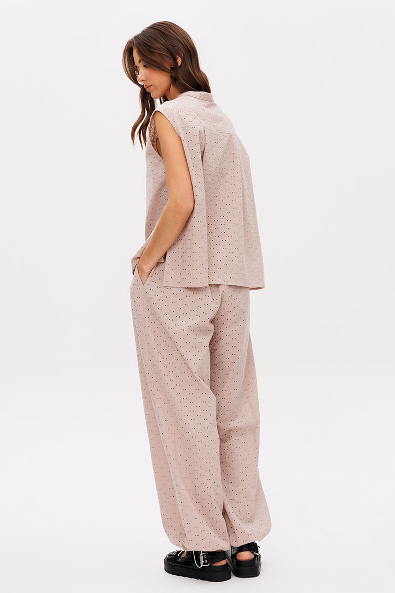 Брюки свободные, на эластичном поясе с дополнительной фиксацией эластичным шнуром, боковыми карманами и подтягивающимся низом.