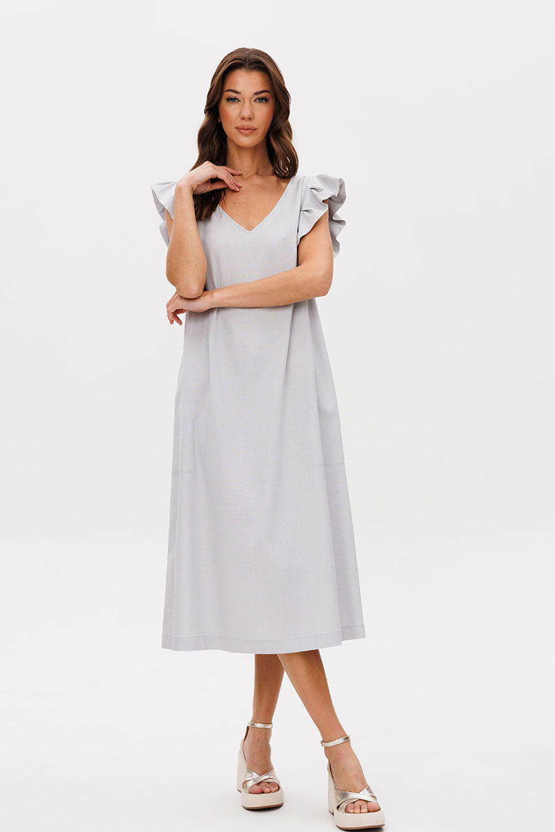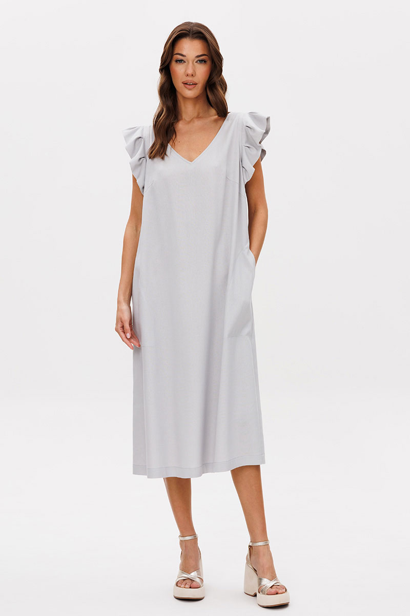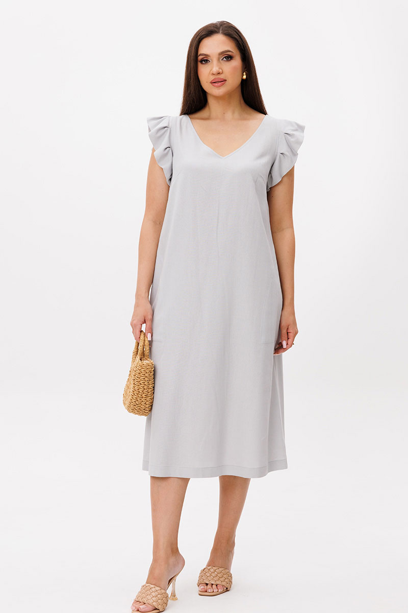 Свободный А-силуэт, изящный V-образный вырез, романтичное крылышко, комфортная длина миди. Полочка с нагрудной вытачкой и карманом в боковом шве. Спинка со средним швом, вырезом каре