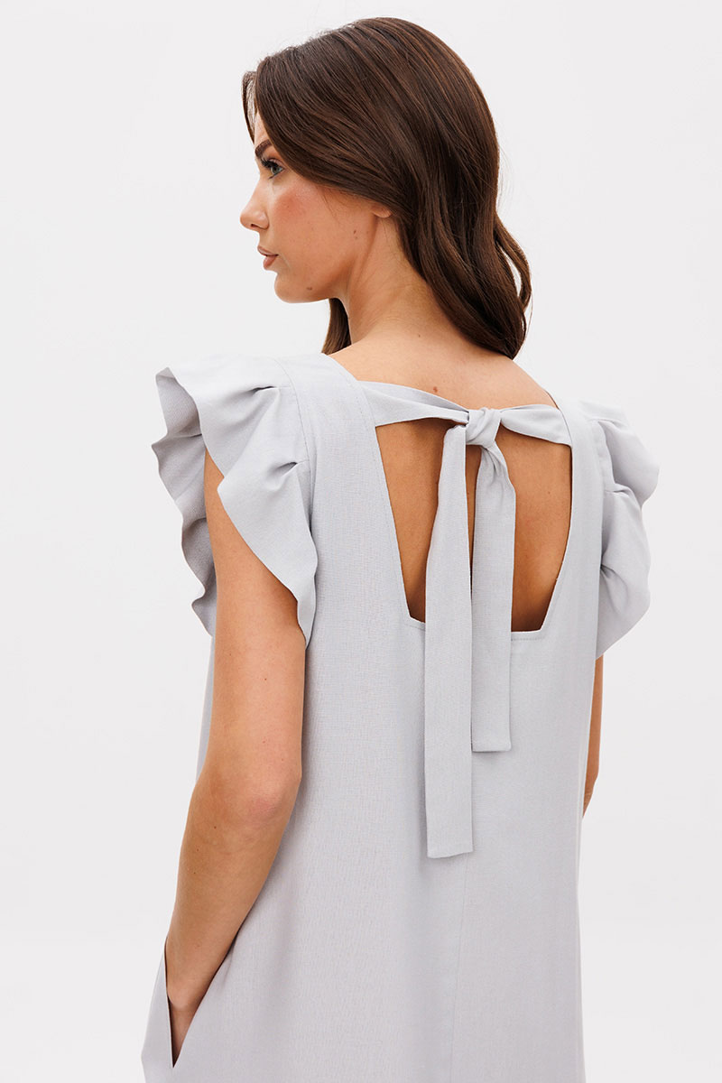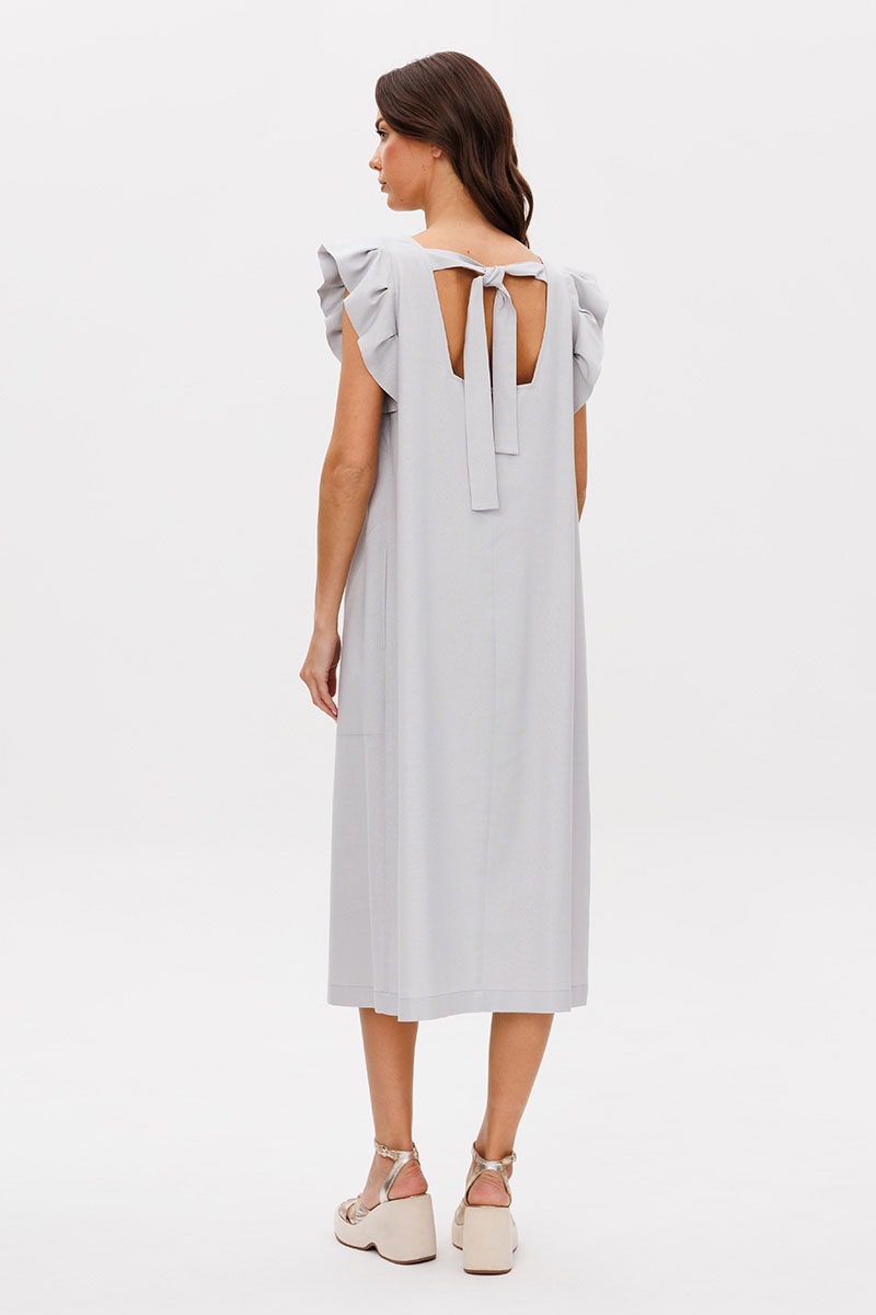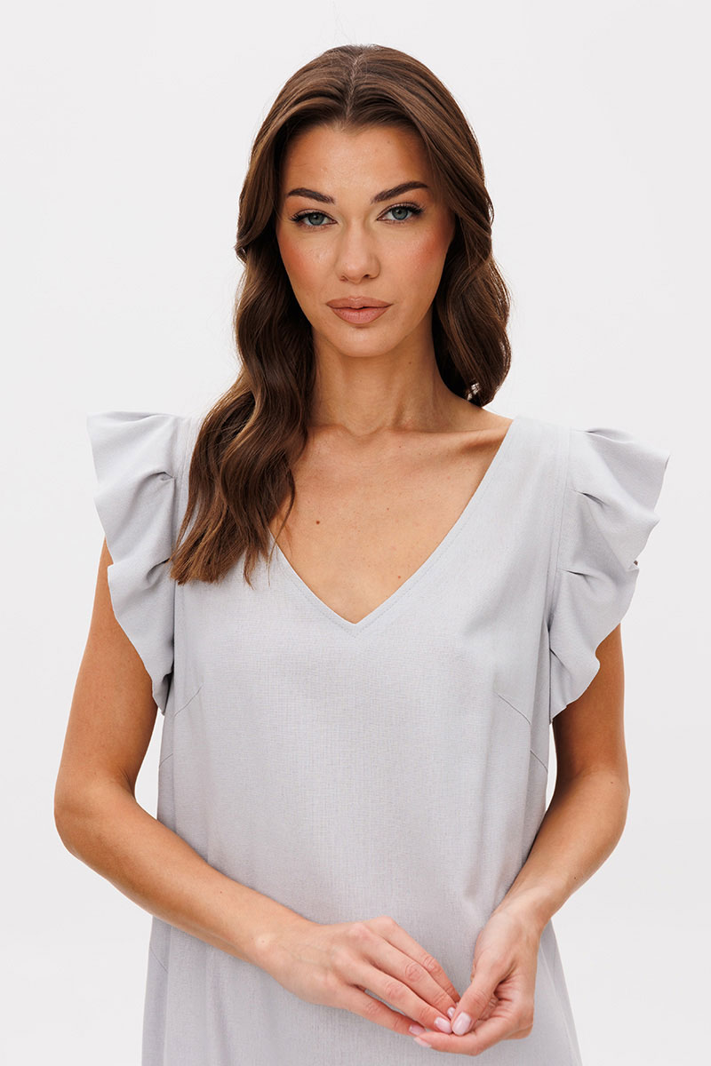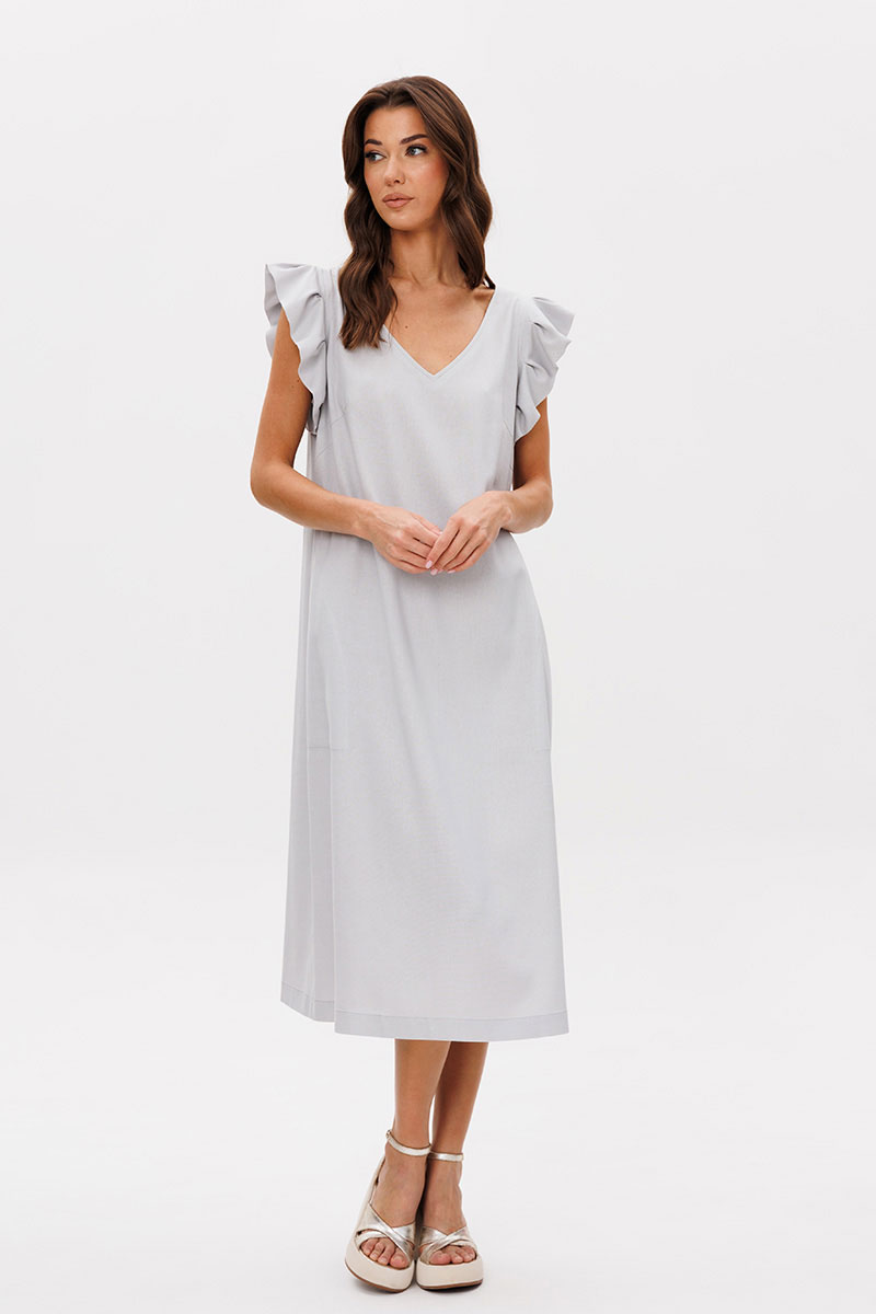 Свободный А-силуэт, изящный V-образный вырез, романтичное крылышко, комфортная длина миди. Полочка с нагрудной вытачкой и карманом в боковом шве. Спинка со средним швом, вырезом каре