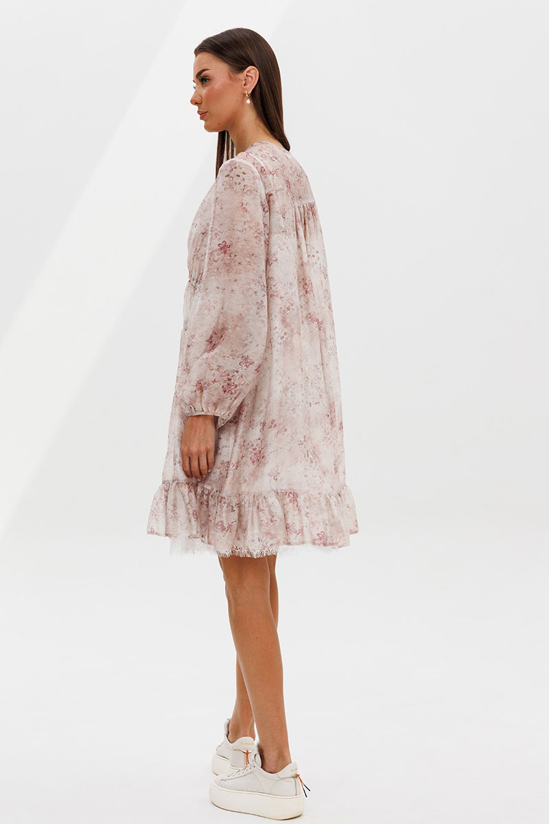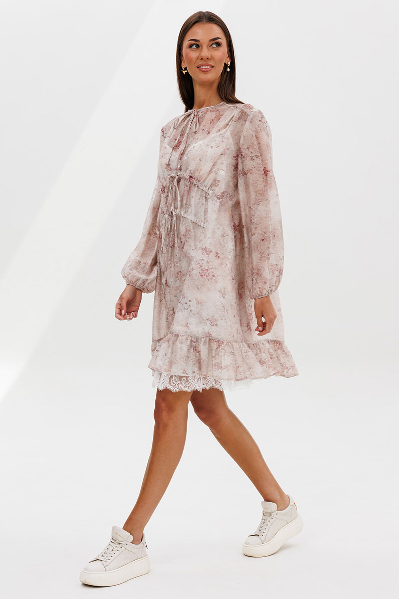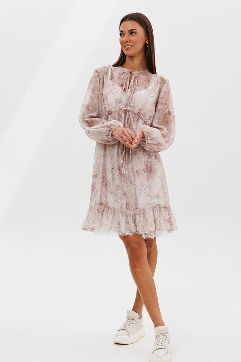 сборкой по центру. По низу платья притачной волан со сборкой. Подкладка платья из х/б батиста, на регулируемых бретелях, с притачным воланом с кружевом.