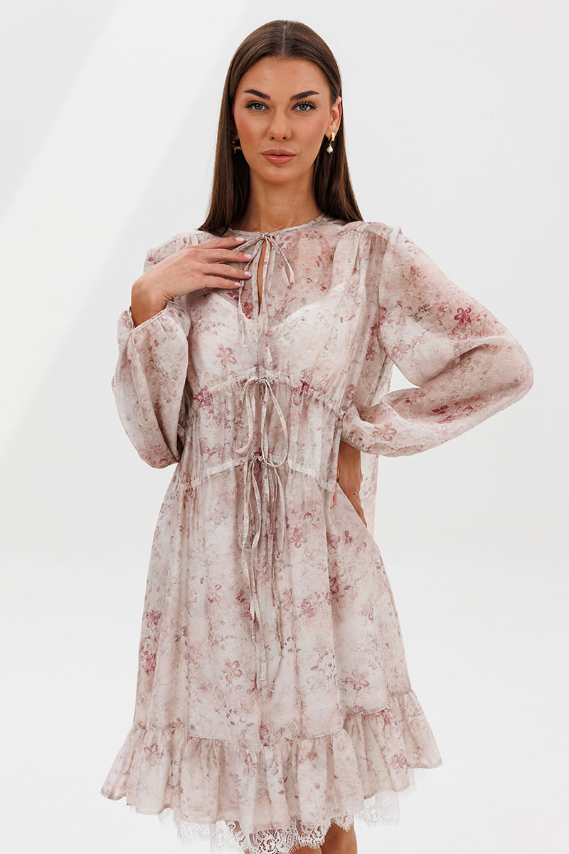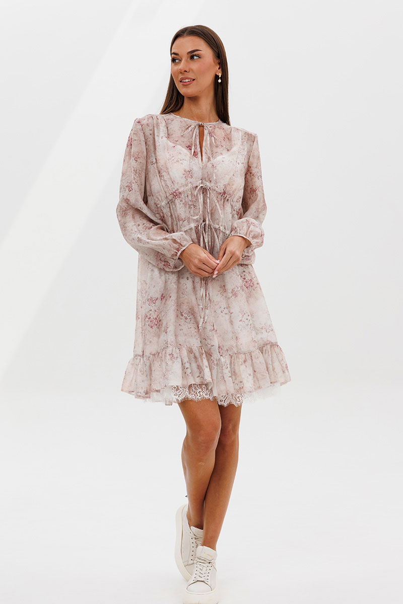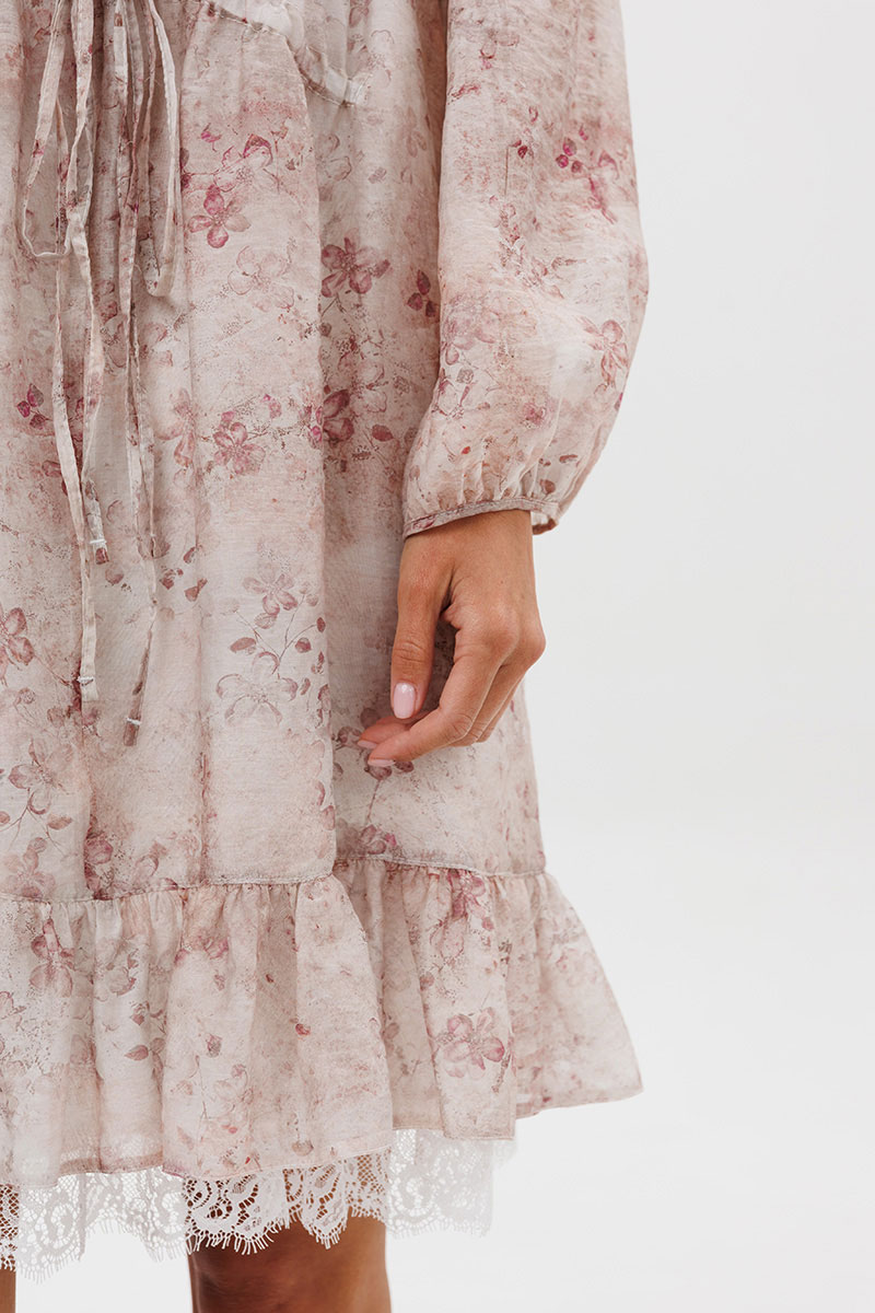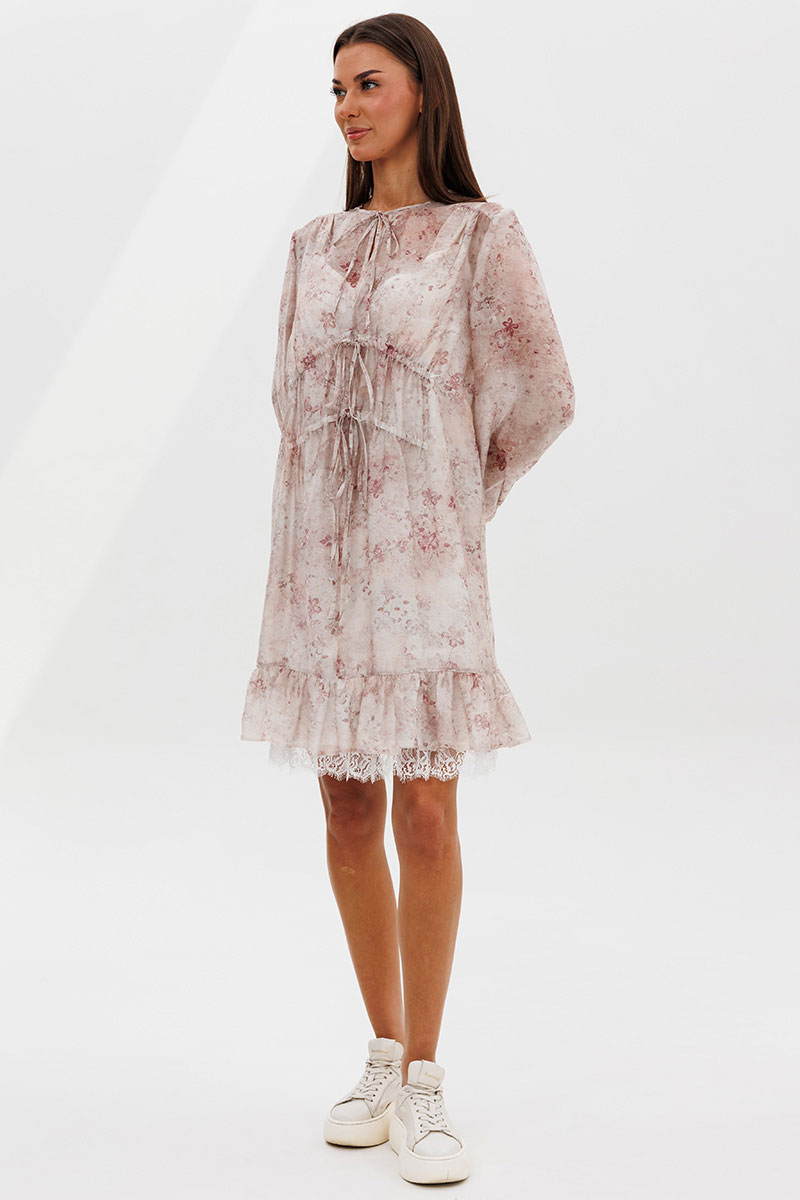 сборкой по центру. По низу платья притачной волан со сборкой. Подкладка платья из х/б батиста, на регулируемых бретелях, с притачным воланом с кружевом.