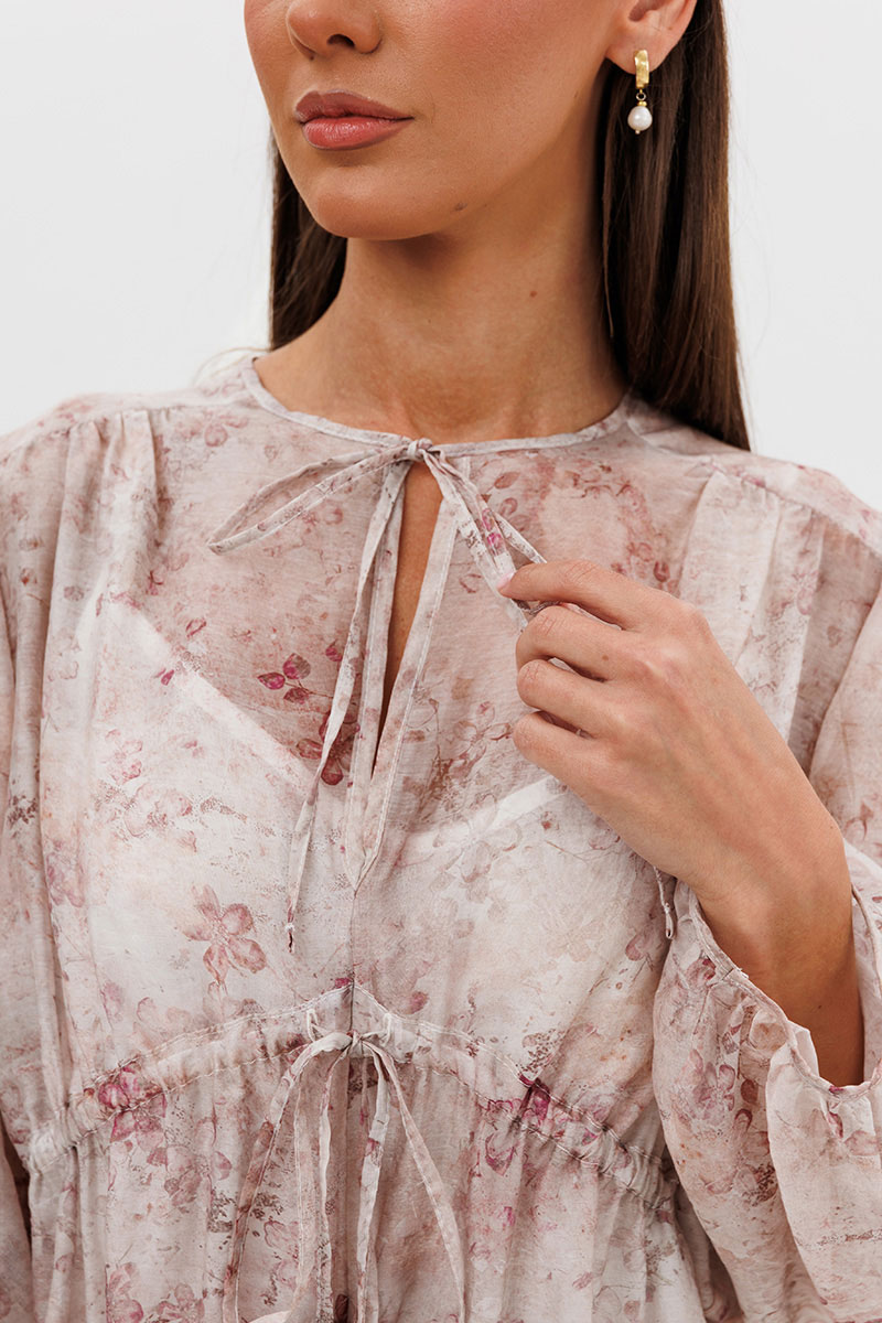 Свободный А-силуэт, втачной покрой. Полочка с ценральным швом и диагональными кулисами с завязками. Рукав со сборкой по линии низа. Спинка с отрезной кокеткой. Нижняя часть спинки со