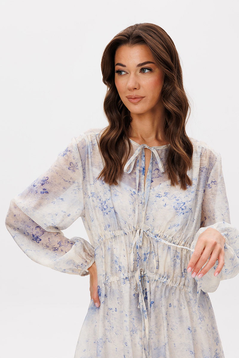 Свободный А-силуэт, втачной покрой. Полочка с ценральным швом и диагональными кулисами с завязками. Рукав со сборкой по линии низа. Спинка с отрезной кокеткой. Нижняя часть спинки со